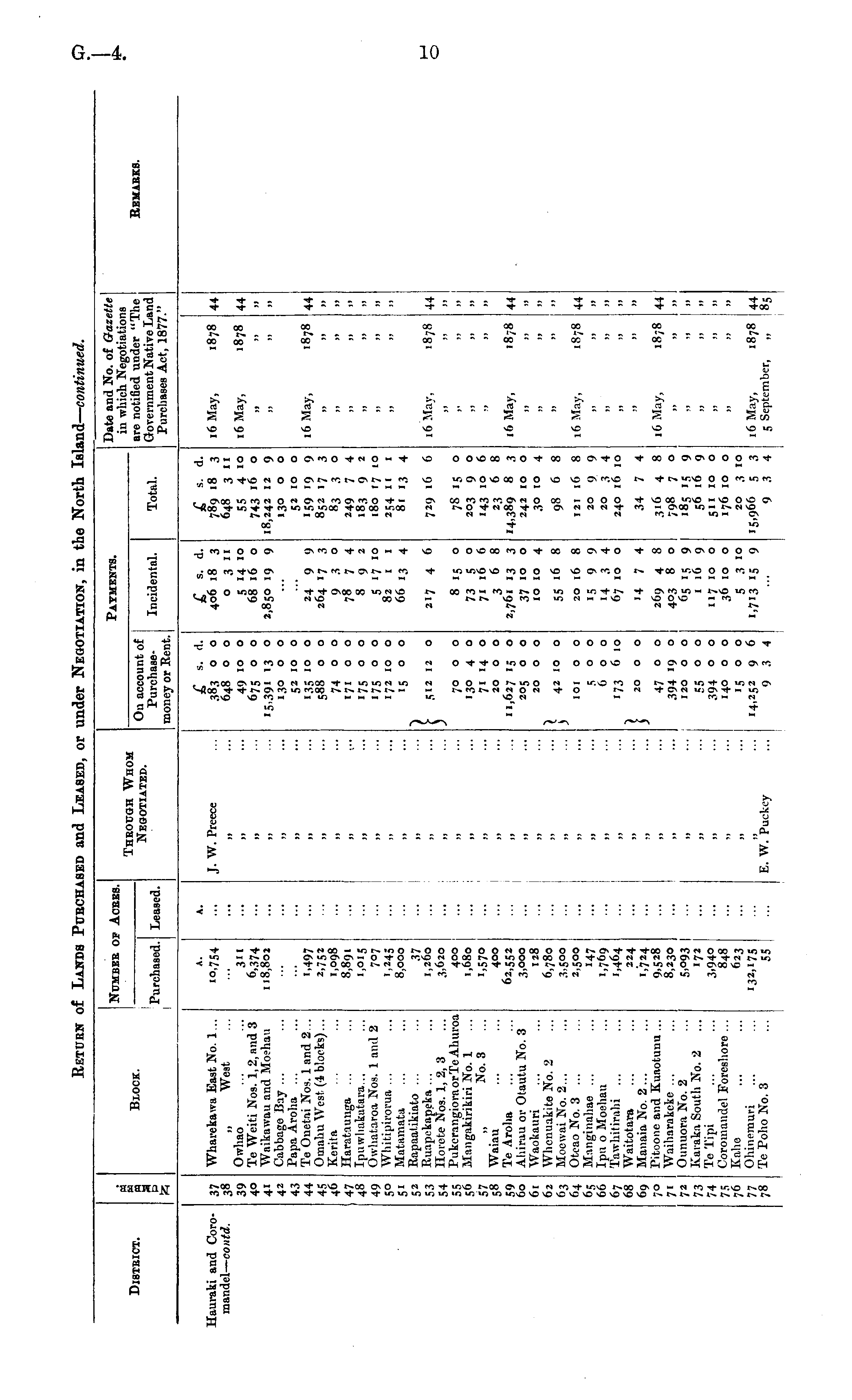 Return 0'. Lands Puec: bed and Leased, or under Negotiation, in the Nort] ,nd — continued. District. h H m Block. Number op Acres. Purchased. Leased. TnRouoK Whom Negotiated. Payments. On account of Purchase- Incidental, money or Bent. Payments. Total. Date and No. of Gaze in which Negotiation are notified under "T Government Native La Purchases Act, 1877. lie IS 'he mil Remaeks. Ifauraki and Cororaandel — contd. 39 443 4-', 4j 46 47 48 49 5° 53 54 55 57 59 60 63 64 68 69 7° 7 1 72 73 74 75 77 Wharekawa East No. 1 .. West Owliao TeWeiti Nos. 1,2, end 3 Waikaivau and Ifoehau Cabbago Hay ... Papa Aroha. ... Te Onetai No*. 1 and 2... Omaliu Weet (1 blocks)... Kerita Harataunga ... Ipmvhakatara... Owhataroa Xos. 1 and 2 Whttipiroi'ua, ... Matamatii Itapaulikiolo ... Ruapekapeka ... Horote Nos. 1, 2, 3 PukerangiovaorTeAhuroa ICangafarikiri Ho. 1 No. 3 Waiau Te Arolia Ahirau or Olautu No. 3 Waokauri Wbenuakito No. 2 Mocwni No. 2... Otcao No. 3 ... Manginahae ... Ipu o Moehau Tawhitirahi ... Manaia No. 2... Pitoone and Kuaotuuu ... Waiharakeke ... Ounuora No. 2 Karaka South No. 2 TeTipi Coroinandel Foreshore .. Kaho Ohincmuri Te Polio No. 3 A. •0.754 3" 6.374 118,802 '.497 1,098 8,891 7°7 8,ooo A. J. W. Preece H II n ii 383 o o 648 o o 49 10 o 675 0 o 15,391 13 o 130 o o 5210 o 135 10 o 588 o o 74 0 o 171 o o '75 ° ° 172 10 o 1500 406 18 3 o 311 5 H IO 68 16 o 2,850 19 9 24 9 9 264 17 3 9 3 o 78 7 4 8 9 2 5 17 10 82 1 1 66 13 4 789 18 3 648 3 11 SS 4 10 743 16 o 18,242 12 9 130 o o 52 10 o '59 '9 9 852 17 3 83 3 o 249 7 4 183 9 2 180 17 10 »S4 " ' 81 13 4 16 May, 16 May, M )) 16 May, 1878 1878 1878 44 44 ,, M ii 4+ >i J» u ii || 11 )» il )» II >j H j) n it 37 1,260 3,620 400 1,680 400 3,000 128 6,780 3,5°° 2,500 •47 1,769 1,464 224 1,724 8,230 5.093 172 3.94° 848 623 132.175 55 >i } 512 12 o 217 4 6 729 1 (> f> 16 May, 1878 •44 8 15 o 73 5 o 71 16 6 368 2,761 13 3 37 10 o 10 10 4 78 15 o 203 y o 143 10 6 2^ 6 8 14,389 8 3 242 10 o 3° i° 4 II 11 ,» 70 o o 130 4 o 71 14 o 20 o o 11,627 '5 ° 205 o o 20 o o >» )> it M 1 f> May, 1878 44 • , )» M II >> I) If } ) 42 10 o 55 "6 8 98 6 8 )) M II 101 0 o 20 16 8 121 16 8 16 May, 1S78 44 VI 5 o o () O O 173 6 10 '5 9 9 M 3 4 67 10 o 20 9 9 20 3 4 240 16 10 >) II || II )) || n } 1 20 o o I ■4 7 4 34 7 4 :j II }} m 269 4 8 403 8 o 65 '5 9 1169 117 10 o 36 10 o 5 3 10 >.7'3 '5 9 316 4 8 798 7 o "85 l| 9 S6 »6 9 511 10 o 176 10 o 20 3 10 9 3 4 16 May, 1878 47 o o 394 19 ° 120 o o n 44 }} 11 || a n ;5 ° ° 394 ° o 140 o o Ij o o 14,252 9 6 9 3 4 fj j) i) j> jj ft it E. W.'puckey 16 May, 5 September, 1878 44 85