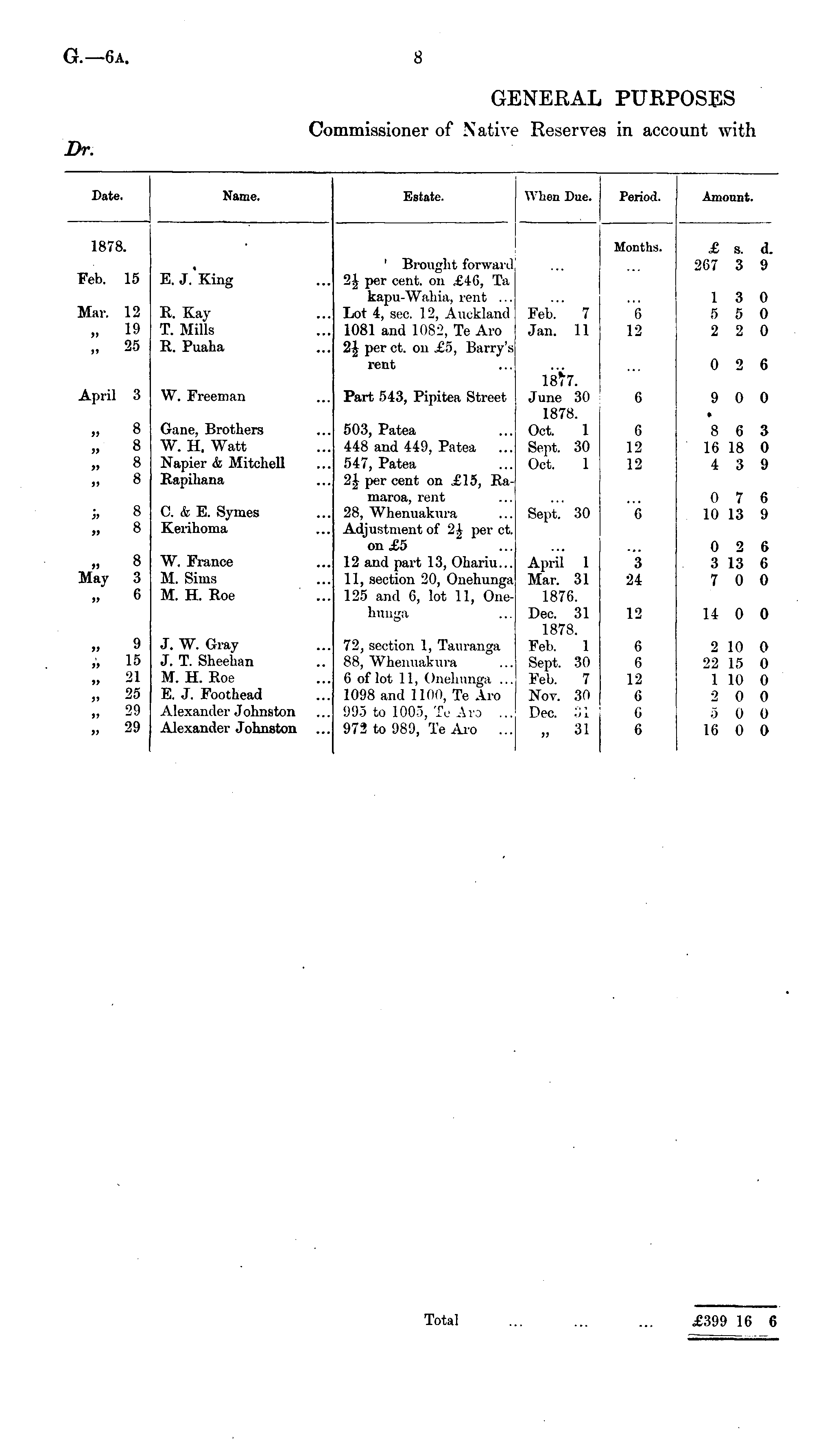Commissioner of Native Reserve in ace 'Uiit with Date. Name. Estate. When Due. Period. Amount. 1878. Fel). 15 Mar. 12 „ 19 „ 25 '8. 15 12 19 25 » E. J.'King ! R. Kay I T. Mills > R. Puaha ' Brought forward 2J per cent, on ,£4G, Ta kapu-Wahia, rent ... Lot 4, sec. 12, Auckland Fel 1081 and 1<>Si>, TeAro Jar 2| per ct. on .£o, Barry's rent l Feb. 7 Jan. 11 b. n. : ia^7 7 11 Months. (i 12 £ s. 267 3 1 3 5 5 2 2 0 2 d. 9 0 0 0 6 April 3 „ 8 » 8 „ 8 „ 8 1 1 3 5 W. Freeman 1 Part 543, Pipitea Street Jui 1 1877. June 30 1878. Oct. 1 Sept. 30 Oct. 1 I6i I. ne I L87«. 80 !. 6 9 0 | 0 h 8 „ 8 8 8 8 8 8 8 8 3 6 i Gane, Brothers I W. H. Watt I Napier & Mitchell > Rapihana 1 C. & E. Symes I Kerihoma i W. France 5 M. Sims 5 M. H. Roe 503, Patea ... Oct 448 and 449, Patea ... Ser, 547, Patea ... Oct 2£ per cent on £15, Ramaroa, rent 28, Whenuakuni ... Ser Adjustment of 2.V per ft. on £5 12 and part 13, Ohariu... Ap 11, section 20, Onehunga Ma 125 and 6, lot 11, One- 1 huuga ... Dec 1 Sept. 30 t. pt. i t. pt. ! aril ir. I 1876. :c. : I 878 1 30 1 30 1 31 31 i 6 12 12 G 3 24 12 8 6 16 18 4 3 0 7 10 13 0 2 3 13 7 0 14 0 3 0 9 6 9 6 6 0 0 „ 8 May 3 „ 6 9 „ 15 „ 21 „ 25 „ 29 „ 29 9 15 21 25 29 29 ) J. W. Gray ) J. T. Sheehan L M. H. Roe ) E. J. Foothead ) Alexander Johnston ) Alexander Johnston l 72, section 1, T&uranga Fel 88, Whenuakui-a ... Sei: 6 of lot 11, Onehunga ... Fel 1098 and 1100, Te Aro No 995 to 1005, TeAro ... De< 972 to 989, TeAro ... „ April 1 Mar. 31 1876. Dec. 31 1878. Feb. 1 Sept. 30 Feb. 7 Nov. 30 Dec. :;i „ 31 IOIO. b. pt. : b. >T. : >c. 1 30 7 30 •> 1 31 6 6 12 G G 6 2 10 22 15 1 10 2 0 .3 0 16 0 0 0 0 0 0 0 Total £399 16 6