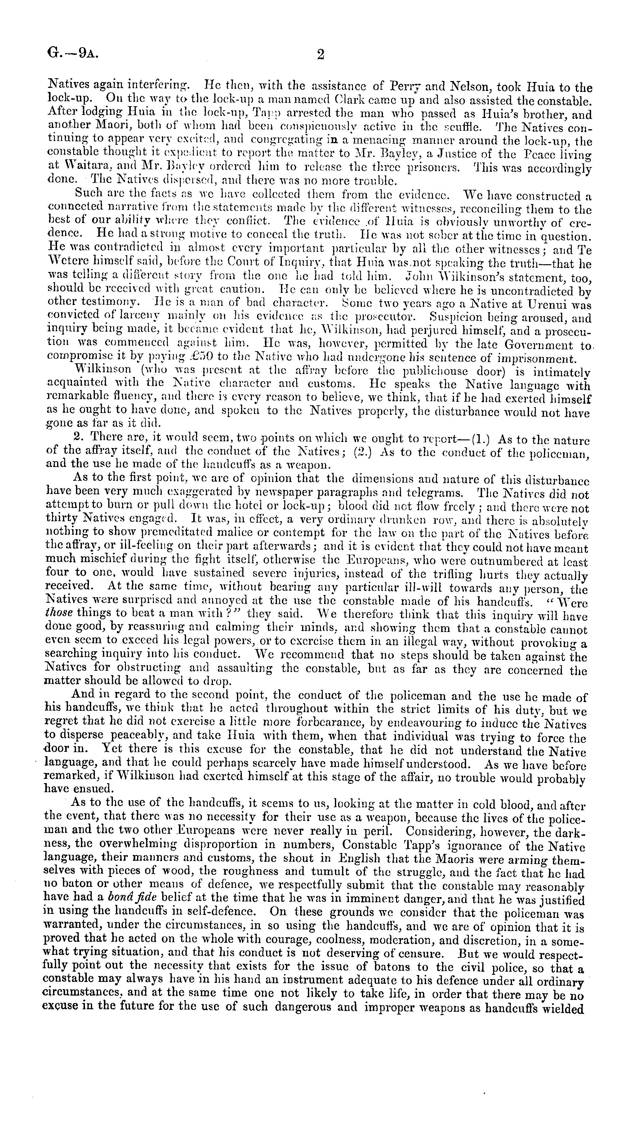 Natives again interfering. He then, with the assistance of Perry and Nelson, took Huia to the lock-up. On the way to the lock-up a man named ("lark came up and also assisted the constable. After lodging Huia in the lock-up, Tapp arrested the man who passed as Iluia's brother, and another Maori, both of whom had been conspicuously active in the scuffle. The Natives continuing to appear vcrv excited, and congregating in a "menacing manner around the lock-up, the constable thought it expedient to report the matter to Mr. Bayley, a Justice of the Peace living at Waitara, and Mr. Bayley ordered him to release the three prisoners. This was accordingly done. The Natives dispersed, and there was no more trouble. Such are the facts ns we. have collected them from the evidence. We have constructed a connected narrative from the statements made by the different witnesses, reconciling them to the best of our ability where they conflict. The evidence .of Huia is obviously unworthy of credence. He had a strong motive to conceal the truth. He was not sober at the time in question. He was contradicted in almost every important particular by all the other witnesses; and Te Wetere himself said, before the Court of Inquiry, that Huia was.not speaking the truth—that he was telling a different story from the one he had told him. John Wilkinson's statement, too, should be received with great caution. He can only be believed where he is uncontradietcd by other testimony. He is a man of bad character. Some two years ago a Native at Urenui was convicted of larceny mainly on his evidence as the prosecutor. Suspicion being aroused, and inquiry being made, it became evident that he, Wilkinson, had perjured himself, and a prosecution was commenced against him. He was, however, permitted by the late Government to. compromise it by paying £~>o to the Native who had undergone his sentence of imprisonment. Wilkinson (who was present at the affray before the publiehouse door) is intimately acquainted with the Native character and customs. He speaks the Native language with remarkable fluency, and there is every reason to believe, we think, that if he had exertediiimself as he ought to have done, and spoken to the Natives properly, the disturbance would not have gone as far as it did. 2. There are, it would seem, two points on which we ought to report—(l.) As to the nature of the affray itself, and the conduct of the Natives; (2.) As to the' conduct of the policeman, and the use he made of the- handcuffs as a weapon. As to the first point, we are of opinion that the dimensions and nature of this disturbance have been very much exaggerated by newspaper paragraphs and telegrams. The Natives did not attempt to burn or pull down the hotel or lock-up; blood did not flow freely ; and there were not thirty Natives engaged. It was, in effect, a very ordinary drunken row, and there is absolutely nothing to show premeditated malice or contempt for the law on the part of the Natives before the affray, or ill-feeling on their part afterwards; and it is evident that'they could not have meant much mischief during the fight itself, otherwise the Europeans, who were" outnumbered at least four to one, would have sustained severe injuries, instead of the trifling hurts they actually received. At the same time, without bearing any particular ill-will towards any person, the Natives were; surprised and annoyed at the use the constable made of his handcuffs. "Were those, things to beat a man with ?" they said. We therefore think that this inquiry will have done good, by reassuring and calming their minds, and showing them that a constable cannot even seem to exceed his legal powers, or to exercise them in an illegal way, without provoking a searching inquiry into his conduct. We recommend that no steps should be taken against the Natives for obstructing and assaulting the constable, but as far as they are concerned the matter should be allowed to drop. And in regard to the second point, the conduct of the policeman and the use he made of his handcuffs, we think that, he acted throughout within the strict limits of his duty, but we regret that he did not exercise a little more forbearance, by endeavouring to induce the Natives to disperse peaceably, and take Huia with them, when that individual was trying to force the door in. Yet there is this excuse for the constable, that he did not understand the Native language, and that he could perhaps scarcely have made himself understood. As we have before remarked, if Wilkinson had exerted himself at this stage of the affair, no trouble would probably have ensued. As to the use of the handcuffs, it seems to us, looking at the matter in cold blood, and after the event, that there was no necessity for their use as a weapon, because the lives of the policeman and the two other Europeans were never really in peril. Considering, however, the darkness, the overwhelming disproportion in numbers, Constable Tapp's ignorance of the Native language, their manners and customs, the shout in English that the Maoris were arming themselves with pieces of wood, the roughness and tumult of the struggle, and the fact that he had no baton or other means of defence, we respectfully submit that the constable may reasonably have had a bond fide belief at the time that he was in imminent danger, and that he was justified in using the handcuffs in self-defence. On these grounds we consider that the policeman was warranted, under the circumstances, in so using the handcuffs, and we are of opinion that it is proved that he acted on the whole with courage, coolness, moderation, and discretion, in a somewhat trying situation, and that his conduct is not deserving of censure. But we would respectfully point out the necessity that exists for the issue of batons to the civil police, so that a constable may always have in his hand an instrument, adequate to his defence under all ordinary circumstances, and at the same time one 