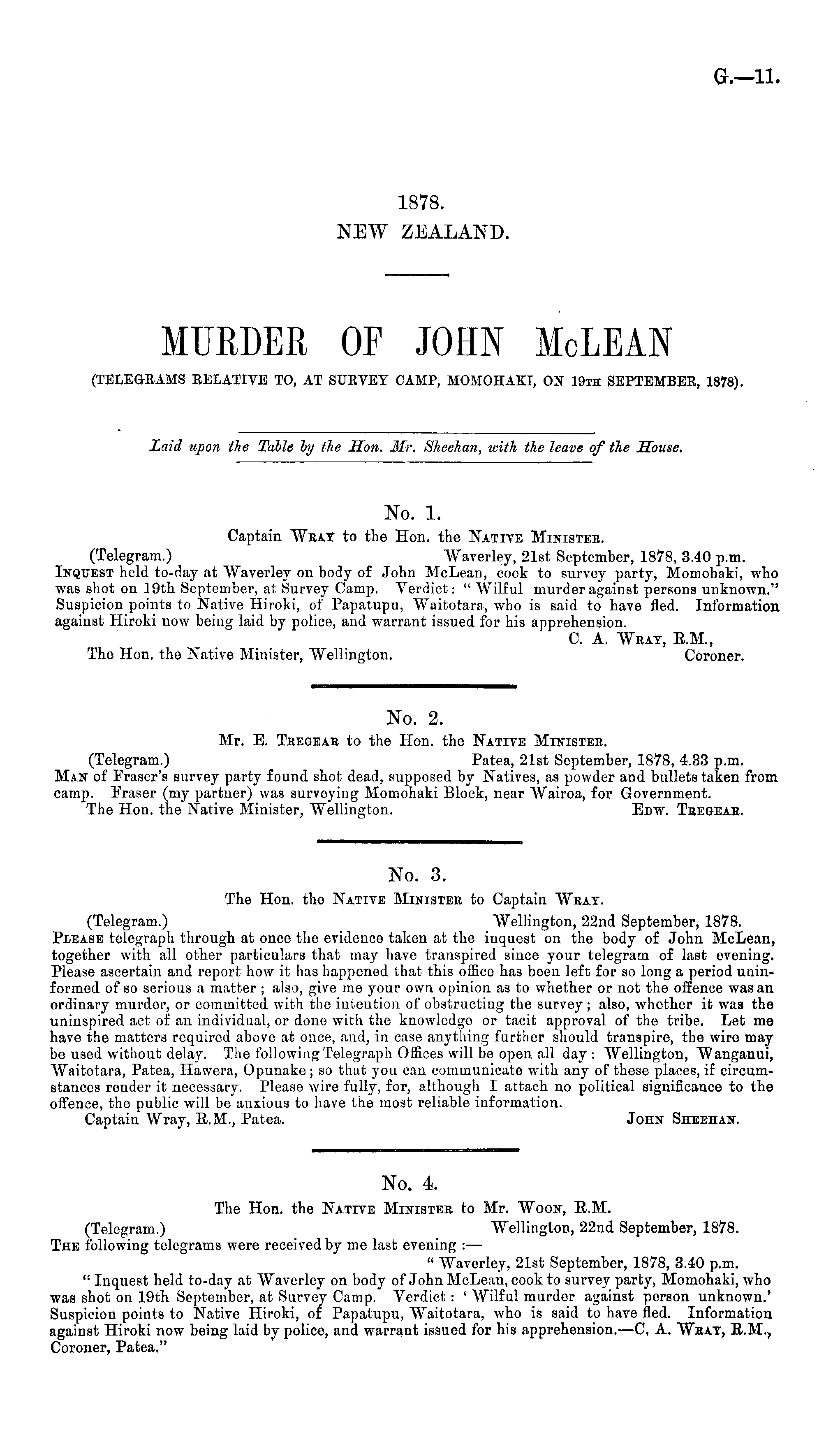No. 3. The Hon. the Native Minister to Captain Wrat. (Telegram.) Wellington, 22nd September, 1878. PiEASE telegraph through at once the evidence taken at the inquest on the body of John McLean, together with all other particulars that may have transpired since your telegram of last evening. Please ascertain and report how it has happened that this office has been left for so long a period uninformed of so serious a matter; also, give me your own opinion as to whether or not the offence was an ordinary murder, or committed with the intention of obstructing the survey ; also, whether it was the uninspired act of an individual, or done with the knowledge or tacit approval of the tribe. Let me have the matters required above at once, and, in case anything further should transpire, the wire may be used without delay. The following Telegraph Offices will be open all day: Wellington, Wanganui, Waitotara, Patea, Hawera, Opunake; so that you can communicate with any of these places, if circumstances render it necessary. Please wire fully, for, although I attach no political significance to the offence, the public will be anxious to have the most reliable information. Captain Wray, E.M., Patea. John Sheehan.