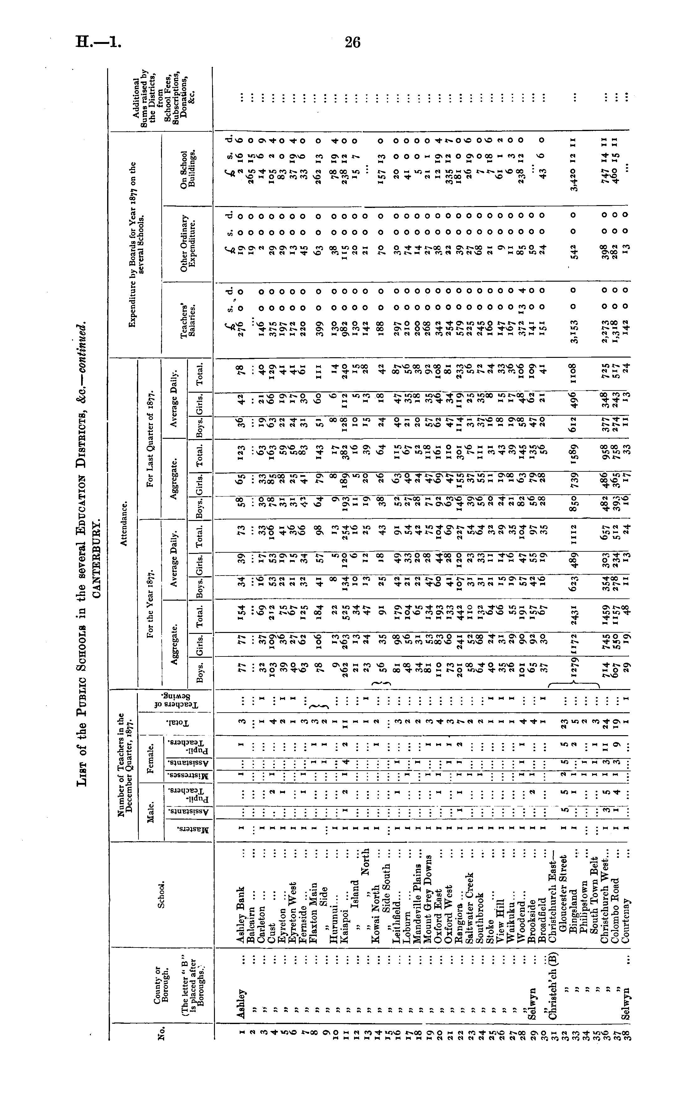 List of the Public Schools ia the several Education Districts, &e. — continued. CANTEEBUEY. Number of Teachers in the December Quarter, 1877. Attendance. Expenditure by Boards for Year r877 on the several Schools. Additional Sums raised by the Districts, from School Fees, Subscriptions, Donations, &c. Male. Female. For the Year 1877. For Last Quarter of 1877. No. County or Borough. School. en to S.E — if _ 5 legate. Average Daily. Aggregate. Average Daily. Teachers' Salaries. Other Ordinary Expenditure. (The letter " B " is placed after Boroughs.; in in 7 "55 JZ _.- tf, 7 "55 ._ 5 Total. Boys. On School Buildings. ■1= rt H Boys. Girls. Total. Boys. Girls. Girls. Total. Boys. Girls. Total. Ashley Bank Bali-aim ... Carleton ... Cust Eyreton ... EyretonWest Femsido ... Flaxton Main „ Side Hnrtmui... Kaiapoi ... „ Island „ „ North Kowai North „ Side South ... LeithCeld... I.ohurn Mandeville Plains ... Mount Grey Downs Oxford East Oxford West Bangiora ... Saltwater Creek Southbrook Stoke View Hill Waikuku... Wood end... Brookside Broadfield Christchurch East — Gloucester Street Bingsland Pbilipstown South Town Belt Christchurch West.., Colombo Boad Courtcnay 58j 65 36 78 £ s. d. 276 o o 1900 19 o o 200 29 o o 29 o o 13 o o 45 o o 2 16 6 265 15 o 14 6 9 105 2 4 83 o o 37 19 4 33 8 ° 262 13 o I 2 3 4 5 6 7 9 10 Ashley I "1 I ... 1 3 77 77 154 34 39 73 123 42 jj ■•• ... i 32 i°3 39 40 63 37 109 36 27 62 69 212 75 67 125 .6 53 22 17 53 19 •5 34 33 106 41 36 66 3° 78 3i 3i 33 85 28 25 4' 63 163 59 56 83 "9 63 22 21 66 40 129 41 41 61 146 o o 375 ° ° 197 o o 172 o o 220 o o jj •■ ■ I I I 2 1 **' I j, I 4 2 I I I jj .. 21 32 24 3 1 19 '7 3° jj I 1 I I I 1 3 3 2 i 98 jj 78 106 184 41 57 64 79 '43 5' 60 in 399 ° ° 63 o o jj I I I 13 263 13 24 8 134 10 '3 8 189 20 17 382 16 39 8 128 6 14 240 '5 28 38 o o 11 j o o 20 O O 78 19 4 238 12 o *& 7 ° 11 12 '4 17 iS 19 20 jj I 1 2 ... I 4 2 II I 9 262 21 22 525 34 47 5 120 6 13 254 16 25 9 193 11 19 10 '5 112 "3 130 o o 982 o o 130 o o 142 o o a I I I i 23 12 21 OO a ... I 2 J. 35 9i 25 18 43 38 26 64 24 18 42 188 o o 70 O O 157 '3 o i 98 56 31 53 83 60 241 52 68 24 3i 29 90 92 3° 179 104 65 134 193 133 442 no 42 21 49 33 20 28 44 28 120 23 33 11 14 16 47 55 •9 9i 54 42 75 104 69 227 54 64 32 29 35 104 97 35 52 27 28 7i 92 63 146 39 56 20 24 21 82 28 63 40 24 47 69 47 '55 37 55 11 19 18 63 79 28 U5 67 52 118 161 40 21 47 35 18 87 38 92 108 81 297 o o 210 o o 30 o o 74 o o 1400 27 o o 38 o o 22 O O 20 o o 41 o o 500 21 I O j» I 1 ... 3 2 2 3 4 3 7 2 2 I 8. 48 34 81 a I I •I |... I 22 47 60 20 200 O O 268 o o 342 o o 254 o o 579 ° ° 225 o o 245 ° ° 160 o o 147 o o 167 o o 372 13 4 141 o o 151 o o a I I 2 I 22 23 26 27 21) 31 3-' 33 34 35 31 38 jj jj j> jj >j ■ •• a I I I I I I -I .... 1 ... I 1 1 "I I I I I I I 2 i no 73 201 58 64 40 35 26 101 65 37 1^2 64 66 55 191 '57 67 4i 107 3i 31 21 15 '9 57 42 16 no 301 '76 in 57 62 47 114 3' 37 16 18 58 47 20 35 34 119 25 35 8 17 48 62 21 233 56 72 24 33 36 106 39 o o 27 o o 68 o o 21 o o 12 19 4 335 " 7 181 o o 26 19 6 700 7 18 C 61 1 2 630 238 12 o tt a it • •* Selwyn I I ... 2 I I I I I I 4 4 I i i 31 43 39 145 135 56 900 II 00 85 o o 50 o o 24 o o Christch'ch (B) I I - i 109 41 43 6 o jj jj I I 3 5 ..I. 4 2 1 5 1 1 3 3 5 2 23 5 2 3 I j-1279 1172 2431 623 489 1112 85° 739 1589 612 496 1108 3j tS3 ° ° 542 o o 3,420 12 11 jj 1 1 j, jj I 1 1 11 7H 607 29 745 '9 "459 ii57 48 3541 278 3°3 234 13 657 512 24 4S2 39.; 16 486' 36 5J •71 958 758 33 377 274 11 348 243 13 725 517 24 2,273 o o 1,318 o o 142 o o 398 o o 282 o o 13 o o 747 14 " 460 15 n jj Selwyn I I 1 9 i ... ...