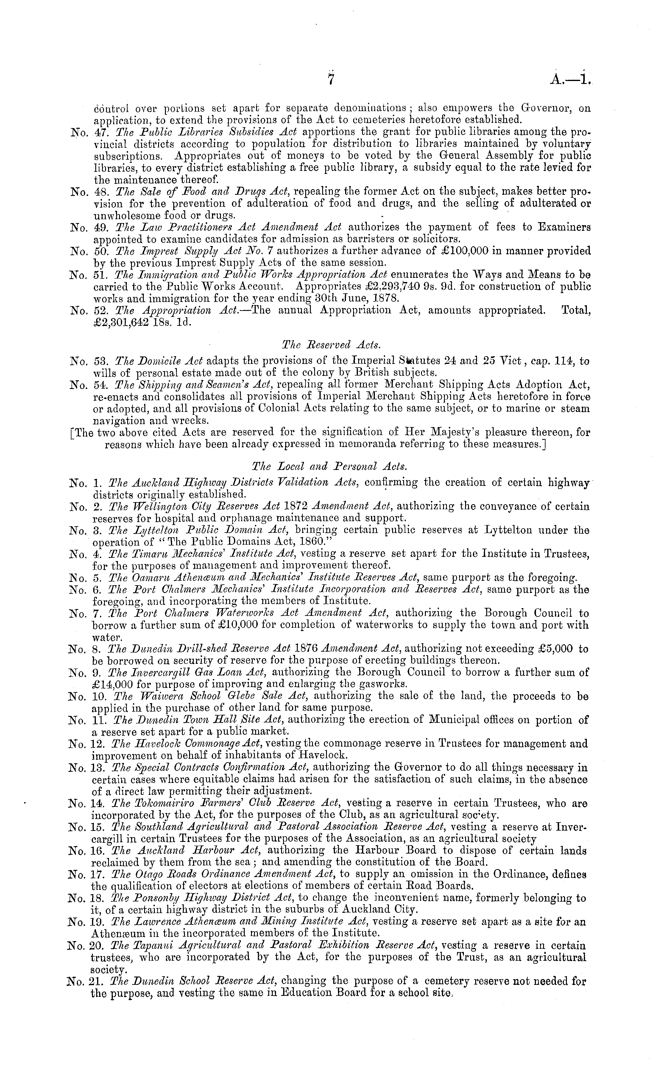 control over portions set apart for separate denominations; also empowers the Governor, on application, to extend the provisions of the Act to cemeteries heretofore established. No. 47. The Public Libraries Subsidies Act apportions the grant for public libraries among the provincial districts according to population for distribution to libraries maintained by voluntary subscriptions. Appropriates out of moneys to be voted by the General Assembly for public libraries, to every district establishing a free public library, a subsidy equal to the rate levied for the maintenance thereof. No. 48. The Sale of Food and Drugs Act, repealing the former Act on the subject, makes better provision for the prevention of adulteration of food and drugs, and the selling of adulterated or unwholesome food or drugs. No. 49. The Law Practitioners Act Amendment Act authorizes the payment of fees to Examiners appointed to examine candidates for admission as barristers or solicitors. No. 50. The Imprest Supply Act No. 7 authorizes a further advance of £100,000 in manner provided by the previous Imprest Supply Acts of the same session. No. 51. The Immigration and Public Works Appropriation Act enumerates the Ways and Means to be carried to the Public Works Account. Appropriates £2,293,740 9s. 9d. for construction of public works and immigration for the year ending 30th June, 1878. No. 52. The Appropriation Act. —The annual Appropriation Act, amounts appropriated. Total, £2,301,642 18s. Id. The Beserved Acts. No. 53. The Domicile Act adapts the provisions of the Imperial Statutes 24 and 25 Arict, cap. 114, to wills of personal estate made out of the colony by British subjects. No. 54. The Shipping and Seamen's Act, repealing all former Merchant Shipping Acts Adoption Act, re-enacts and consolidates all provisions of Imperial Merchant Shipping Acts heretofore in force or adopted, and all provisions of Colonial Acts relating to the same subject, or to marine or steam navigation and wrecks. [The two above cited Acts are reserved for the signification of Her Majesty's pleasure thereon, for reasons which have been already expressed in memoranda referring to these measures.] The Local and Personal Acts. No. 1. The Auckland Highway Districts Validation Acts, confirming the creation of certain highway districts originally established. No. 2. The Wellington City Beserves Act 1872 Amendment Act, authorizing the conveyance of certain reserves for hospital and orphanage maintenance and support. No. 3. The Lyttelton Public Domain Act, bringing certain public reserves at Lyttelton under the operation of " The Public Domains Act, 1860." No. 4. The Timaru Mechanics' Institute Act, vesting a reserve set apart for the Institute in Trustees, for the purposes of management and improvement thereof. No. 5. The Oamaru Athenwum and Mechanics'1 Institute Beserves Act, same purport as the foregoing. No. 6. The Port Chalmers Mechanics'' Institute Incorporation and Beserves Act, same purport as the foregoing, and incorporating the members of Institute. No. 7. The Port Chalmers Watenvorks Act Amendment Act, authorizing the Borough Council to borrow a further sum of £10,000 for completion of waterworks to supply the town and port with water. No. 8. The Dunedin Drill-shed Beserve Act 1876 Amendment Act, authorizing not exceeding £5,000 to be borrowed on security of reserve for the purpose of erecting buildings thereon. No. 9. The Invercargill Gas Loan Act, authorizing the Borough Council to borrow a further sum of £14,000 for purpose of improving and enlarging the gasworks. No. 10. The Wdkoera School Glebe Sale Act, authorizing the sale of the land, the proceeds to be applied in the purchase of other land for same purpose. No. 11. The Dunedin Town Hall Site Act, authorizing the erection of Municipal offices on portion of a reserve set apart for a public market. No. 12. The Havelock Commonage Act, vesting the commonage reserve in Trustees for management and improvement on behalf of inhabitants of Havelock. No. 13. The Special Contracts Confirmation Act, authorizing the Governor to do all things necessary in certain cases where equitable claims had arisen for the satisfaction of such claims, in the absence of a direct law permitting their adjustment. No. 14. The Tokomairiro Farmers'' Club Beserve Act, vesting a reserve in certain Trustees, who are incorporated by the Act, for the purposes of the Club, as an agricultural soc;ety. No. 15. The Southland Agricultural and Pastoral Association Beserve Act, vesting a reserve at Invercargill in certain Trustees for the purposes of the Association, as an agricultural society No. 16. The Auckland Harbour Act, authorizing the Harbour Board to dispose of certain lands reclaimed by them from the sea ; and amending the constitution of the Board. No. 17. The Otago Boads Ordinance Amendment Act, to supply an omission in the Ordinance, defines the qualification of electors at elections of members of certain Road Boards. No. 18. The Ponsonby Highway District Act, to change the inconvenient name, formerly belonging to it, of a certain highway district in the suburbs of Auckland City. No. 19. The Lawrence Athenwum and Mining Institute Act, vesting a reserve set apart as a site for an Athenaeum in the incorporated members of the Institute. No. 20. The Tapanui Agricultural and Pastoral Exhibition Beserve Act, vesting a reserve in certain trustees, who are incorporated by the Act, for the purposes of the Trust, as an agricultural society. No. 21. The Dunedin School Beserve Act, changing the purpose of a cemetery reserve not needed for the purpose, and vesting the same in Education Board for a school site,