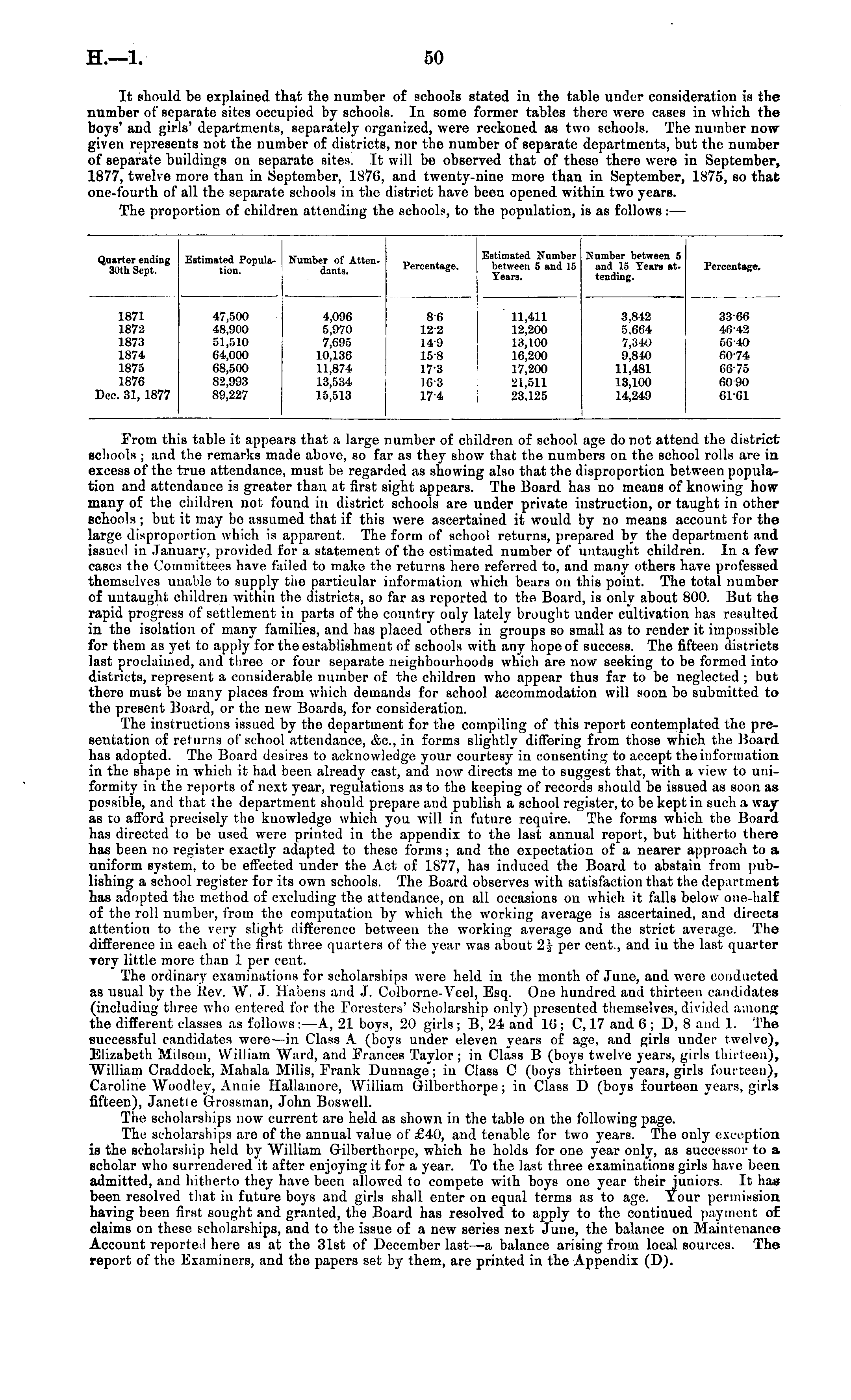From this table it appears that a large number of children of school age do not attend the district schools ; and the remarks made above, so far as they show that the numbers on the school rolls are in excess of the true attendance, must be regarded as showing also that the disproportion between population and attendance is greater than at first sight appears. The Board has no means of knowing how many of the children not found iv district schools are under private instruction, or taught in other schools ; but it may be assumed that if this were ascertained it would by no means account for the large disproportion which is apparent. The form of school returns, prepared by the department and issued in January, provided for a statement of the estimated number of untaught children. In a few cases the Committees have failed to make the returns here referred to, and many others have professed themselves unable to supply tiie particular information which bears on this point. The total number of untaught children within the districts, so far as reported to the Board, is only about 800. But the rapid progress of settlement in parts of the country only lately brought under cultivation has resulted in the isolation of many families, and has placed others in groups so small as to render it impossible for them as yet to apply for the establishment of schools with any hope of success. The fifteen districts last proclaimed, and three or four separate neighbourhoods which are now seeking to be formed into districts, represent a considerable number of the children who appear thus far to be neglected ; but there must be many places from which demands for school accommodation will soon be submitted to the present Board, or the new Boards, for consideration. The instructions issued by the department for the compiling of this report contemplated the presentation of returns of school attendance, &c, in forms slightly differing from those which the Board has adopted. The Board desires to acknowledge your courtesy in consenting to accept the information in the shape in which it had been already cast, and now directs me to suggest that, with a view to uniformity in the reports of next year, regulations as to the keeping of records should be issued as soon as possible, and that the department should prepare and publish a school register, to be kept in such a way as to afford precisely the knowledge which you will in future require. The forms which the Board has directed to bo used were printed in the appendix to the last annual report, but hitherto there has been no register exactly adapted to these forms; and the expectation of a nearer approach to a. uniform system, to be effected under the Act of 1877, has induced the Board to abstain from publishing a school register for its own schools. The Board observes with satisfaction that the department has adopted the method of excluding the attendance, on all occasions on which it falls below one-half of the roll number, from the computation by which the working average is ascertained, and directs attention to the very slight difference between the working average and the strict average. The difference in each of the first three quarters of the year was about 2} per cent., and iv the last quarter very little more than 1 per cent. The ordinary examinations for scholarships were held in the month of June, and were conducted as usual by the Rev. W. J. liabens and J. Colborne-Veel, Esq. One hundred and thirteen candidates (including three who entered for the Foresters' Scholarship only) presented themselves, divided among the different classes as follows: —A, 21 boys, 20 girls; B, 24 and 16; C, 17 and 6;D, 8 aud 1. The successful candidates were—in Class A (boys under eleven years of age, and girls under twelve), Elizabeth Milsoni, William Ward, and Frances Tavlor; in Class B (boys twelve years, girls thirteen), "William Craddock, Mahala Mills, Frank Dunnage; in Class C (boys thirteen years, girls fourteen), Caroline Woodley, Annie Hallainore, William Gilberthorpe; in Class D (boys fourteen years, girls fifteen), Janet! c Grossman, John Bos well. The scholarships now current are held as shown in the table on the following page. The scholarships are of the annual value of £40, and tenable for two years. The only exception. is the scholarship held by William Gilberthorpe, which he holds for one year only, as successor to a, scholar who surrendered it after enjoying it for a year. To the last three examinations girls have been admitted, and hitherto they have been allowed to compete with boys one year their juniors. It hasbeen resolved that in future boys and girls shall enter on equal terms as to age. Tour permission having been first sought and granted, the Board has resolved" to apply to the continued payment of claims on these scholarships, and to the issue of a new series next June, the balance on Maintenance Account reported here as at the 3.lst of December last —a balance arising from local sources. The report of the Examiners, and the papers set by them, are printed in the Appendix (D).