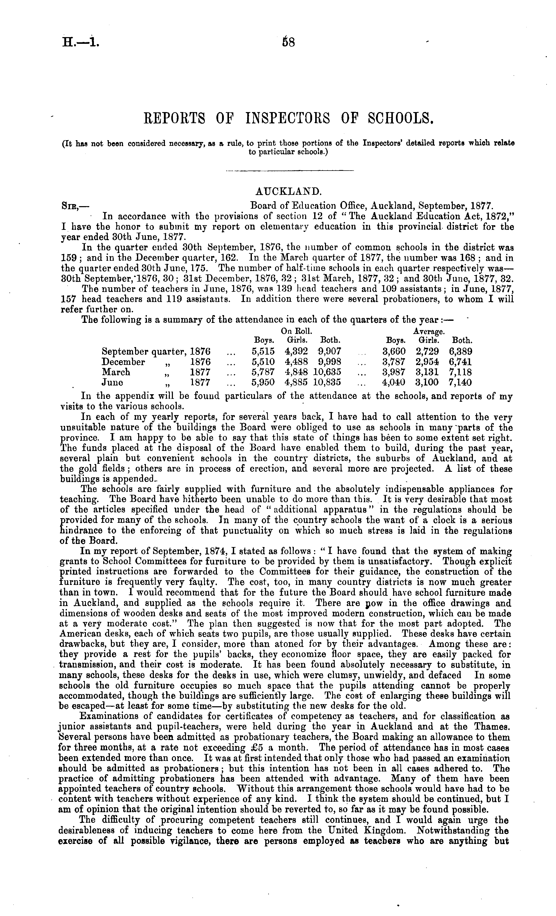 AUCKLAND. Sib, — Board of Education Office, Auckland, September, 1877. In accordance with tho provisions of section 12 of ': The Auckland Education Act, 1872," I have the honor to submit my report on elementary education in this provincial district for the year ended 30th June, 1877. In the quarter ended 30th September, 1876, the number of common schools in the district was 159 ; and in the December quarter, 162. In the March quarter of 1877, the number was 168 ; and in the quarter ended 30th June, 175. The number of half-time schools in each quarter respectively was — 30th September,-1876, 30 ; 31st December, 1876, 32 ; 31st March, 1877, 32 ; and 30th June, 1877, 32. The number of teachers in .lime, 1876, was 139 head teachers and 109 assistants; in June, 1877, 157 head teachers and 119 assistants. In addition there were several probationers, to whom I will refer further on. The following is a summary of the attendance in each of the quarters of the year:— On Roll. Average. Boys. Girls. Both. Boys. Girls. Both. September quarter, 1876 ... 5,515 4,392 9,907 3,660 2,729 6,389 December „ 1876 ... 5,510 4,488 9,998 ... 3,787 2,954 6,741 March „ 1877 ... 5,787 4,848 10,635 ... 3,987 3,131 7,118 June „ 1877 ... 5,950 4,885 10,835 ... 4,040 3,100 7,140 In the appendix will be found particulars of the attendance at the schools, and reports of my visits to the various schools. In each of my yearly reports, for several years back, I have had to call attention to the very unsuitable nature of the buildings the Board were obliged to use as schools in many parts of the province. lam happy to be able to say that this state of things has been to some extent set right. The funds placed at the disposal of the Board have enabled them to build, during the past year, several plain but convenient schools in the country districts, the suburbs of Auckland, and at the gold fields ; others are in process of erection, and several more are projected. A list of these buildings is appended.. The schools are fairly supplied with furniture and the absolutely indispensable appliances for teaching. The Board have hitherto been unable to do more than this. It is very desirable that most of the articles specified under the head of " additional apparatus" in the regulations should be provided for many of the schools. In many of the country schools the want of a clock is a serious hindrance to the enforcing of that punctuality on which so much stress is laid in the regulations of the Board. In my report of September, 1874, I stated as follows : " I have found that the system of making grants to School Committees for furniture to be provided by them is unsatisfactory. Though explicit printed instructions are forwarded to the Committees for their guidance, the construction of the furniture is frequently very faulty. The cost, too, in many country districts is now much greater than in town. 1 would recommend that for the future the Board should have school furniture made in Auckland, and supplied as the schools require it. There are now in the office drawings and dimensions of wooden desks and seats of the most improved modern construction, which can be made at a very moderate cost." The plan then suggested is now that for the most part adopted. The American desks, each of which seats two pupils, are those usually supplied. These desks have certain drawbacks, but they are, I consider, more than atoned for by their advantages. Among these are: they provide a rest for the pupils' backs, they economize floor space, they are easily packed for transmission, and their cost is moderate. It has been found absolutely necessary to substitute, in many schools, these desks for the desks in use, which were clumsy, unwieldy, and defaced In some schools the old furniture occupies so much space that the pupils attending cannot be properly accommodated, though the buildings are sufficiently large. The cost of enlarging these buildings will be escaped —at least for some time —by substituting the new desks for the old. Examinations of candidates for certificates of competency as teachers, and for classification as junior assistants and pupil-teachers, were held during tho year in Auckland and at the Thames. Several persons have been admitted as probationary teachers, the Board making an allowance to them for three months, at a rate not exceeding £5 a month. The period of attendance has in most cases been extended more than once. It was at first intended that only those who had passed an examination should be admitted as probationers ; but this intention has not been in all cases adhered to. The practice of admitting probationers has been attended with advantage. Many of them have been appointed teachers of country schools. Without this arrangement those schools would have had to be content with teachers without experience of any kind. I think the system should be continued, but I am of opinion that the original intention should be reverted to, so far as it may be found possible. The difficulty of procuring competent teachers still continues, and I would again urge the desirableness of inducing teachers to come here from the United Kingdom. Notwithstanding the exercise of all possible vigilance, there are persons employed as teachers who are anything but