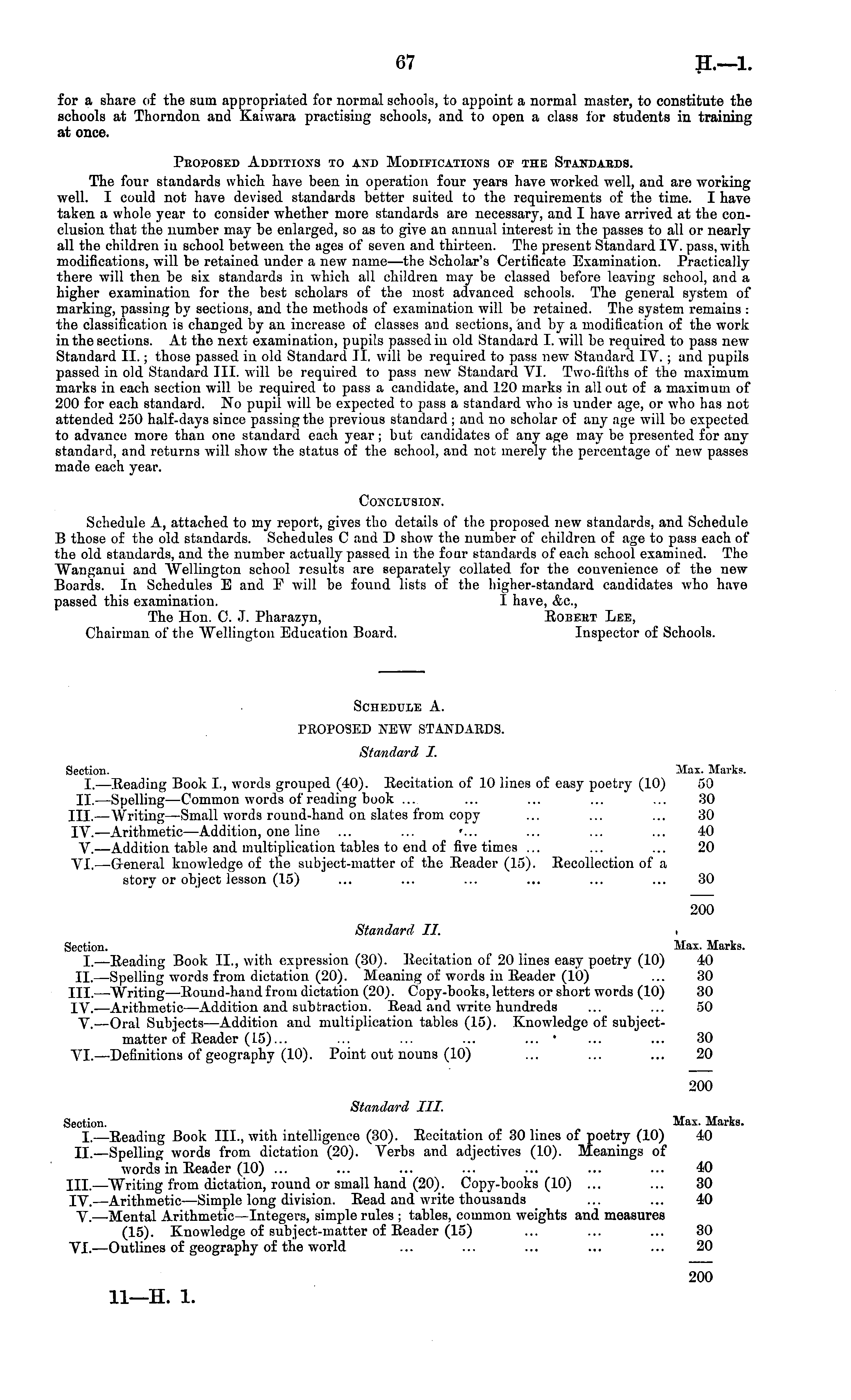 for a share of the sum appropriated for normal schools, to appoint a normal master, to constitute the schools at Thorndon and Kaiwara practising schools, and to open a class for students in training at once. Peoposed Additions to and Modifications of the Standaeds. The four standards which have been in operation four years have worked well, and are working well. I could not have devised standards better suited to the requirements of the time. I have taken a whole year to consider whether more standards are necessary, and I have arrived at the conclusion that the number may be enlarged, so as to give an annual interest in tho passes to all or nearly all the children iv school between the ages of seven and thirteen. The present Standard IV. pass, with modifications, will be retained under a new name—the Scholar's Certificate Examination. Practically there will then be six standards in which all children may be classed before leaving school, and a higher examination for the best scholars of the most advanced schools. The general system of marking, passing by sections, and the methods of examination will be retained. The system remains : the classification is changed by an increase of classes and sections, and by a modification of the work in the sections. At tho next examination, pupils passed in old Standard I. will be required to pass new Standard II.; those passed in old Standard 11. will be required to pass new Standard IV. ; and pupils passed in old Standard 111. will be required to pass new Standard VI. Two-fifths of the maximum marks in each section will be required to pass a candidate, and 120 marks in all out of a maximum of 200 for each standard. No pupil will be expected to pass a standard who is under age, or who has not attended 250 half-days since passing the previous standard ; and no scholar of any age will bo expected to advance more than one standard each year; but candidates of any age may be presented for any standard, and returns will show the status of the school, and not merely the percentage of new passes made each year. Conclusion. Schedule A, attached to my report, gives the details of the proposed new standards, and Schedule B those of the old standards. Schedules C and D show the number of children of age to pass each of the old standards, and the number actually passed in the four standards of each school examined. The Wanganui and Wellington school results are separately collated for the convenience of the new Boards. In Schedules E and F will be found lists of the higher-standard candidates who have passed this examination. I have, &c, The Hon. 0. J. Pharazyn, Roueht Lee, Chairman of the Wellington Education Board. Inspector of Schools.