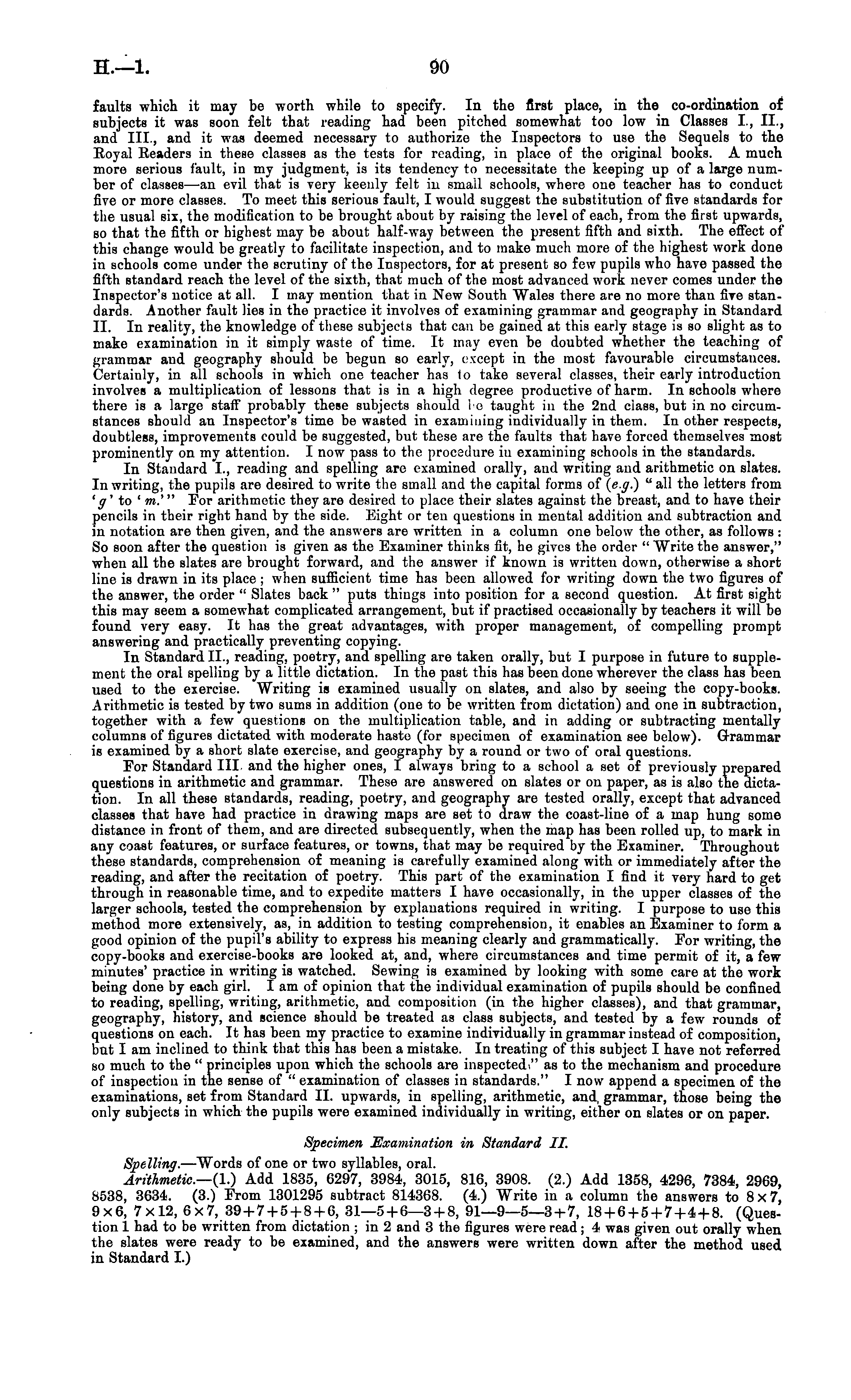faults which it may be worth while to specify. In the first place, in the co-ordination of subjects it was soon felt that reading had been pitched somewhat too low in Classes 1., 11., and 111., and it was deemed necessary to authorize the Inspectors to use the Sequels to the Royal Readers in these classes as the tests for reading, in place of the original books. A much more serious fault, in my judgment, is its tendency to necessitate the keeping up of a large number of classes —an evil that is very keenly felt in small schools, where one teacher has to conduct five or more classes. To meet this serious fault, I would suggest the substitution of five standards for the usual six, the modification to be brought about by raising the level of each, from the first upwards, so that the fifth or highest may be about half-way between the present fifth and sixth. The effect of this change w Tould be greatly to facilitate inspection, and to make much more of the highest work done in schools come under the scrutiny of the Inspectors, for at present so few pupils who have passed the fifth standard reach the level of the sixth, that much of the most advanced work never comes under the Inspector's notice at all. I may mention that in New South Wales there are no more than five standards. Another fault lies in the practice it involves of examining grammar and geography in Standard 11. In reality, the knowledge of these subjects that can be gained at this early stage is so slight as to make examination in it simply waste of time. It may even be doubted whether the teaching of grammar and geography should be begun so early, except in the most favourable circumstances. Certainly, in all schools in which one teacher has to take several classes, their early introduction involves a multiplication of lessons that is in a high degree productive of harm. In schools where there is a large staff probably these subjects should be taught in the 2nd class, but in no circumstances should an Inspector's time be wasted in examining individually in them. In other respects, doubtless, improvements could be suggested, but these are the faults that have forced themselves most prominently on my attention. I now pass to the procedure in examining schools in the standards. In Standard 1., reading and spelling are examined orally, aud writing and arithmetic on slates. In writing, the pupils are desired to write the small and the capital forms of (e.g.) " all the letters from 'g' to ' m.' " For arithmetic they are desired to place their slates against the breast, and to have their pencils in their right hand by the side. Eight or ten questions in mental addition and subtraction and in notation are then given, and the answers are written in a column one below the other, as follows : So soon after the question is given as the Examiner thinks fit, he gives the order " "Write the answer," when all the slates are brought forward, and the answer if known is written down, otherwise a short line is drawn in its place ; when sufficient time has been allowed for writing down the two figures of the answer, the order " Slates back " puts things into position for a second question. At first sight this may seem a somewhat complicated arrangement, but if practised occasionally by teachers it will be found very easy. It has the great advantages, with proper management, of compelling prompt answering and practically preventing copying. In Standard 11., reading, poetry, and spelling are taken orally, but I purpose in future to supplement the oral spelling by a little dictation. In the past this has been done wherever the class has been used to the exercise. Writing is examined usually on slates, and also by seeing the copy-books. Arithmetic is tested by two sums in addition (one to be written from dictation) and one in subtraction, together with a few questions on the multiplication table, and in adding or subtracting mentally columns of figures dictated with moderate haste (for specimen of examination see below). Grammar is examined by a short slate exercise, and geography by a round or two of oral questions. For Standard 111 and the higher ones, I always bring to a school a set of previously prepared questions in arithmetic and grammar. These are answered on slates or on paper, as is also the dictation. In all these standards, reading, poetry, and geography are tested orally, except that advanced classes that have had practice in drawing maps are set to draw the coast-line of a map hung some distance in front of them, and are directed subsequently, when the map has been rolled up, to mark in any coast features, or surface features, or towns, that may be required by the Examiner. Throughout these standards, comprehension of meaning is carefully examined along with or immediately after the reading, and after the recitation of poetry. This part of the examination I find it very hard to get through in reasonable time, and to expedite matters I have occasionally, in the upper classes of tho larger schools, tested the comprehension by explanations required in writing. I purpose to use this method more extensively, as, in addition to testing comprehension, it enables an Examiner to form a good opinion of the pupil's ability to express his meaning clearly and grammatically. For writing, the copy-books and exercise-books are looked at, and, where circumstances and time permit of it, a few minutes' practice in writing is watched. Sewing is examined by looking with some care at the work being done by each girl. lam of opinion that the individual examination of pupils should be confined to reading, spelling, writing, arithmetic, and composition (in the higher classes), and that grammar, geography, history, and science should be treated as class subjects, and tested by a few rounds of questions on each. It has been my practice to examine individually in grammar instead of composition, but lam inclined to think that this has been a mistake. In treating of
