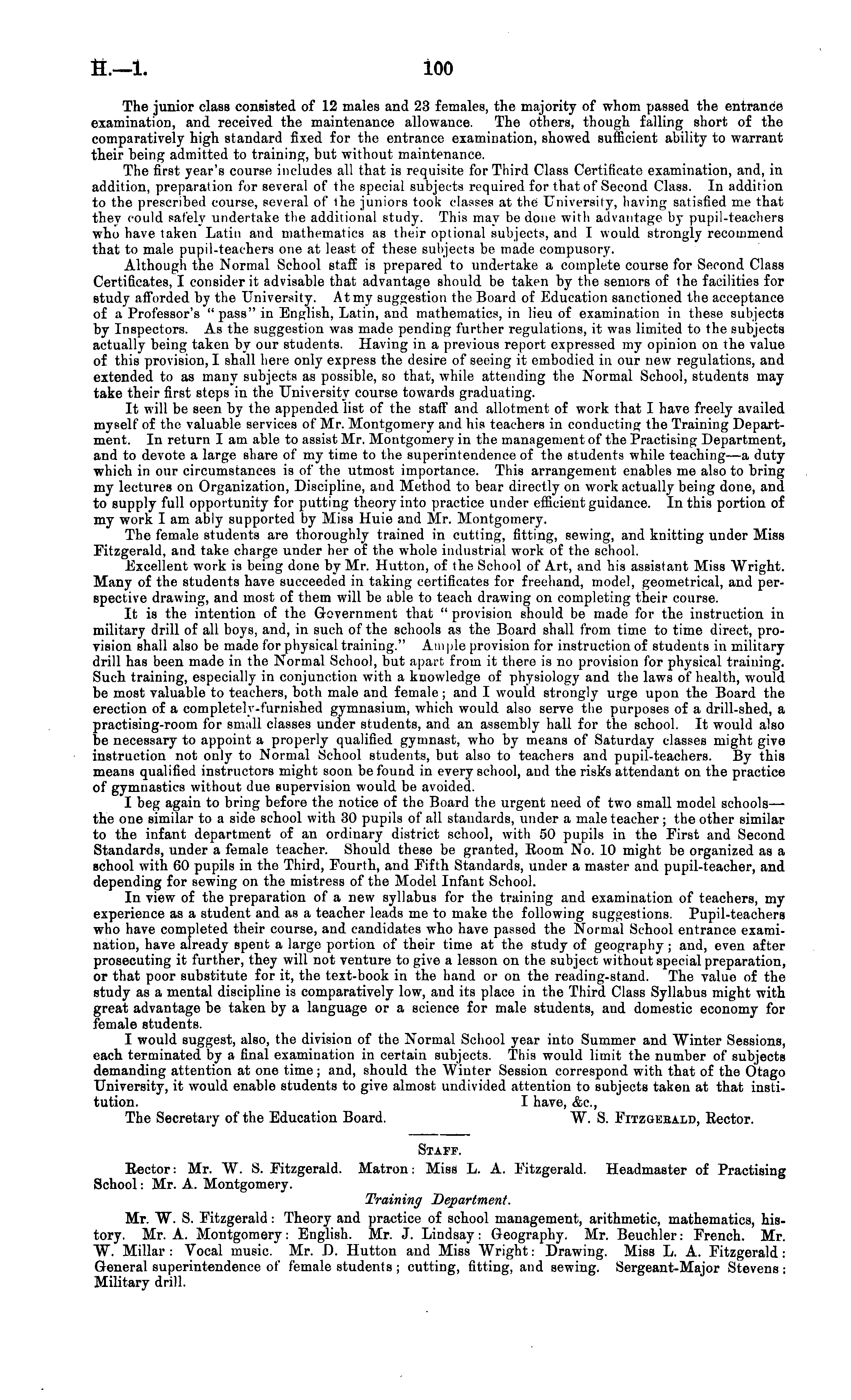 The junior class consisted of 12 males and 23 females, the majority of whom passed the entrance examination, and received the maintenance allowance. The others, though falling short of the comparatively high standard fixed for the entrance examination, showed sufficient ability to warrant their being admitted to training, but without maintenance. The first year's course includes all that is requisite for Third Class Certificate examination, and, in addition, preparation for several of the special subjects required for that of Second Class. In addition to the prescribed course, several of the juniors took classes at the University, having satisfied me that they could safely undertake the additional study. This may be done with advantage by pupil-teachers who have taken Latin and mathematics as their optional subjects, and I would strongly recommend that to male pupil-teachers one at least of these subjects be made compusory. Although the Normal School staff is prepared to undertake a complete course for Second Class Certificates, I consider it advisable that advantage should be taken by the seniors of the facilities for Btudy afforded by the University. At my suggestion the Board of Education sanctioned the acceptance of a Professor's " pass" in English, Latin, and mathematics, in lieu of examination in these subjects by Inspectors. As the suggestion was made pending further regulations, it was limited to the subjects actually being taken by our students. Having in a previous report expressed my opinion on the value of this provision, I shall here only express the desire of seeing it embodied in our new regulations, and extended to as many subjects as possible, so that, while attending the Normal School, students may take their first steps in the University course towards graduating. It will be seen by the appended list of the staff and allotment of work that I have freely availed myself of the valuable services of Mr. Montgomery and his teachers in conducting the Training Department. In return lam able to assist Mr. Montgomery in the management of the Practising Department, and to devote a large share of my time to the superintendence of the students while teaching—a duty which in our circumstances is of the utmost importance. This arrangement enables me also to bring my lectures on Organization, Discipline, and Method to bear directly on work actually being done, and to supply full opportunity for putting theory into practice under efficient guidance. In this portion of my work I am ably supported by Miss Huie and Mr. Montgomery. The female students are thoroughly trained in cutting, fitting, sewing, and knitting under Miss Fitzgerald, and take charge under her of the whole industrial work of the school. Excellent work is being done by Mr. Hutton, of the School of Art, and his assistant Miss Wright. Many of the students have succeeded in taking certificates for freehand, model, geometrical, and perspective drawing, and most of them will be able to teach drawing on completing their course. It is the intention of the Government that " provision should be made for the instruction in military drill of all boys, and, in such of the schools as the Board shall from time to time direct, provision shall also be made for physical training." Am pie provision for instruction of student sin military drill has been made in the Normal School, but apart from it there is no provision for physical training. Such training, especially in conjunction with a knowledge of physiology and the laws of health, would be most valuable to teachers, both male and female; and I would strongly urge upon the Board the erection of a completely-furnished gymnasium, which would also serve tbe purposes of a drill-shed, a practising-room for small classes under students, and an assembly hall for the school. It would also be necessary to appoint a properly qualified gymnast, who by means of Saturday classes might give instruction not only to Normal School students, but also to teachers and pupil-teachers. By this means qualified instructors might soon be found in every school, and the risk's attendant on the practice of gymnastics without due supervision would be avoided. I beg again to bring before the notice of the Board the urgent need of two small model schools— the one similar to a side school with 30 pupils of all standards, under a male teacher ; the other similar to the infant department of an ordinary district school, with 50 pupils in the First and Second Standards, under a female teacher. Should these be granted, Room No. 10 might be organized as a school with 60 pupils in the Third, Fourth, and Fifth Standards, under a master and pupil-teacher, and depending for sewing on the mistress of the Model Infant School. In view of the preparation of a new syllabus for the training and examination of teachers, my experience as a student and as a teacher leads me to make the following suggestions. Pupil-teachers who have completed their course, and candidates who have passed the Normal School entrance examination, have already spent a large portion of their time at the study of geography ; and, even after prosecuting it further, they will not venture to give a lesson on the subject without special preparation, or that poor substitute for it, the text-book in the hand or on the reading-stand. The value of the study as a mental discipline is comparatively low, and its place in the Third Class Syllabus might with great advantage be taken by a language or a science for male students, and domestic economy for female students. I would suggest, also, the division of the Normal School year into Summer and Winter Sessions, each terminated by a final examination in certain subjects. This would limit the number of subjects demanding attention at one time ; and, should the Winter Session correspond with that of the Otago University, it would enable students to give almost undivided attention to subjects taken at that institution. I