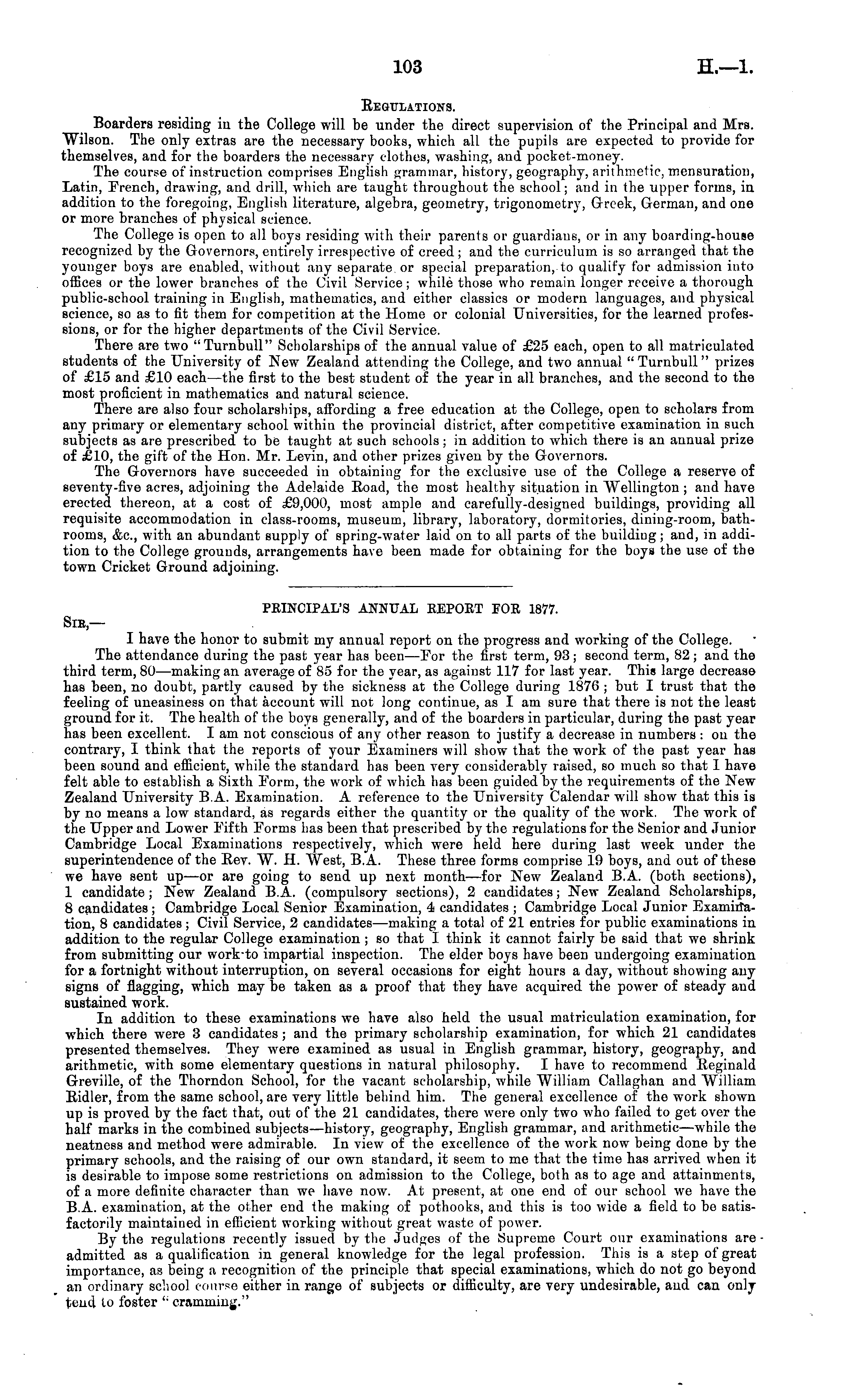 Eegulations. Boarders residing in the College will be under the direct supervision of the Principal and Mrs. Wilson. The only extras are the necessary books, which all the pupils are expected to provide for themselves, and for the boarders the necessary clothes, washing, and pocket-money. The course of instruction comprises English grammar, history, geography, arithmetic, mensuration, Latin, French, drawing, and drill, which are taught throughout the school; and in the upper forms, in addition to the foregoing, English literature, algebra, geometry, trigonometry, Greek, German, and one or more branches of physical science. The College is open to all boys residing with their parents or guardians, or in any boarding-house recognized by the Governors, entirely irrespective of creed; and the curriculum is so arranged that the younger boys are enabled, without any separate, or special preparation, to qualify for admission into offices or the lower branches of the Civil Service; while those who remain longer receive a thorough public-school training in English, mathematics, and either classics or modern languages, and physical science, so as to fit them for competition at the Home or colonial Universities, for the learned professions, or for the higher departments of the Civil Service. There are two "Turnbull" Scholarships of the annual value of £25 each, open to all matriculated students of the University of New Zealand attending the College, and two annual "Turnbull" prizes of £15 and £10 each —the first to the best student of the year in all branches, and the second to the most proficient in mathematics and natural science. There are also four scholarships, affording a free education at the College, open to scholars from any primary or elementary school within the provincial district, after competitive examination in such subjects as are prescribed to be taught at such schools; in addition to which there is an annual prize of £10, the gift of the Hon. Mr. Levin, and other prizes given by the Governors. The Governors have succeeded in obtaining for the exclusive use of the College a reserve of seventy-five acres, adjoining the Adelaide Eoad, the most healthy situation in Wellington ; and have erected thereon, at a cost of £9,000, most ample and carefully-designed buildings, providing all requisite accommodation in class-rooms, museum, library, laboratory, dormitories, dining-room, bathrooms, &c, with an abundant supply of spring-water laid on to all parts of the building; and, in addition to the College grounds, arrangements have been made for obtaining for the boys the use of the town Cricket Ground adjoining.