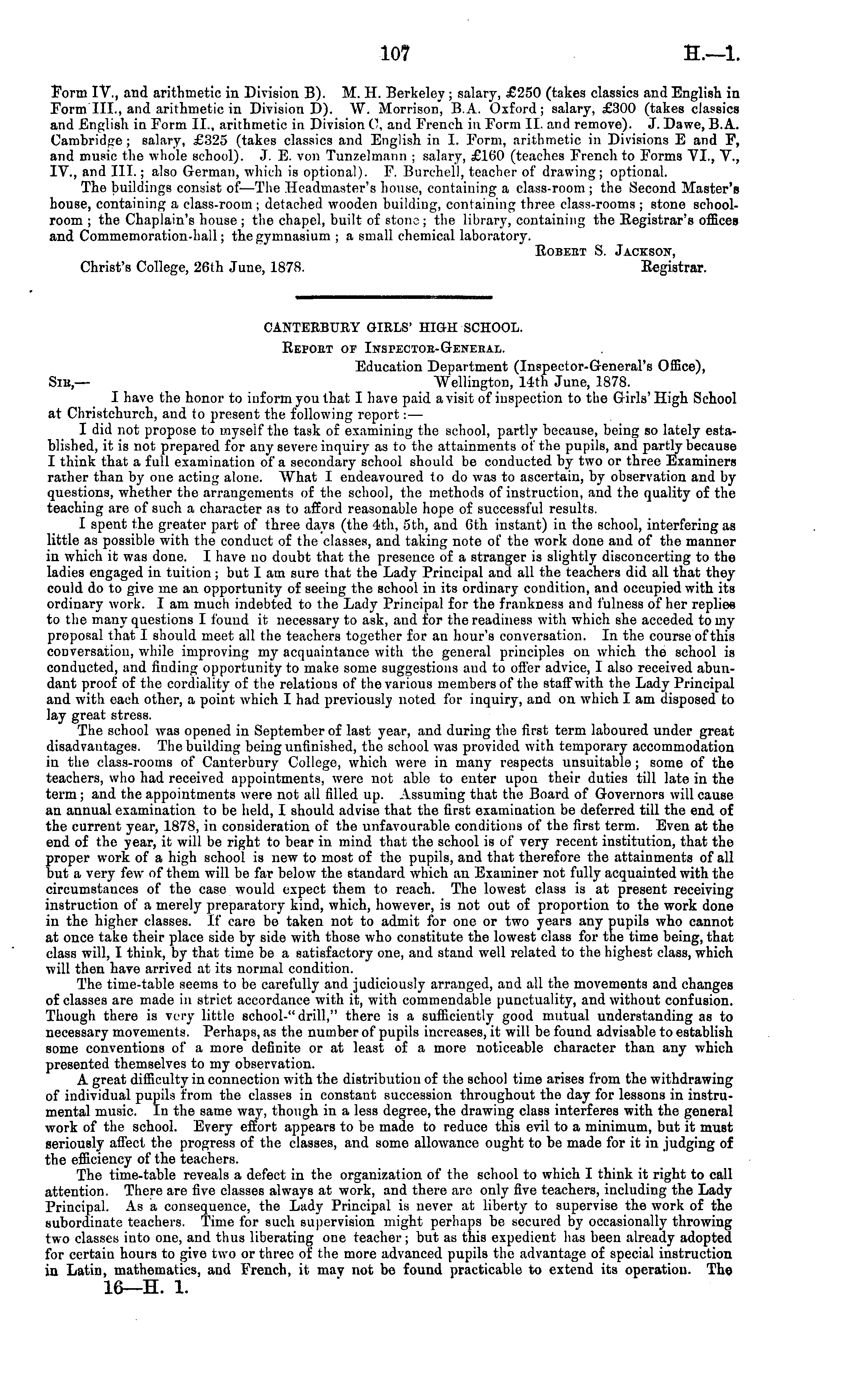 CANTERBURY GIRLS' HIGH SCHOOL. Eeport or Inspector-General. Education Department (Inspector-General's Office), Sm,— Wellington, 14th June, 1878. I have the honor to inform you that I have paid a visit of inspection to the Girls' High School at Christchurch, and to present the following report: — I did not propose to myself the task of examining the school, partly because, being so lately established, it is not prepared for any severe inquiry as to the attainments of'the pupils, and partly because I think that a full examination of a secondary school should be conducted by two or three Examiners rather than by one acting alone. AVhat I endeavoured to do was to ascertain, by observation and by questions, whether the arrangements of the school, the methods of instruction, and the quality of the teaching are of such a character as to afford reasonable hope of successful results. I spent the greater part of three days (the 4th, sth, and 6th instant) in the school, interfering as little as possible with the conduct of the classes, and taking note of the work done and of the manner in which it was done. I have no doubt that the presence of a stranger is slightly disconcerting to the ladies engaged in tuition; but lam sure that the Lady Principal and all the teachers did all that they could do to give me an opportunity of seeing the school in its ordinary condition, and occupied with its ordinary work. lam much indebted to the Lady Principal for the frankness and fulness of her replies to tho many questions I found it necessary to ask, and for the readiness with which she acceded to my proposal that I should meet all the teachers together for an hour's conversation. In the course of this conversation, while improving my acquaintance with the general principles on which the school is conducted, and finding opportunity to make some suggestions aud to offer advice, I also received abundant proof of the cordiality of the relations of the various members of the staff with the Lady Principal aud with each other, a point which I had previously noted for inquiry, and on which I am disposed to lay great stress. The school was opened in September of last year, and during the first term laboured under great disadvantages. The building being unfinished, tho school was provided with temporary accommodation in the class-rooms of Canterbury College, which were in many respects unsuitable ; some of the teachers, who had received appointments, were not able to enter upon their duties till late in the term ; and the appointments were not all filled up. Assuming that the Board of Governors will cause an annual examination to be held, I should advise that the first examination be deferred till the end of the current year, 1878, in consideration of the unfavourable conditions of the first term. Even at the end of the year, it will be right to bear in mind that the school is of very recent institution, that the proper work of a high school is new to most of tho pupils, and that therefore the attainments of all but a very few of them will be far below the standard which an Examiner not fully acquainted with the circumstances of the case would expect them to reach. The lowest class is at present receiving instruction of a merely preparatory kind, which, however, is not out of proportion to the work done in the higher classes. If care be taken not to admit for one or two years any pupils who cannot at once take their place side by side with those who constitute the lowest class for the time being, that class will, I think, by that time be a satisfactory one, and stand well related to the highest class, which will then have arrived at its normal condition. The time-table seems to be carefully and judiciously arranged, and all the movements and changes of classes are made in strict accordance with it, with commendable punctuality, and without confusion. Though there is very little school-" drill," there is a sufficiently good mutual understanding as to necessary movement s. Perhaps, as the number of pupils increases, it will be found advisable to establish some conventions of a more definite or at least of a more noticeable character than any which presented themselves to my observation. A great difficulty in connection with the distribution of the school time arises from the withdrawing of individual pupils from the classes in constant succession throughout the day for lessons in instrumental music. In the same way, though in a less degree, the drawing class interferes with the general work of the school. Every effort appears to be made to reduce this evil to a minimum, but it must seriously affect the progress of the classes, and some allowance ought to be made for it in judging of the efficiency of the teachers. The time-table reveals a defect in the organization of the school to which I think it right to call attention. There are five classes always at work, and there aro only five teachers, including the Lady Principal. As a consequence, the Lady Principal is never at liberty to supervise the work of the subordinate teachers. Time for such supervision might perhaps be secured by occasionally throwing two classes into one, and thus liberating one teacher ; but as this expedient has been already adopted for certain hours to give two or three of the more advanced pupils the advantage of special instruction in Latii), mathematics, and French, it may not be found practicable to extend its operation. The 16— H. 1.