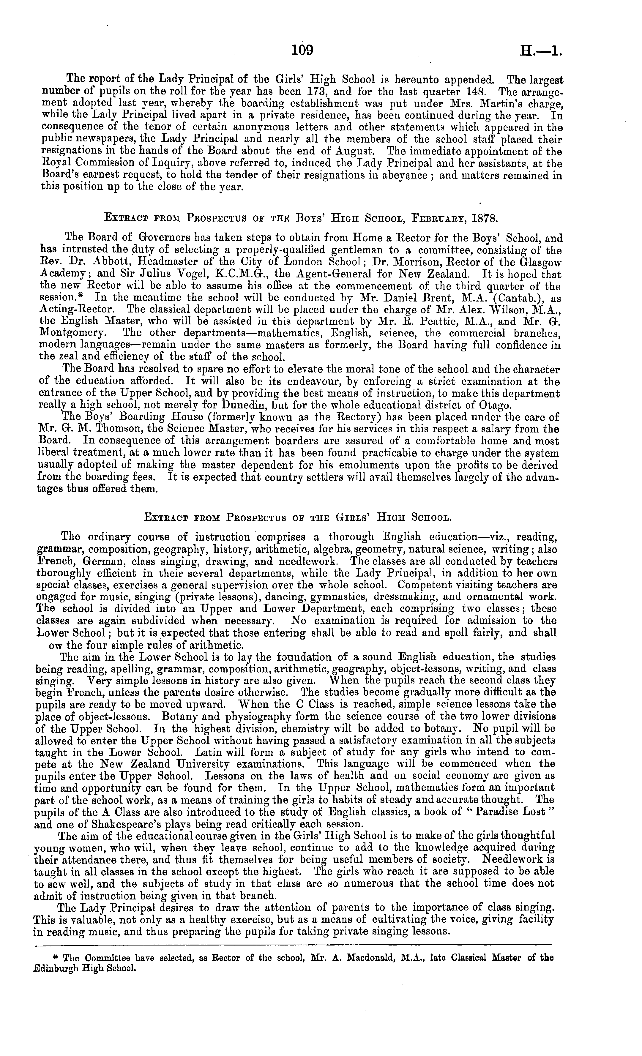 The report of the Lady Principal of the Girls' High School is hereunto appended. The largest number of pupils on the roll for the year has been 173, and for the last quarter 148. The arrangement adopted last year, whereby the boarding establishment was put under Mrs. Martin's charge, while the Lady Principal lived apart in a private residence, has been continued during the year. In consequence of the tenor of certain anonymous letters and other statements which appeared in the public newspapers, the Lady Principal and nearly all the members of the school staff placed their resignations in the hands of the Board about the end of August. The immediate appointment of the Eoyal Commission of Inquiry, above referred to, induced the Lady Principal and her assistants, at the Board's earnest request, to hold the tender of their resignations in abeyance ; and matters remained in this position up to the close of the year. Extract from Prospectus of the Boys' High School, February, 1878. The Board of Governors has taken steps to obtain from Home a Eector for the Boys' School, and has intrusted the duty of selecting a properly-qualified gentleman to a committee, consisting of the Eev. Dr. Abbott, Headmaster of the City of London School; Dr. Morrison, Eector of the Glasgow Academy; and Sir Julius Vogel, K.C.M.G., the Agent-General for New Zealand. It is hoped that the new- Eector will be able to assume his office at the commencement of the third quarter of the session.* In the meantime the school will be conducted by Mr. Daniel Brent, M.A. (Cantab.), as Acting-Eector. The classical department will be placed under the charge of Mr. Alex. WilsoD, M.A., the English Master, who will be assisted in this department by Mr. E. Peattie, M.A., and Mr. G. Montgomery. The other departments —mathematics, English, science, the commercial branches, modern languages —remain under the same masters as formerly, the Board having full confidence in the zeal and efficiency of the staff of the school. The Board has resolved to spare no effort to elevate tho moral tone of the school and the character of the education afforded. It will also be its endeavour, by enforcing a strict examination at the entrance of the Upper School, and by providing the best means of instruction, to make this department really a high school, not merely for Dunedin, but for the whole educational district of Otago. The Boys' Boarding House (formerly known as the Bectory) has been placed under the care of Mr. G. M. Thomson, the Science Master, who receives for his services in this respect a salary from the Board. In consequence of this arrangement boarders are assured of a comfortable home and most liberal treatment, at a much lower rate than it has been found practicable to charge under the system usually adopted of making the master dependent for his emoluments upon the profits to be derived from the boarding fees. It is expected that country settlers will avail themselves largely of the advantages thus offered them. Extract from Prospectus of the Girls' High School. Tho ordinary course of instruction comprises a thorough English education —viz., reading, grammar, composition, geograpl^, history, arithmetic, algebra, geometry, natural science, writing; also French, German, class singing, drawing, and needlework. The classes are all conducted by teachers thoroughly efficient in their several departments, while the Lady Principal, in addition to her own special classes, exercises a general supervision over the whole school. Competent visiting teachers are engaged for music, singing (private lessons), dancing, gymnastics, dressmaking, and ornamental work. The school is divided into an Upper and Lower Department, each comprising two classes; these classes are again subdivided when necessary. No examination is required for admission to the Lower School; but it is expected tbat those entering shall be able to read and spell fairly, and shall ow the four simple rules of arithmetic. The aim in the Lower School is to lay the foundation of a sound English education, the studies being reading, spelling, grammar, composition, arithmetic, geography, object-lessons, writing, and class singing. Very simple lessons in history are also given. When the pupils reach the second class they begin French, unless the parents desire otherwise. The studies become gradually more difficult as the pupils are ready to be moved upward. When the C Class is reached, simple science lessons take the place of object-lessons. Botany and physiography form the science course of the two lower divisions of tho Upper School. In the highest division, chemistry will be added to botany. No pupil will be allowed to enter the Upper School without having passed a satisfactory examination in all the subjects taught in the Lower School. Latin will form a subject of study for any girls who intend to compete at the New Zealand University examinations. This language will be commenced when the pupils enter the Upper School. Lessons on the laws of health and on social economy are given as time and opportunity can be found for them. In the Upper School, mathematics form an important part of the school work, as a means of training the girls to habits of steady and accurate thought. The pupils of the A Class are also introduced to the study of English classics, a book of " Paradise Lost " and one of Shakespeare's plays being read critically each session. The aim of the educational course given in the Girls' High School is to make of the girls thoughtful young women, who will, when they leave school, continue to add to the knowledge acquired during their attendance there, and thus fit themselves for being useful members of society. Needlework is taught in all classes in the school except the highest. The girls who reach it are supposed to be able to sew well, and the subjects of study in that class are so numerous that the school time does not admit of instruction being given in that branch. The La