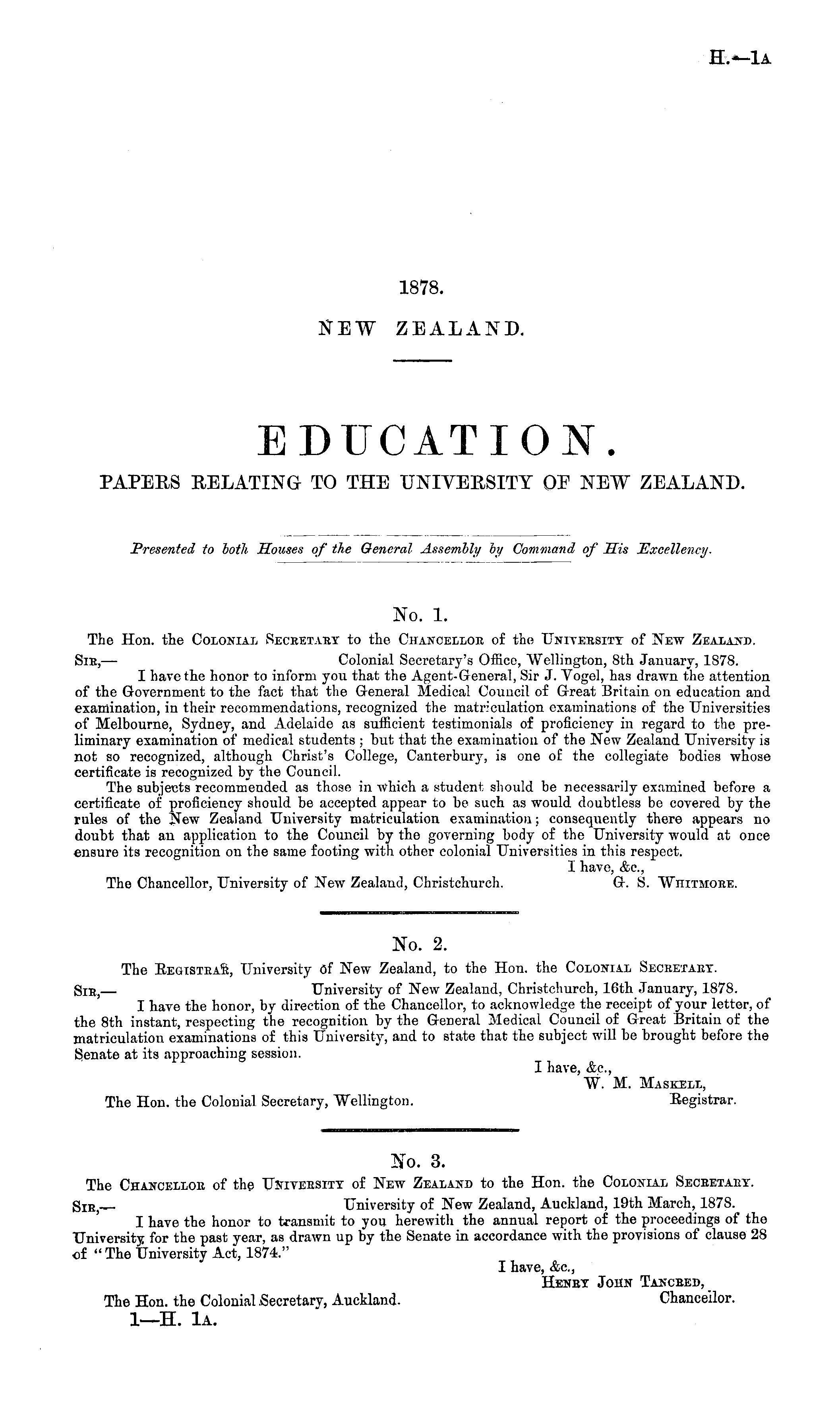 No. 3. The Chancellor of the University of New Zealand to the Hon. the Colonial Secretaet. Sir,— University of New Zealand, Auckland, 19th March, 1878. I have the honor to transmit to yon herewith the annual report of the proceedings of the University for the past year, as drawn up by the Senate in accordance with the provisions of clause 2S of " The University Act, 1874." I have, &c, Henrt John Tancred, The Hon. the Colonial Secretary, Auckland. Chancellor. I—H. IA.