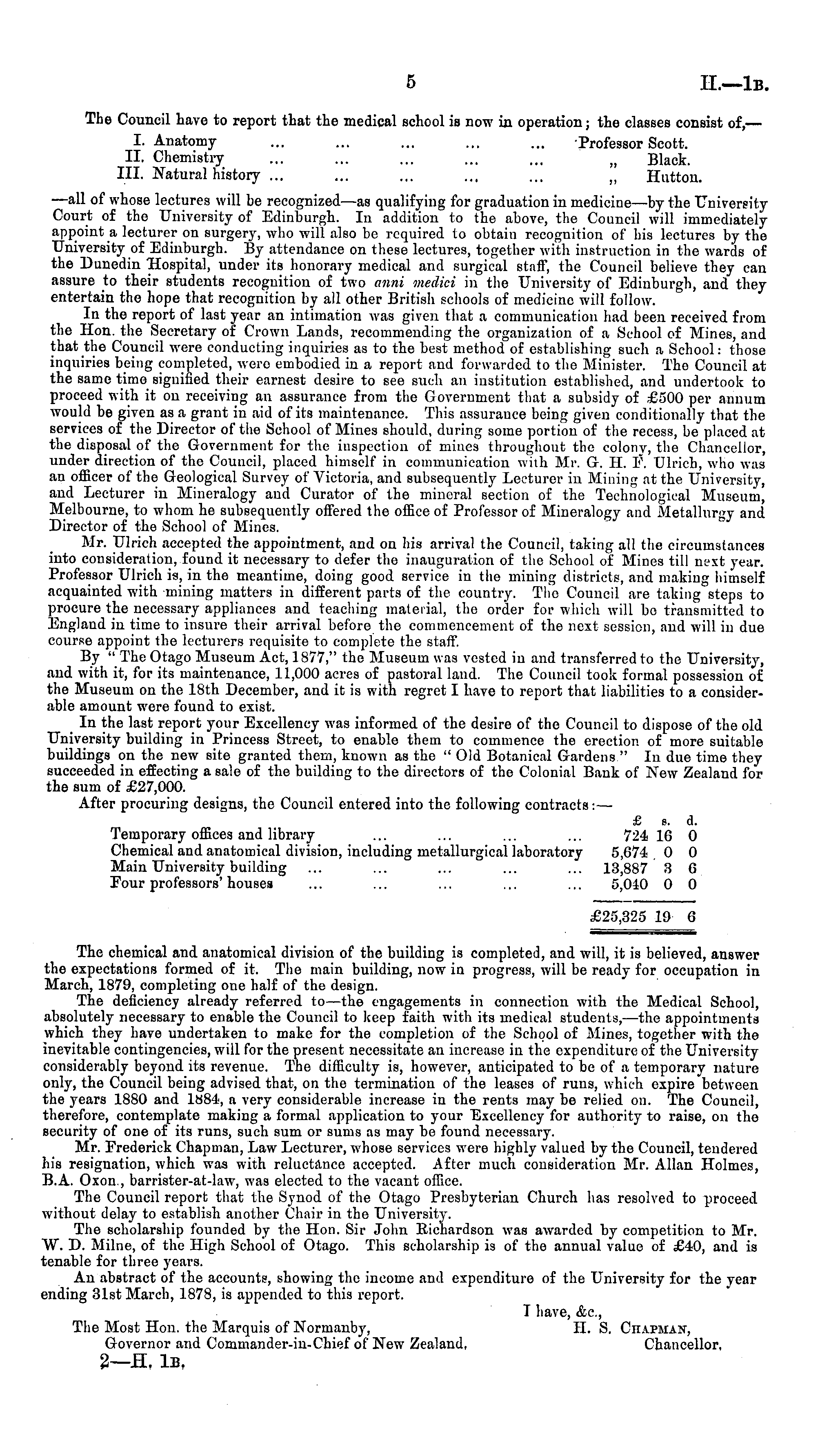 The Council have to report that the medical school is now in operation; the classes consist of, — I. Anatomy ... ... ... ... ... Professor Scott. 11. Chemistry ... ... ... ... ... n Black. 111. Natural history ... ... ... ... ... n Hutton. —all of whose lectures will be recognized—as qualifying for graduation in medicine —by the University Court of tho University of Edinburgh. In addition to the above, the Council will immediately appoint a lecturer on surgery, who will also be required to obtain recognition of his lectures by tho University of Edinburgh. By attendance on these lectures, together with instruction in the wards of the Dunedin Hospital, under its honorary medical and surgical staff, the Council believe they can assure to their students recognition of two anni medici in the University of Edinburgh, and they entertain the hope that recognition by all other British schools of medicine will follow. In the report of last year an intimation was given that a communication had been received from the Hon. the Secretary of Crown Lands, recommending the organization of a School of Mines, and that the Council were conducting inquiries as to the best method of establishing such a School: those inquiries being completed, were embodied in a report and forwarded to the Minister. The Council at the same time signified their earnest desire to see such an institution established, and undertook to proceed with it on receiving an assurance from the Government that a subsidy of £500 per annum would be given as a grant in aid of its maintenance. This assurauce being given conditionally that the services of tho Director of the School of Mines should, during some portion of the recess, be placed at the disposal of the Government for the inspection of mines throughout the colony, the Chancellor, under direction of the Council, placed himself in communication with Mr. G. H. F. Ulrich, who was an officer of the Geological Survey of Victoria, and subsequently Lecturer in Mining at the University, and Lecturer in Mineralogy and Curator of the mineral section of the Technological Museum, Melbourne, to whom he subsequently offered the office of Professor of Mineralogy and Metallurgy and Director of the School of Mines. Mr. Ulrich accepted the appointment, and on his arrival the Council, taking all the circumstances into consideration, found it necessary to defer the inauguration of the School of Mines till next year. Professor Ulrich is, in the meantime, doing good service in the mining districts, and making himself acquainted with mining matters in different parts of the country. The Council are taking steps to procure the necessary appliances and teaching material, the order for which will bo transmitted to England in time to insure their arrival before the commencement of the next session, and will in due course appoint the lecturers requisite to complete the staff. By " The Otago Museum Act, 1877," the Museum was vested in and transferred to the University, and with it, for its maintenance, 11,000 acres of pastoral land. The Council took formal possession of the Museum on the 18th December, and it is with regret I have to report that liabilities to a considerable amount were found to exist. In the last report your Excellency was informed of the desire of the Council to dispose of the old University building in Princess Street, to enable them to commence the erection of more suitable buildings on the new site granted them, known as the " Old Botanical Gardens " In due time they succeeded in effecting a sale of the building to the directors of the Colonial Bank of New Zealand for the sum of £27,000. After procuring designs, the Council entered into the following contracts: — £ s. d. Temporary offices and library ... ... ... ... 724 16 0 Chemical and anatomical division, including metallurgical laboratory 5,674 0 0 Main University building ... ... ... ... ... 13,887 3 6 Four professors'houses ... ... ... ... ... 5,040 0 0 £25,325 19 6 The chemical and anatomical division of the building is completed, and will, it is believed, answer the expectations formed of it. The main building, now in progress, will be ready for occupation in March, 1879, completing one half of the design. The deficiency already referred to—tho engagements in connection with the Medical School, absolutely necessary to enable the Council to keep faith with its medical students, —the appointments which they have undertaken to make for the completion of the School of Mines, together with the inevitable contingencies, will for the present necessitate an increase in the expenditure of the University considerably beyond its revenue. The difficulty is, however, anticipated to be of a temporary nature only, the Council being advised that, on tho termination of the leases of runs, which expire between the years 1880 and 1884, a very considerable increase in the rents may be relied on. The Council, therefore, contemplate making a formal application to your Excellency for authority to raise, on the security of one of its runs, such sum or sums as may be found necessary. Mr. Frederick Chapman, Law r Lecturer, whose services were highly valued by the Council, tendered his resignation, which was with reluctance accepted. After much consideration Mr. Allan Holmes, B.A. Oxon., barrister-at-law, was elected to the vacant office. The Council report that the Synod of the Otago Presbyterian Church has resolved to proceed without delay to establish another Chair in the University. Tho scholarship founded by the Hon. Sir John Richardson was awarded by competition to Mr. W. D. Milne, of the High School of Otago. This scholarship is of the annual value of £40, and is tenable for three years. An abstract of the accounts, showing the income and expenditure of the University for the year ending 31st March, 1878, is appended to this report. T have, &c, The Most Hon. the Marquis of Normanby, 11. S. Chapman, Governor and Commander-in-Chief of N