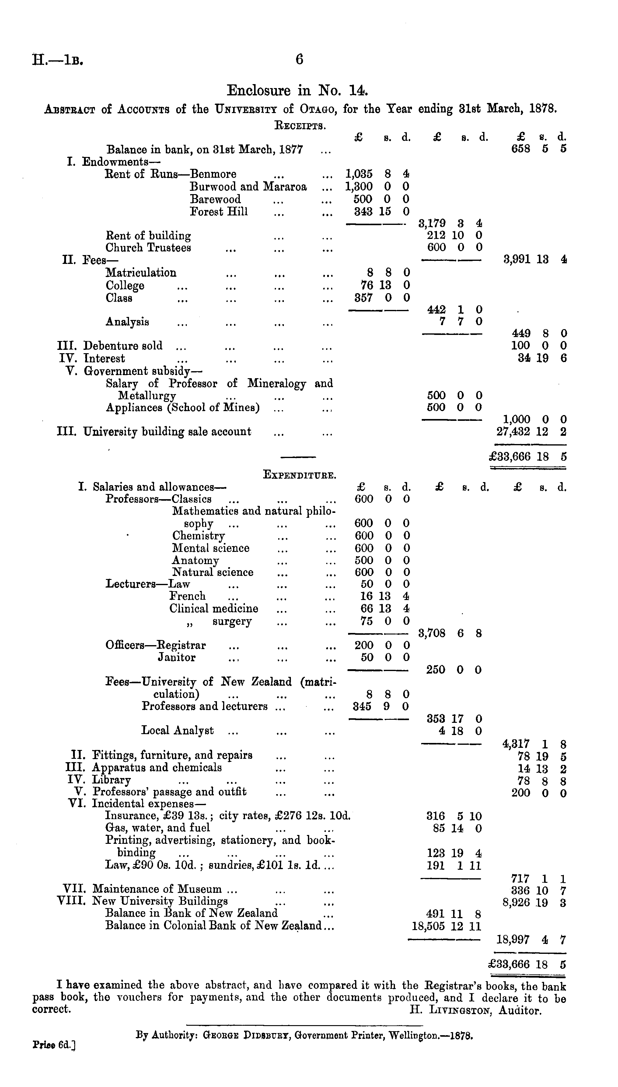 Enclosure in No. 14. Abstract of Accounts of the Univeesitt of Otago, for the Tear ending 31st March, 1878. Receipts. £ s. d. £ s. d. £ s. d. Balance in bank, on 31st March, 1877 ... 658 5 5 I. Endowments — Rent of Runs—Benmore ... ... 1,035 8 4 Burwood and Mararoa ... 1,300 0 0 Barewood ... ... 500 0 0 Forest Hill ... ... 343 15 0 3,179 3 4 Rent of building ... ... 212 10 0 Church Trustees ... ... ... 600 0 0 11. Fees— 3,991 13 4 Matriculation ... ... ... 880 College ... ... ... ... 76 13 0 Class ... ... ... ... 357 0 0 442 1 0 Analysis ... ... ... ... 7 7 0 449 8 0 111. Debenture sold ... ... ... ... 100 0 0 IV. Interest ... ... ... ... 34 19 6 V. Government subsidy— Salary of Professor of Mineralogy and Metallurgy ... ... ... 500 0 0 Appliances (School of Mines) ... ... 500 0 0 1,000 0 0 111. University building sale account ... ... 27,432 12 2 £33,666 18 5 Expenditure. I. Salaries and allowances— £ s. d. £ s. d. £ s. d. Professors—Classics ... ... ... 600 0 0 Mathematics and natural philosophy ... ... ... 600 0 0 Chemistry ... ... 600 0 0 Mental science ... ... 600 0 0 Anatomy ... ... 500 0 0 Natural science ... ... 600 0 0 Lecturers —Law ... ... ... 50 0 0 French ... ... ... 16 13 4 Clinical medicine ... ... 66 13 4 ~ surgery ... ... 75 0 0 3,708 6 8 Officers—Registrar ... ... ... 200 0 0 Jauitor ... ... ... 50 0 0 250 0 0 Fees—University of New Zealand (matriculation) ... ... ... 8 8 0 Professors and lecturers ... ... 345 9 0 353 17 0 Local Analyst ... ... ... 4 18 0 4,317 1 8 11. Fittings, furniture, and repairs ... ... 78 19 5 111. Apparatus and chemicals ... ... 14 13 2 IV. Library ... ... ... ... 78 8 8 V. Professors' passage and outfit ... ... 200 0 0 VI. Incidental expenses — Insurance, £39 135.; city rates, £276 12s. lOd. 316 5 10 Gas, water, and fuel ... ... 85 14 0 Printing, advertising, stationery, and bookbinding ... ... ... ... 123 19 4 Law, £90 os. lOd. ; sundries, £101 Is. 1d.... 191 1 11 717 1 1 VII. Maintenance of Museum ... ... ... 336 10 7 VIII. New University Buildings ... ... 8,926 19 3 Balance in Bank of New Zealand ... 491 11 8 Balance in Colonial Bank of New Zealand... 18,505 12 11 18,997 4 7 £33,666 18 5 I have examined the above abstract, and have compared it with the Registrar's books, the bank pass book, the vouchers for payments, and the other documents produced, and I declare it to be correct. H. Livingston. Auditor. By Authority: Geoege Didbbuet, Government Printer, Wellington.—lB7B. Priec 6d.]