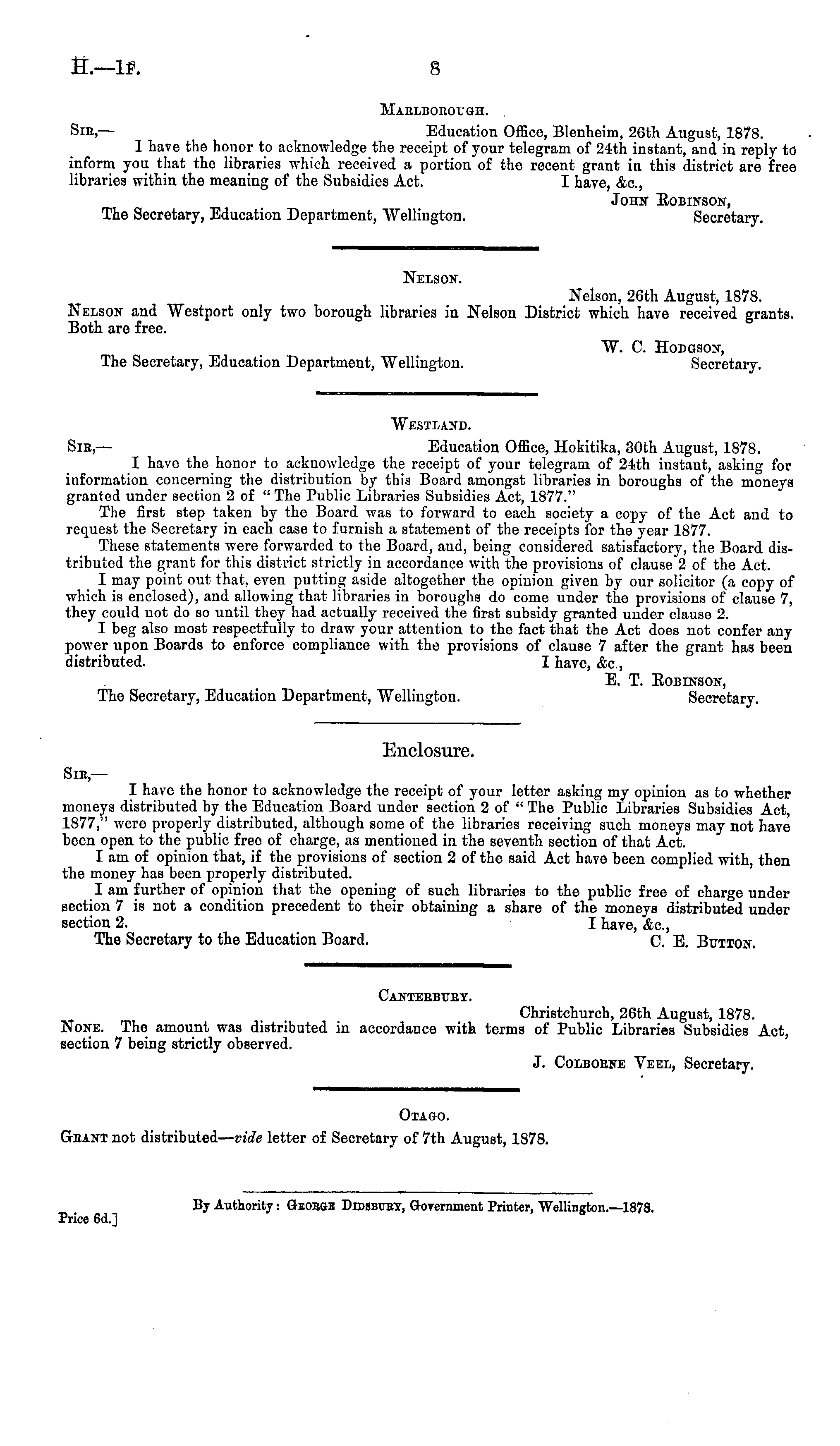 Westland. Sic,— Education Office, Hokitika, 30th August, 1878. I have the honor to acknowledge the receipt of your telegram of 24th iustant, asking for information concerning the distribution by this Board amongst libraries in boroughs of the moneys granted under section 2 of " The Public Libraries Subsidies Act, 1877." The first step taken by the Board was to forward to each society a copy of the Act and to request the Secretary in each case to furnish a statement of the receipts for the year 1877. These statements were forwarded to the Board, and, being considered satisfactory, the Board distributed the grant for this district strictly in accordance with the provisions of clause 2 of the Act. I may point out that, even putting aside altogether the opinion given by our solicitor (a copy of which is enclosed), and allowing that libraries in boroughs do come under the provisions of clause 7, they could not do so until they had actually received the first subsidy granted under clause 2. I beg also most respectfully to draw your attention to the fact that the Act does not confer any power upon Boards to enforce compliance with the provisions of clause 7 after the grant has been distributed. I have, &c, E. T. Eobinson, The Secretary, Education Department, Wellington. Secretary.