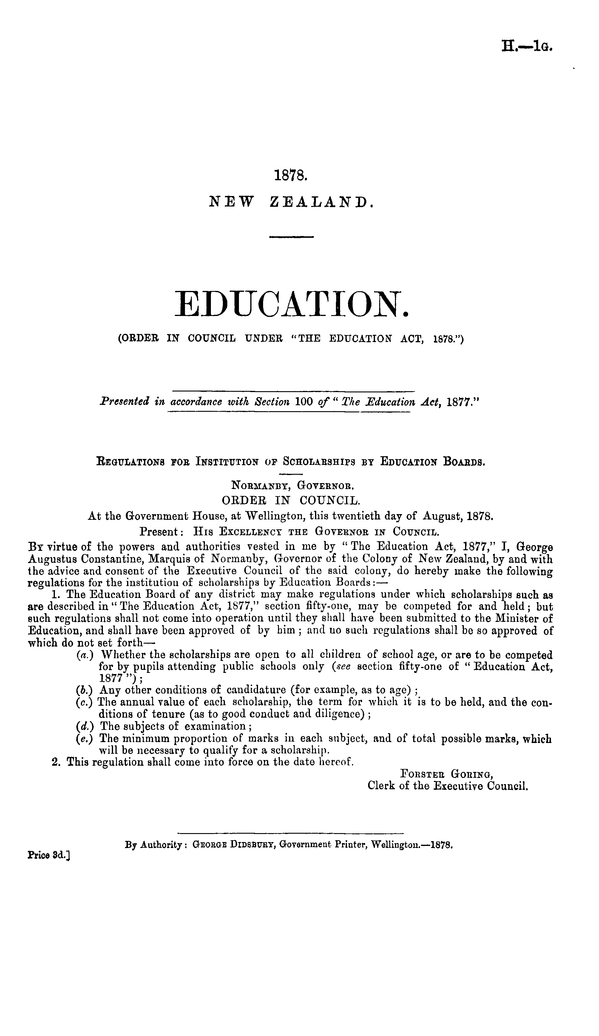 Regulations foe Institution op Scholarships by Education Boahds. NoBMANBY, GOVEENOB. ORDER IN COUNCIL. At the Government House, at Wellington, this twentieth day of August, 1878. Present: His Excellency the Goveenoe in Council. By virtue of the powers and authorities vested in me by " The Education Act, 1877," I, George Augustus Constantine, Marquis of Normanby, Governor of the Colony of New Zealand, by and with the advice and consent of the Executive Council of the said colony, do hereby make the following regulations for the institution of scholarships by Education Boards:— 1. The Education Board of any district may make regulations under which scholarships such as are described in " The Education Act, 1577," section fifty-one, may be competed for and held ; but such regulations shall not come into operation until they shall have been submitted to the Minister of Education, and shall have been approved of by him ; and no such regulations shall be so approved of which do not set forth— (a.) Whether the scholarships are open to all children of school age, or are to be competed for by pupils attending public schools only (see section fifty-one of " Education Act, 1877 ") ; (b.) Any other conditions of candidature (for example, as to age) ; (c.) The annual value of each scholarship, the term for which it is to be held, and the conditions of tenure (as to good conduct and diligence) ; (rf.) The subjects of examination ; (c.) The minimum proportion of marks in each subject, and of total possible marks, which will be necessary to qualify for a scholarship. 2. This regulation shall come into force on the date hereof. Foestee Goring, Clerk of the Executive Council. By Authority: Gteobge Didsbutst, G-overnmeut Printer, Wellington.—lB7B. Price 3d.]