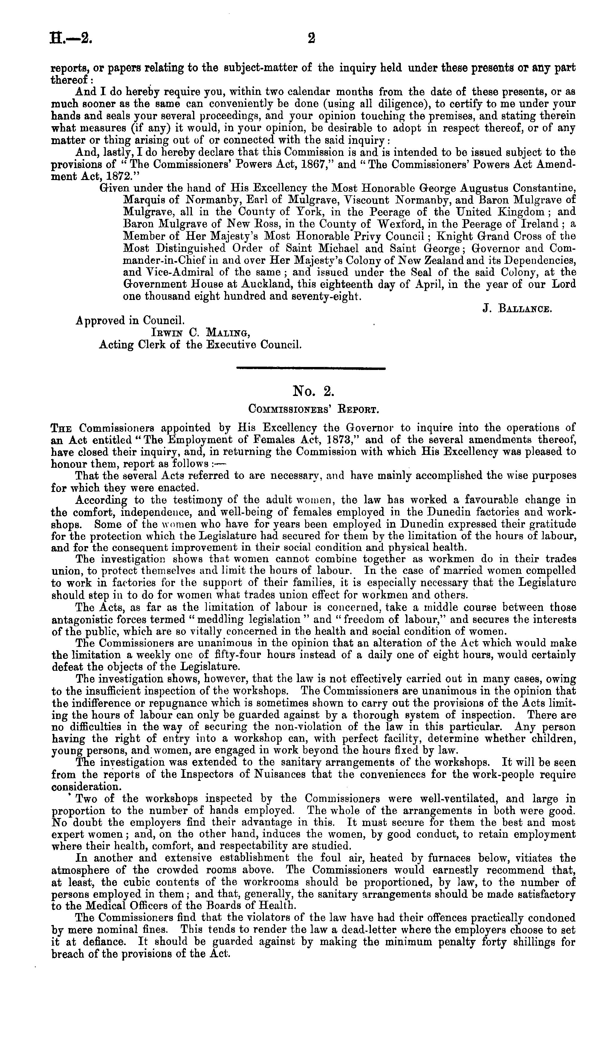 No. 2. Commissionees' Report. Tiie Commissioners appointed by His Excellency the Governor to inquire into the operations of an Act entitled "The Employment of Females Act, 1873," and of the several amendments thereof, have closed their inquiry, and, in returning the Commission with which His Excellency was pleased to honour them, report as follows : — That the several Acts referred to are necessary, and have mainly accomplished the wise purposes for which they were enacted. According to tho testimony of the adult women, the law has worked a favourable change in the comfort, independence, and well-being of females employed in the Dunedin factories and workshops. Some of the women who have for years been employed in Dunedin expressed their gratitude for the protection which the Legislature had secured for them by the limitation of the hours of labour, and for the consequent improvement in their social condition and physical health. The investigation shows that women cannot combine together as workmen do in their trades union, to protect themselves and limit the hours of labour. In the case of married women compelled to work in factories for the support of their families, it is especially necessary that the Legislature should step in to do for women what trades union effect for workmen and others. The Acts, as far as the limitation of labour is concerned, take a middle course between those antagonistic forces termed " meddling legislation " and " freedom of labour," and secures the interests of the public, which are so vitally concerned in the health and social condition of women. The Commissioners are unanimous in the opinion that an alteration of the Act which would make the limitation a weekly one of fifty-four hours instead of a daily one of eight hours, would certainly defeat the objects of the Legislature. The investigation shows, however, that the law is not effectively carried out in many cases, owing to the insufficient inspection of the workshops. The Commissioners are unanimous in the opinion that the indifference or repugnance which is sometimes shown to carry out the provisions of the Acts limiting the hours of labour can only bo guarded against by a thorough system of inspection. There are no difficulties in the way of securing the non-violation of the law in this particular. Any person having the right of entry into a workshop can, with perfect facility, determine whether children, young persons, and women, are engaged in work beyond the hours fixed by law. The investigation was extended to the sanitary arrangements of the workshops. It will be seen from the reports of the Inspectors of Nuisances that the conveniences for the work-people require consideration. ' Two of the workshops inspected by the Commissioners were well-ventilated, and large in proportion to the number of hands employed. The whole of the arrangements in both were good. No doubt the employers find their advantage in this. It must secure for them the best and most expert women; and, on the other hand, induces the women, by good conduct, to retain employment where their health, comfort, and respectability are studied. In another and extensive establishment the foul air, heated by furnaces below, vitiates the atmosphere of the crowded rooms above. The Commissioners would earnestly recommend that, at least, the cubic contents of the workrooms should be proportioned, by law, to the number of persons employed in them; and that, generally, the sanitary arrangements should be made satisfactory to the Medical Officers of the Boards of Health. The Commissioners find that the violators of the law have had their offences practically condoned by mere nominal fines. This tends to render the law a dead-letter where the employers choose to set it at defiance. It should be guarded against by making the minimum penalty forty shillings for breach of the provisions of the Act.