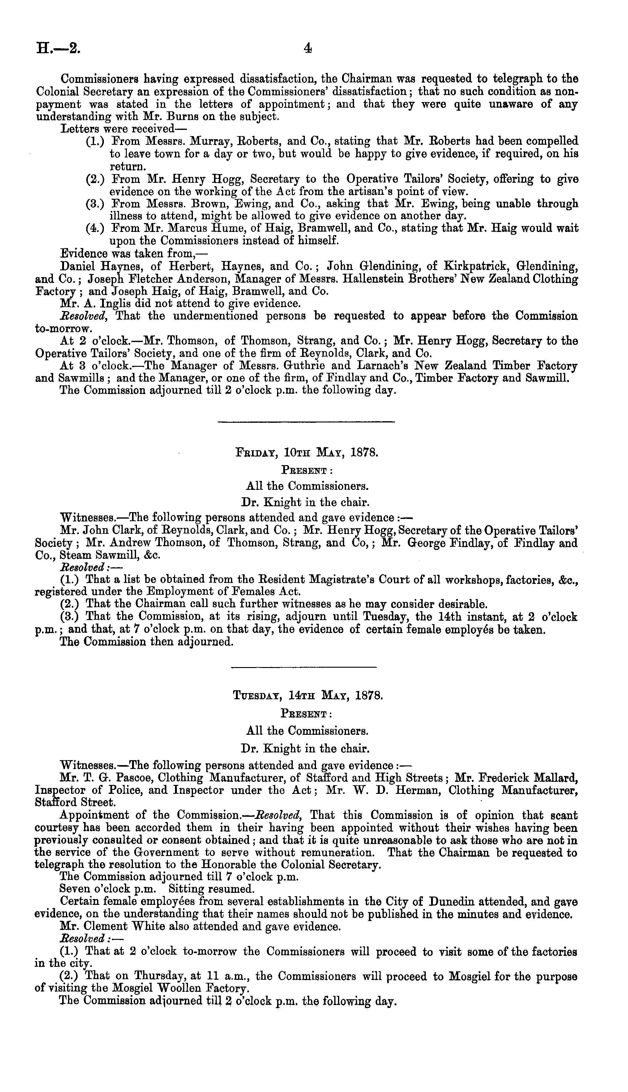 Tuesday, 14th May, 1878. Peesent: All the Commissioners. Dr. Knight in the chair. Witnesses.—The following persons attended and gave evidence : — Mr. T. G-. Pascoe, Clothing Manufacturer, of Stafford and High Streets; Mr. Frederick Mallard, Inspector of Police, and Inspector under the Act; Mr. W. D. Herman, Clothing Manufacturer, Stafford Street. Appointment of the Commission.— Resolved, That this Commission is of opinion that scant courtesy has been accorded them in their having been appointed without their wishes having been previously consulted or consent obtained ; and that it is quite unreasonable to ask those who are not in the service of the Government to serve without remuneration. That the Chairman be requested to telegraph the resolution to the Honorable the Colonial Secretary. The Commission adjourned till 7 o'clock p.m. Seven o'clock p.m. Sitting resumed. Certain female employees from several establishments in the City of Dunedin attended, and gave evidence, on the understanding that their names should not be published in the minutes and evidence. Mr. Clement "White also attended and gave evidence. Resolved: — (1.) That at 2 o'clock to-morrow the Commissioners will proceed to visit some of the factories in the city. (2.) That on Thursday, at 11 a.m., the Commissioners will proceed to Mosgiel for the purpose of visiting the Mosgiel Woollen Factory. The Commission adjourned till 2 o'clock p.m. the following day.