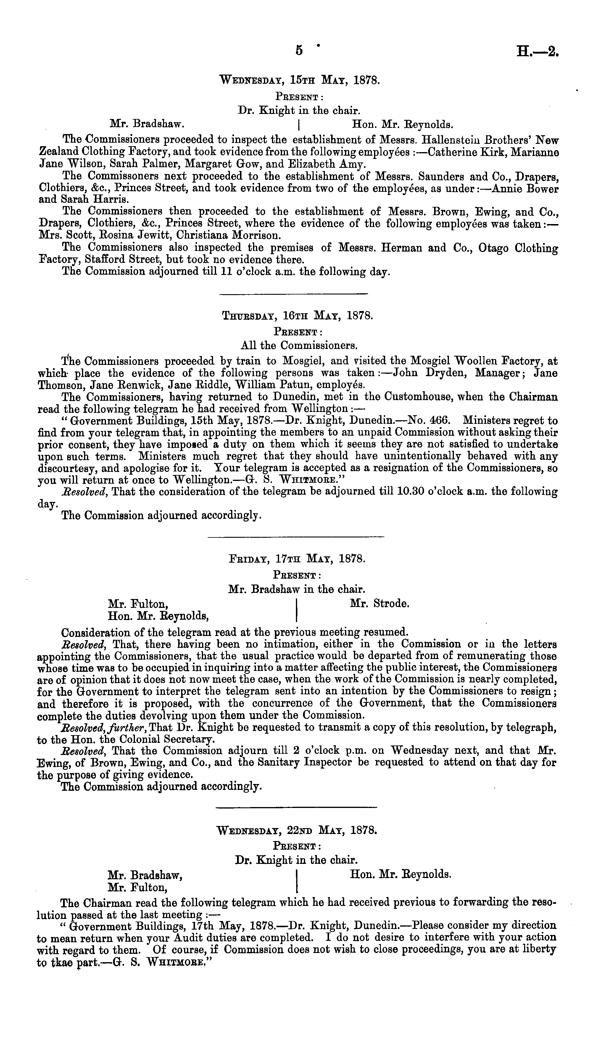 Thuesday, 16th May, 1878. Peesent: All the Commissioners. The Commissioners proceeded by train to Mosgiel, and visited the Mosgiel Woollen Factory, at which place the evidence of the following persons was taken: —John Dryden, Manager; Jane Thomson, Jane Renwick, Jane Riddle, William Patun, employes. The Commissioners, having returned to Dunedin, met in the Customhouse, when the Chairman read the following telegram he had received from Wellington:— " Government Buildings, 15th May, 1878. —Dr. Knight, Dunedin. —No. 466. Ministers regret to find from your telegram that, in appointing the members to an unpaid Commission without asking their prior consent, they have imposed a duty on them which it seems they are not satisfied to undertake upon such terms. Ministers much regret that they should have unintentionally behaved with any discourtesy, and apologise for it. Tour telegram is accepted as a resignation of the Commissioners, so you will return at once to Wellington.—G. S. Whitmoee." Resolved, That the consideration of the telegram be adjourned till 10.30 o'clock a.m. the following day. The Commission adjourned accordingly.