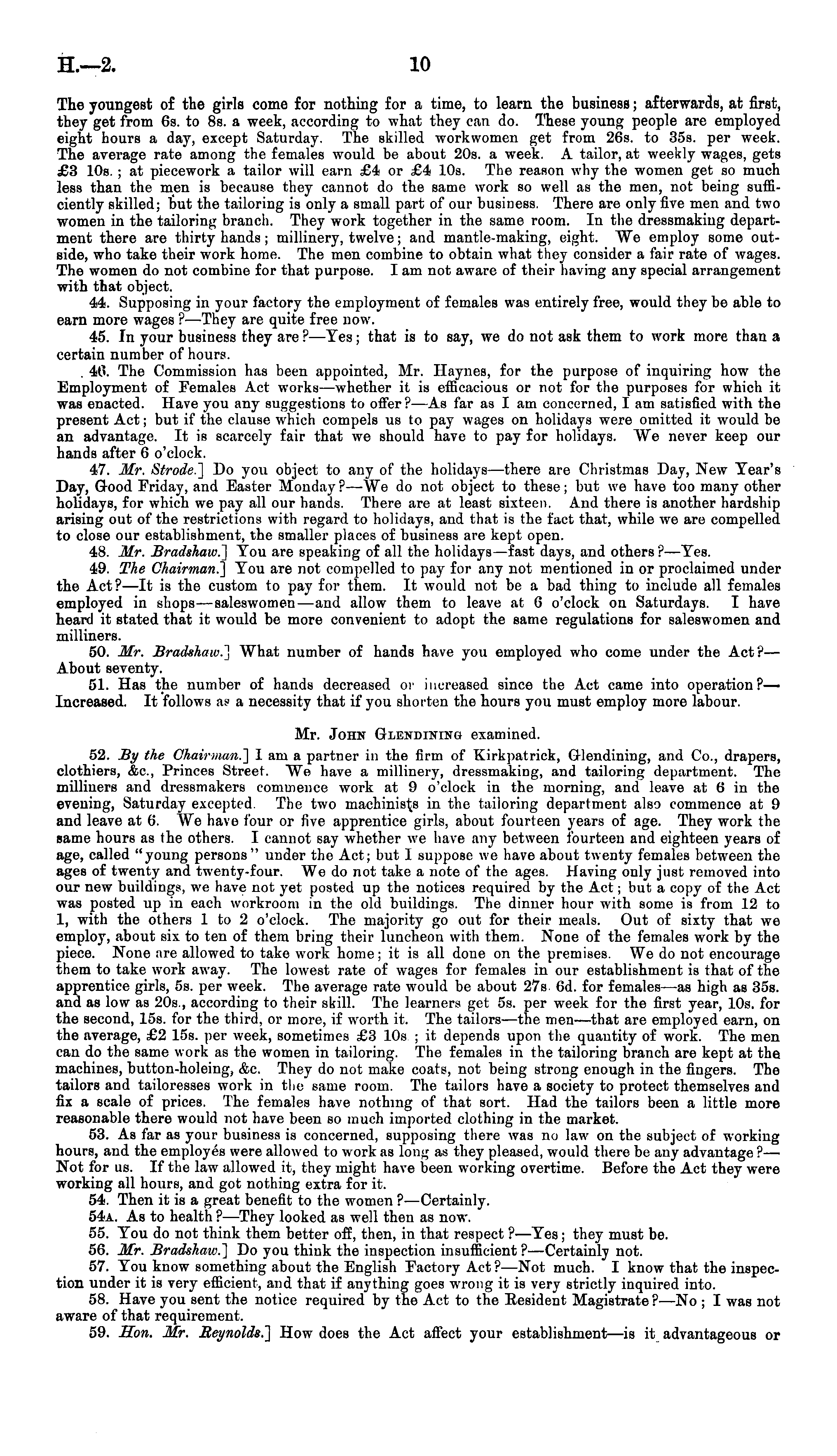 The youngest of the girls come for nothing for a time, to learn the business; afterwards, at first, they get from 6s. to Bs. a week, according to what they can do. These young people are employed eight hours a day, except Saturday. The skilled workwomen get from 265. to 355. per week. The average rate among the females would be about 20s. a week. A tailor, at weekly wages, gets £3 10s. ;at piecework a tailor will earn £4 or £4 10s. The reason why the women get so much less than the men is because they cannot do the same work so well as the men, not being sufficiently skilled; but the tailoring is only a small part of our business. There aro only five men and two women in the tailoring branch. They work together in the same room. In the dressmaking department there are thirty hands ; millinery, twelve; and mantle-making, eight. We employ some outside, who take their work home. The men combine to obtain what they consider a fair rate of wages. The women do not combine for that purpose. lam not aware of their having any special arrangement with that object. 44. Supposing in your factory the employment of females was entirely free, would they be able to earn more wages ?—They are quite free now. 45. In your business they are ?—Tes; that is to say, we do not ask them to work more than a certain number of hours. 46. The Commission has been appointed, Mr. Haynes, for the purpose of inquiring how the Employment of Females Act works—whether it is efficacious or not for the purposes for which it was enacted. Have you any suggestions to offer? —As far as lam concerned, lam satisfied with the present Act; but if the clause which compels us to pay wages on holidays were omitted it would be an advantage. It is scarcely fair that we should have to pay for holidays. We never keep our hands after 6 o'clock. 47. Mr. Strode.] Do you object to any of the holidays—there are Christmas Day, New Tear's Day, Good Friday, and Easter Monday? —-We do not object to these; but we have too many other holidays, for which we pay all our hands. There are at least sixteen. And there is another hardship arising out of the restrictions with regard to holidays, and that is the fact that, while we are compelled to close our establishment, the smaller places of business are kept open. 48. Mr. Bradshaw.] Tou are speaking of all the holidays—fast days, and others ?—Tes. 49. The Chairman^] Tou are not compelled to pay for any not mentioned in or proclaimed under the Act?—lt is the custom to pay for them. It would not be a bad thing to include all females employed in shops—saleswomen—and allow them to leave at 6 o'clock ou Saturdays. I have heard it stated that it would be more convenient to adopt the same regulations for saleswomen and milliners. 50. Mr. Bradshaw.] What number of hands have you employed who come under the Act?— About seventy. 51. Has the number of hands decreased or increased since the Act came into operation?— Increased. It follows as a necessity that if you shorten the hours you must employ more labour. Mr. John Glendining examined. 52. By the Chairman.] I am a partner in the firm of Kirkpatrick, Glendining, and Co., drapers, clothiers, &c, Princes Street. We have a millinery, dressmaking, and tailoring department. The milliners and dressmakers commence work at 9 o'clock in the morning, and leave at 6 in the evening, Saturday excepted The two machinists in the tailoring department also commence at 9 and leave at 6. We have four or five apprentice girls, about fourteen years of age. They work the same hours as the others. I cannot say whether we have any between fourteen and eighteen years of age, called "young persons" under the Act; but I suppose we have about twenty females between the ages of twenty and twenty-four. We do not take a note of the ages. Having only just removed into our new buildings, we have not yet posted up the notices required by the Act; but a copy of the Act was posted up in each workroom in the old buildings. The dinner hour with some is from 12 to 1, with the others 1 to 2 o'clock. The majority go out for their meals. Out of sixty that we employ, about six to ten of them bring their luncheon with them. None of the females work by the piece. None are allowed to take work home; it is all done on the premises. We do not encourage them to take work away. The lowest rate of wages for females in our establishment is that of the apprentice girls, ss. per week. The average rate would be about 27s Od. for females —as high as 355. and as low as 205., according to their skill. The learners get ss. per week for the first year, 10s. for the second, 15s. for the third, or more, if worth it. The tailors—the men—that are employed earn, on the average, £2 15s. per week, sometimes £3 10s ;it depends upon the quantity of work. The men can do the same work as the women in tailoring. The females in the tailoring branch are kept at the machines, button-holeing, &c. They do not make coats, not being strong enough in the fingers. The tailors and tailoresses work in tho same room. The tailors have a society to protect themselves and fix a scale of prices. The females have nothing of that sort. Had the tailors been a little more reasonable there would not have been so much imported clothing in the market. 53. As far as your business is concerned, supposing there was no law on the subject of working hours, and the employes were allowed to work as long as they pleased, would there be any advantage ?— Not for us. If the law allowed it, they might have been working overtime. Before the Act they were working all hours, and got nothing extra for it. 54. Then it is a great benefit to the women ? —Certainly. 54a. As to health ? —They looked as well then as now. 55. Tou do not think them better off, then, in that respect ?—Tes; they must be. 56. Mr. Bradshaw.] Do you think the inspection insufficient ?—Certainly not. 57. Tou know something about the English Factory Act ?—N