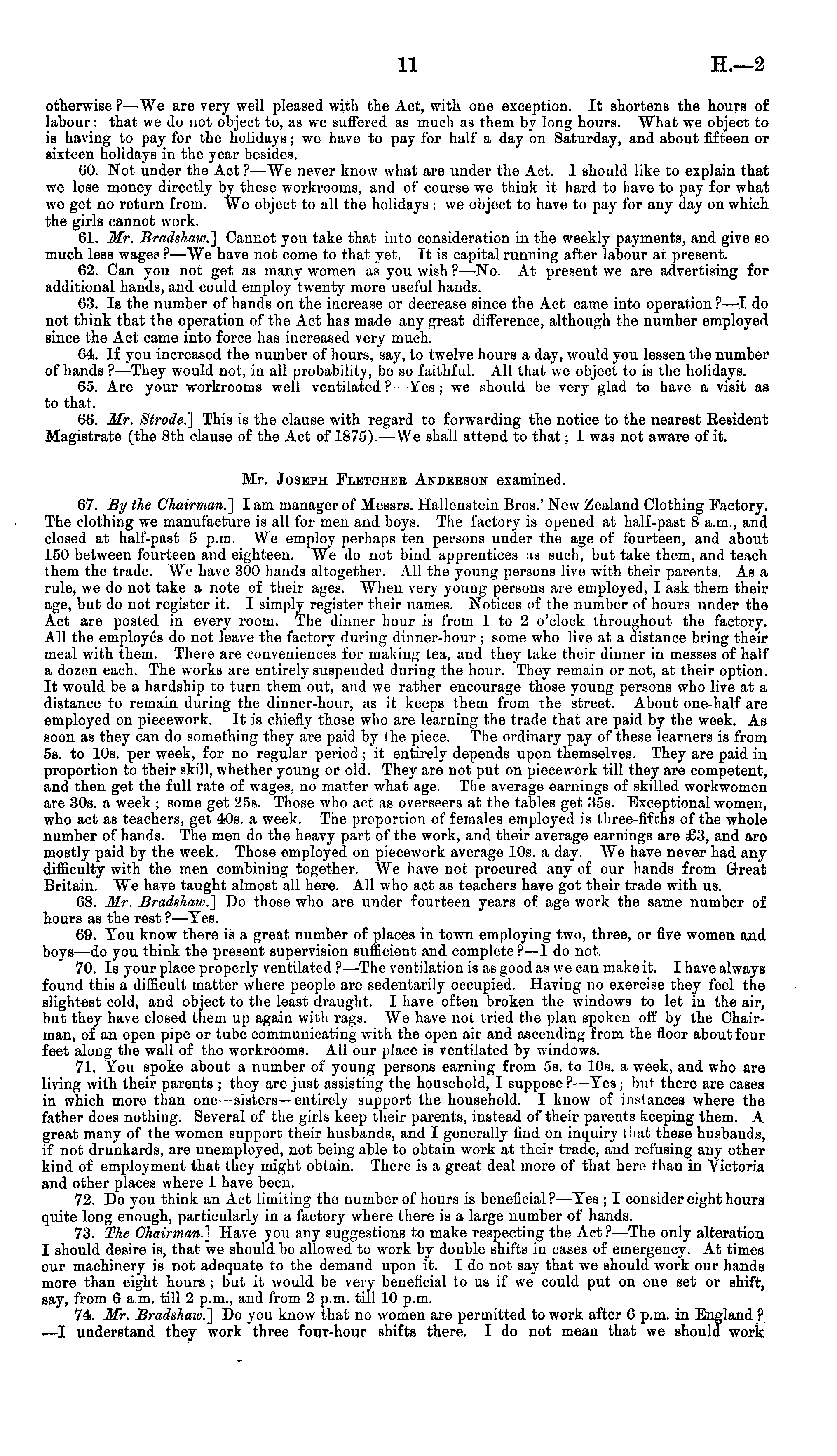 otherwise ? —We are very well pleased with the Act, with one exception. It shortens the hours of labour: that we do not object to, as we suffered as much as them by long hours. "What we object to is having to pay for the holidays; we have to pay for half a day on Saturday, and about fifteen or sixteen holidays in the year besides. 60. Not under the Act ? —We never know what are under the Act. I should like to explain that we lose money directly by these workrooms, and of course we think it hard to have to pay for what we get no return from. We object to all the holidays :we object to have to pay for any day on which the girls cannot work. 61. Mr. Bradshaw.] Cannot you take that into consideration in the weekly payments, and give so much less wages ?—We have not come to that yet. It is capital running after labour at present. 62. Can you not get as many women as you wish ? —No. At present we are advertising for additional hands, and could employ twenty more useful hands. 03. Is the number of hands on the increase or decrease since the Act came into operation ? —I do not think that the operation of the Act has made any great difference, although the number employed since the Act came into force has increased very much. 64. If you increased the number of hours, say, to twelve hours a day, would you lessen the number of hands ?—They would not, in all probability, be so faithful. All that we object to is the holidays. 65. Are your workrooms well ventilated ? —Yes ; we should be very glad to have a visit as to that. 66. Mr. Strode.] This is the clause with regard to forwarding the notice to the nearest Resident Magistrate (the Bth clause of the Act of 1875). —We shall attend to that; I was not aware of it. Mr. Joseph Fletcher Andebson examined. 67. By the Chairman.] lam manager of Messrs. Hallenstein Bros.' New Zealand Clothing Factory. The clothing we manufacture is all for men and boys. The factory is opened at half-past 8 a.m., and closed at half-past 5 p.m. We employ perhaps ten persons under the age of fourteen, and about 150 between fourteen and eighteen. We do not bind apprentices as such, but take them, and teach Ihem the trade. We have 300 hands altogether. All the young persons live with their parents. As a rule, we do not take a note of their ages. When very young persons are employed, I ask them their age, but do not register it. I simply register their names. Notices of the number of hours under tho Act are posted in every room. The dinner hour is from 1 to 2 o'clock throughout the factory. All the employes do not leave the factory during dinner-hour; some who live at a distance bring their meal with them. There are conveniences for making tea, and they take their dinner in messes of half a dozen each. The works are entirely suspended during the hour. They remain or not, at their option. It would be a hardship to turn them out, and we rather encourage those young persons who live at a distance to remain during the dinner-hour, as it keeps them from the street. About one-half are employed on piecework. It is chiefly those who are learning the trade that are paid by the week. As soon as they can do something they are paid by the piece. The ordinary pay of these learners is from ss. to 10s. per week, for no regular period ; it entirely depends upon themselves. They are paid in proportion to their skill, whether young or old. They are not put on piecework till they are competent, and then get the full rate of wages, no matter what age. The average earnings of skilled workwomen are 30s. a week ; some get 255. Those who act as overseers at the tables get 355. Exceptional women, who act as teachers, get 40s. a week. The proportion of females employed is three-fifths of the whole number of hands. The men do the heavy part of the work, and their average earnings are £3, and are mostly paid by the week. Those employed on piecework average 10s. a day. We have never had any difficulty with the men combining together. We have not procured any of our hands from Great Britain. We have taught almost all here. All who act as teachers have got their trade with us. 68. Mr. Bradshaw.] Do those who are under fourteen years of age work the same number of hours as the rest ? —Tes. 69. Tou know there is a great number of places in town employing two, three, or five women and boys —do you think the present supervision sufficient and complete? —I do not. 70. Is your place properly ventilated ?—The ventilation is as good as we can make it. I have always found this a difficult matter where people are sedentarily occupied. Having no exercise they feel the slightest cold, and object to the least draught. I have often broken the windows to let in the air, but they have closed them up again with rags. We have not tried the plan spoken off by the Chairman, of an open pipe or tube communicating with the open air and ascending from the floor about four feet along the wall of the workrooms. All our place is ventilated by windows. 71. Tou spoke about a number of young persons earning from ss. to 10s. a week, and who are living with their parents ; they are just assisting the household, I suppose ?—Tes ; but there are cases in which more than one —sisters —entirely support the household. I know of instances where the father does nothing. Several of the girls keep their parents, instead of their parents keeping them. A great many of the women support their husbands, and I generally find on inquiry that these husbands, if not drunkards, are unemployed, not being able to obtain work at their trade, and refusing any other kind of employment that they might obtain. There is a great deal more of that here than in Victoria and other places where I have been. 72. Do you think an Act limiting the number of hours is beneficial? —Tes ; I consider eight hours quite long enough, particularly in a factory where there is a large number of hands. 73. The Chairman.] Have you any suggestions to make res