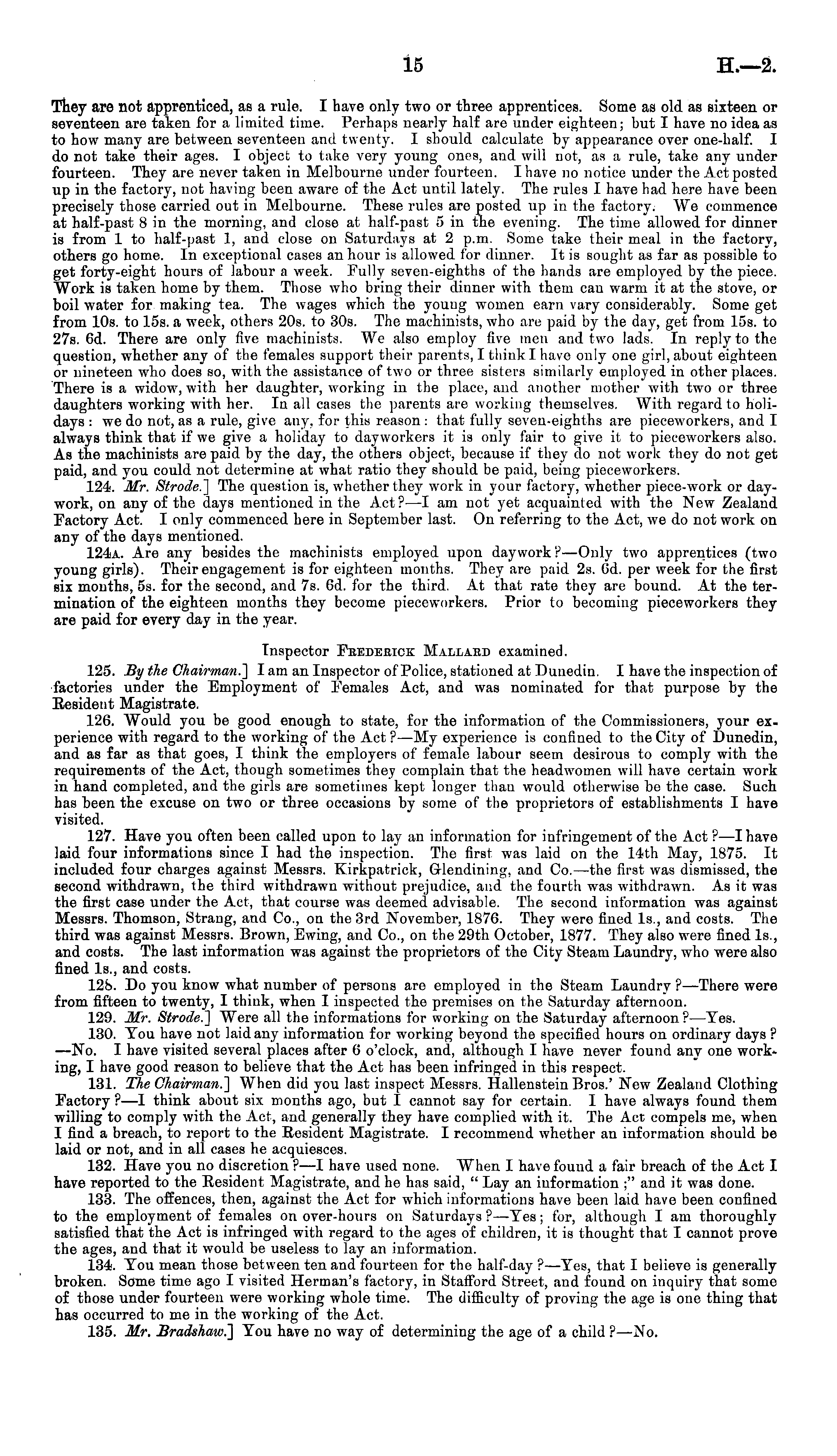 They are not apprenticed, as a rule. I have only two or three apprentices. Some as old as sixteen or seventeen are taken for a limited time. Perhaps nearly half are under eighteen; but I have no idea as to how many are between seventeen and twenty. I should calculate by appearance over one-half. I do not take their ages. I object to take very young ones, and will not, as a rule, take any under fourteen. They are never taken in Melbourne under fourteen. I have no notice under the Act posted up in the factory, not having been aware of the Act until lately. The rules I have had here have been precisely those carried out iv Melbourne. These rules are posted up in the factory. We commence at half-past Bin the morning, and close at half-past sin the evening. The time allowed for dinner is from 1 to half-past 1, and close on Saturdays at 2 p.m. Some take their meal in the factory, others go home. In exceptional cases an hour is allowed for dinner. It is sought as far as possible to get forty-eight hours of labour a week. Fully seven-eighths of the hands are employed by the piece. Work is taken home by them. Those who bring their diuner with them can warm it at the stove, or boil water for making tea. The wages which the young women earn vary considerably. Some get from 10s. to 15s. a week, others 20s. to 30s. The machinists, who are paid by the day, get from 15s. to 275. Gd. There are only five machinists. We also employ five men and two lads. In reply to the question, whether any of the females support their parents, I think I have only one girl, about eighteen or nineteen who does so, with the assistance of two or three sisters similarly employed in other places. There is a widow, with her daughter, working in the place, and another mother with two or three daughters working with her. In all cases the parents are working themselves. With regard to holidays :we do not, as a rule, give any, for this reason: that fully seven-eighths are pieceworkers, and I always think that if we give a holiday to dayworkers it is only fair to give if to pieceworkers also. As the machinists are paid by the day, the others object, because if they do not work they do not get paid, and you could not determine at what ratio they should be paid, being pieceworkers. 124. Mr. Strode.] The question is, whether they work in your factory, whether piece-work or daywork, on any of the days mentioned in the Act?—l am not yet acquainted with the New Zealand Factory Act. I only commenced here in September last. On referring to the Act, we do not work on any of the days mentioned. 124 a. Are any besides the machinists employed upou day work ?—Only two apprentices (two young girls). Their engagement is for eighteen months. They are paid 2s. Gd. per week for the first six months, ss. for the second, and 7s. Gd. for the third. At that rate they are bound. At the termination of the eighteen months they become pieceworkers. Prior to becoming pieceworkers they are paid for every day in the year. Inspector Frederick Mallard examined. 125. By the Chairman.] lam an Inspector of Police, stationed at Dunedin. I have the inspection of factories under the Employment of Females Act, and was nominated for that purpose by the Eesident Magistrate. 126. Would you be good enough to state, for the information of the Commissioners, your experience with regard to the working of the Act? —My experience is confined to the City of Dunedin, and as far as that goes, I think the employers of female labour seem desirous to comply with the requirements of the Act, though sometimes they complain that the headwomen will have certain work in hand completed, and the girls aro sometimes kept longer thau would otherwise be the case. Such has been the excuse on two or three occasions by some of the proprietors of establishments I have visited. 127. Have you often been called upon to lay an information for infringement of the Act ?—I have laid four informations since I had the inspection. The first was laid on the 14th May, 1875. It included four charges against Messrs. Kirkpatrick, Glendining, and Co. —the first was dismissed, the second withdrawn, the third withdrawn without prejudice, and the fourth was withdrawn. As it was the first case under the Act, that course was deemed advisable. The second information was against Messrs. Thomson, Strang, and Co., on the 3rd November, 1876. They were fined Is., and costs. The third was against Messrs. Brown, Ewing, and Co., on the 29th October, 1877. They also were fined Is., and costs. The last information was against the proprietors of the City Steam Laundry, who were also fined Is., and costs. 128. Do you know what number of persons are employed in the Steam Laundry ? —There were from fifteen to twenty, I think, when I inspected the premises on the Saturday afternoon. 129. Mr. Strode.] Were all the informations for working on the Saturday afternoon ? —Yes. 130. Tou have not laid any information for working beyond the specified hours on ordinary days ? —No. I have visited several places after 6 o'clock, and, although I have never found any one working, I have good reason to believe that the Act has been infringed in this respect. 131. The Chairman.] When did you last inspect Messrs. Hallenstein Bros.' New Zealand Clothing Factory ?—I think about six months ago, but 1 cannot say for certain. I have always found them willing to comply with the Act, and generally they have complied with it. The Act compels me, when I find a breach, to report to the Resident Magistrate. I recommend whether an information should be laid or not, and in all cases he acquiesces. 132. Have you no discretion ? —I have used none. When I have found a fair breach of the Act I have reported to the Eesident Magistrate, and he has said, " Lay an information ;" and it was done. 133. The offences, then, against the Act for w-hich informations have been laid have been confined to the employment of females on over-hours on Saturdays?—