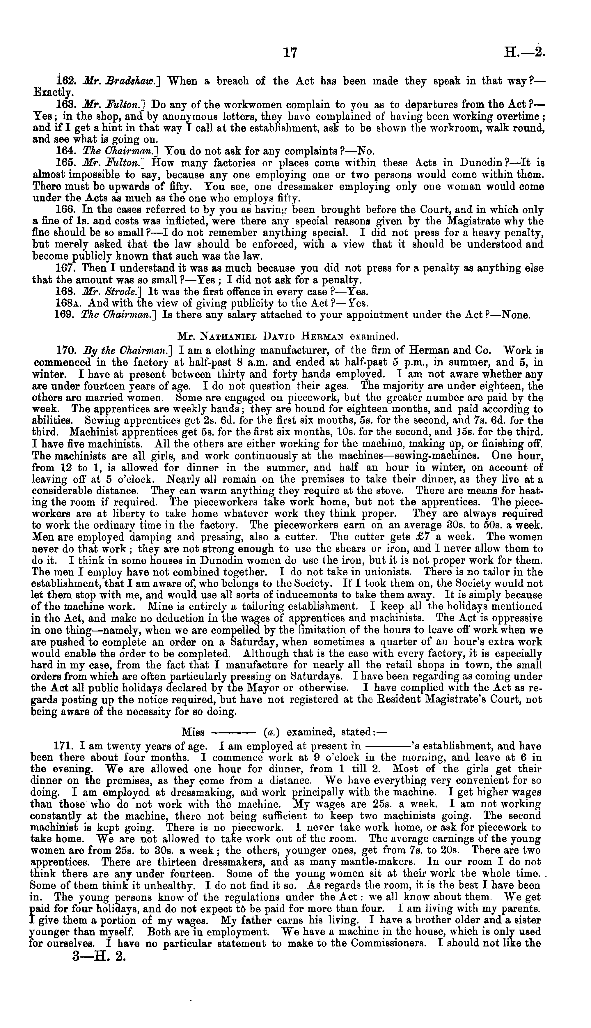 162. Mr. Bradshaw.] When a breach of the Act has been made they speak in that way ?— Exactly. 163. Mr. Fulton.] Do any of the workwomen complain to you as to departures from the Act ?— Tes ; in the shop, and by anonymous letters, they have complained of having been working overtime ; and if I get a hint in that way I call at the establishment, ask to be shown the workroom, walk round, and see what is going on. 164. The Chairman.] Tou do not ask for any complaints ? —No. 165. Mr. Fulton.] flow many factories or places come within these Acts in Dunedin?—lt is almost impossible to say, because any one employing one or two persons would come within them. There must be upwards of fifty. Tou see, one dressmaker employing only one woman would come under the Acts as much as the one who employs fifty. 166. In the cases referred to by you as havinu been brought before the Court, and in which only a fine of Is. aud costs was inflicted, were there any special reasons given by the Magistrate why the fine should be so small ? —I do not remember anything special. I did not press for a heavy penalty, but merely asked that the law should be enforced, with a view that it should be understood and become publicly known that such was the law. 167. Then I understand it was as much because you did not press for a penalty as anything else that the amount was so small ?—Tes ; I did not ask for a penalty. 168. Mr. Strode.] It was the first offence in every case ?—Tes. 168 a. And with the view of giving publicity to the Act ? —Tes. 169. The Chairman.] Is there any salary attached to your appointment under the Act? —None. Mr. Nathaniel David Herman examined. 170. By the Chairman.] lam a clothing manufacturer, of the firm of Herman and Co. Work is commenced in the factory at half-past 8 a.m. and ended at half-past 5 p.m., in summer, and 5, in winter. I have at present between thirty and forty hands employed. I am not aware whether any are under fourteen years of age. Ido not question their ages. The majority are under eighteen, the others are married women. Some are engaged on piecework, but the greater number are paid by the week. The apprentices are weekly hands; they are bound for eighteen months, and paid according to abilities. Sewing apprentices get 2s. 6d. for the first six months, ss. for the second, and 7s. 6d. for the third. Machinist apprentices get ss. for the first six months, 10s. for the second, and 15s. for the third. I have five machinists. All the others are either working for the machine, making up, or finishing off. The machinists are all girls, aud work continuously at the machines —sewing-machines. One hour, from 12 to 1, is allowed for dinner in the summer, and half an hour in winter, on account of leaving off at 5 o'clock. Nearly all remain on the premises to take their dinner, as they live at a considerable distance. They can warm anything they require at the stove. There are means for heating the room if required. The pieceworkers take work home, but not the apprentices. The pieceworkers are at liberty to take home whatever work they think proper. They are always required to work the ordinary time in the factory. The pieceworkers earn on an average 30s. to 50s. a week. Men are employed damping and pressing, also a cutter. The cutter gets £7 a week. The women never do that work ; they are not strong enough to use the shears or iron, and I never allow them to do it. I think in some houses in Dunedin women do use the iron, hut it is not proper work for them. The men I employ have not combined together. I do not take in unionists. There is no tailor in the establishment, that lam aware of, who belongs to the Society. If I took them on, the Society would not let them stop with me, and would use all sorts of inducements to take them away. It is simply because of the machine work. Mine is entirely a tailoring establishment. I keep all the holidays mentioned in the Act, and make no deduction in the wages of apprentices and machinists. The Act is oppressive in one thing—namely, when we are compelled by the limitation of the hours to leave off work when we are pushed to complete an order on a Saturday, when sometimes a quarter of an hour's extra work would enable the order to be completed. Although that is the case with every factory, it is especially hard in my case, from the fact that I manufacture for nearly all the retail shops in town, the small orders from which are often particularly pressing on Saturdays. I have been regarding as coming under the Act all public holidays declared by the Mayor or otherwise. I have complied with the Act as regards posting up the notice required, but have not registered at the Resident Magistrate's Court, not being aware of the necessity for so doing. Miss (a.) examined, stated:— 171. lam twenty years of age. lam employed at present in 's establishment, and have been there about four months. I commence work at 9 o'clock in the morning, and leave at 6 in the evening. We are allowed one hour for dinner, from 1 till 2. Most of the girls get their dinner on the premises, as they come from a distance. We have everything very convenient for so doing. I am employed at dressmaking, and work principally with the machine. I get higher wages than those who do not work with the machine. My wages are 255. a week. lam not working constantly at the machine, there not being sufficient to keep two machinists going. The second machinist is kept going. There is no piecework. I never take work home, or ask for piecework to take home. We are not allowed to take work out of the room. The average earnings of the young women are from 255. to 30s. a week; the others, younger ones, get from 7s. to 20s. There are two apprentices. There are thirteen dressmakers, and as many mantle-makers. In our room I do not think there are any under fourteen. Some of the young women sit at their work the whole time. Some of them think it unhealthy. Ido not find it so. As regards t
