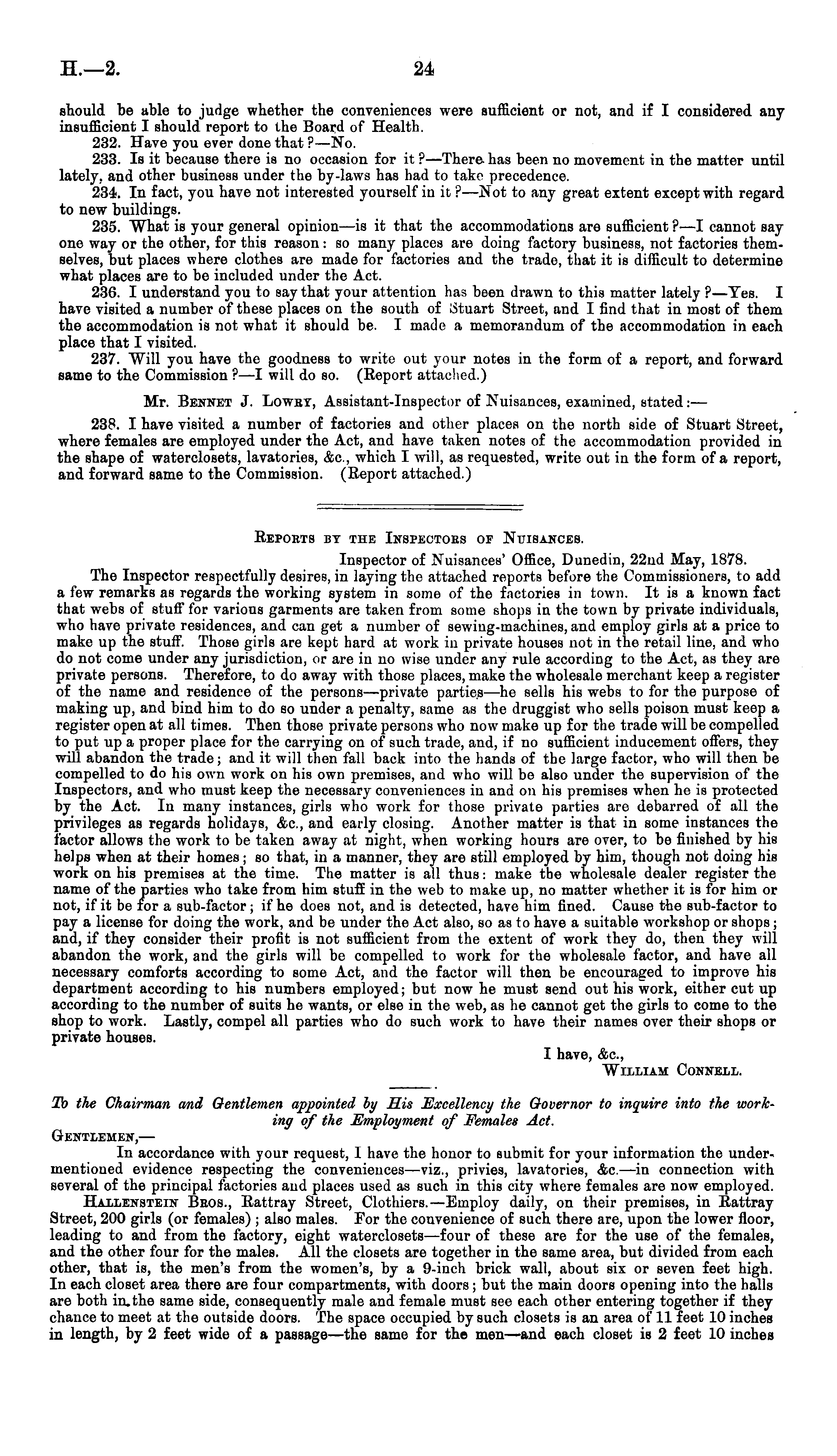 Bepoets by the Inspectoes of Nuisances. Inspector of Nuisances' Office, Dunedin, 22nd May, 1878. The Inspector respectfully desires, in laying the attached reports before the Commissioners, to add a few remarks as regards the working system in some of the factories in town. It is a known fact that webs of stuff for various garments are taken from some shops in the town by private individuals, who have private residences, and can get a number of sewing-machines, and employ girls at a price to make up the stuff. Those girls are kept hard at work in private houses not in the retail line, and who do not come under any jurisdiction, or are in no wise under any rule according to the Act, as they are private persons. Therefore, to do away with those places, make the wholesale merchant keep a register of the name and residence of the persons —private parties —he sells his webs to for the purpose of making up, and bind him to do so under a penalty, same as the druggist who sells poison must keep a register open at all times. Then those private persons who now make up for the trade will be compelled to put up a proper place for the carrying on of such trade, and, if no sufficient inducement offers, they will abandon the trade; and it will tiien fall back into the hands of the large factor, who will then be compelled to do his own work on his own premises, and who will be also under the supervision of the Inspectors, and who must keep the necessary conveniences in and on his premises when he is protected by the Act. In many instances, girls who work for those private parties are debarred of all the privileges as regards holidays, &c, and early closing. Another matter is that in some instances the factor allows the work to be taken away at night, when working hours are over, to be finished by his helps when at their homes ; so that, in a manner, they are still employed by him, though not doing his work on his premises at the time. The matter is all thus: make the wholesale dealer register the name of the parties who take from him stuff in the web to make up, no matter whether it is for him or not, if it be for a sub-factor; if he does not, and is detected, have him fined. Cause the sub-factor to pay a license for doing the work, and be under the Act also, so as to have a suitable workshop or shops ; and, if they consider their profit is not sufficient from the extent of work they do, then they will abandon the work, and the girls will be compelled to work for the wholesale factor, and have all necessary comforts according to some Act, and the factor will then be encouraged to improve his department according to his numbers employed; but now he must send out his work, either cut up according to the number of suits he wants, or else in the web, as he cannot get the girls to come to the shop to work. Lastly, compel all parties who do such work to have their names over their shops or private houses. I have, &c, William Connell. To the Chairman and Gentlemen appointed by His Excellency the Governor to inquire into the working of the Employment of Females Act. Gentlemen, — In accordance with your request, I have the honor to submit for your information the undermentioned evidence respecting the conveniences—viz., privies, lavatories, &c.—in connection with several of the principal factories aud places used as such in this city where females are now employed. Hallenstein Beos., Eattray Street, Clothiers.—Employ daily, on their premises, in Eattray Street, 200 girls (or females); also males. For the convenience of such there are, upon the lower floor, leading to and from the factory, eight waterclosets —four of these are for the use of the females, and the other four for the males. All the closets are together in the same area, but divided from each other, that is, the men's from the women's, by a 9-inch brick wall, about six or seven feet high. In each closet area there are four compartments, with doors; but the main doors opening into the halls are both in. tho same side, consequently male and female must see each other entering together if they chance to meet at the outside doors. The space occupied by such closets is an area of 11 feet 10 inches in length, by 2 feet wide of a passage—the same for the men—and each closet is 2 feet 10 inches