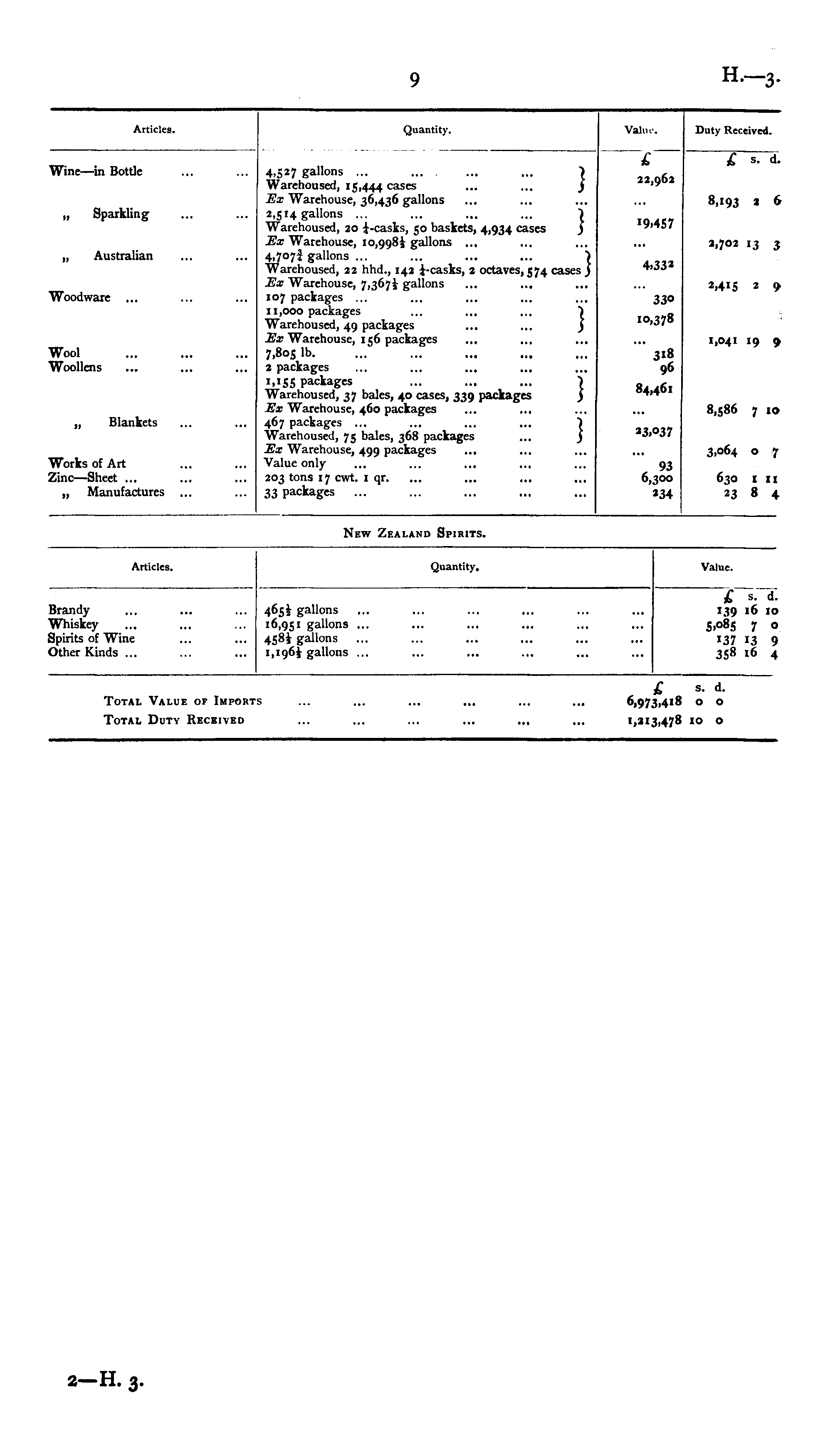 Articles. Quantity. Value. Duty Received. Wine—in Bottle 4,527 gallons ... ... 1 Warehoused, 15,444 cases ... ... y Ex Warehouse, 36,436 gallons 2,514 gallons ... ... ... ... I Warehoused, 20 i-casks, 50 baskets, 4,934 cases j Ex Warehouse, 10,998! gallons ... 4>7o72 gallons ... ... ... ... "> Warehoused, 22 hhd., 142 i-casks, 2 octaves, 574 cases j Ex Warehouse, 7,367! gallons 107 packages ... 11,000 packages ... ... ... \ Warehoused, 49 packages ... ... j Ex Warehouse, 156 packages 7,805 lb 2 packages 1,155 packages ... ... ... "j Warehoused, 37 bales, 40 cases, 339 packages j Ex Warehouse, 460 packages 467 packages ... ... ... ... I Warehoused, 75 bales, 368 packages ... j Ex Warehouse, 499 packages ... Value only 203 tons 17 cwt. 1 qr. 33 packages £ £ s. d. 22,962 8,193 * 6 „ Sparkling 19,457 „ Australian 2,702 13 3 4,332 Woodware ... 2,415 2 9 330 10,378 Wool Woollens 318 96 84,461 1,041 19 9 „ Blankets 8,586 7 10 23,037 3,064 o 7 Works of Art Zinc—Sheet ... „ Manufactures 93 6,300 234 630 1 11 23 8 4 New Zealand Spirits. Articles. Quantity. Value. Brandy Whiskey Spirits of Wine Other Kinds ... 465! gallons ... 16,951 gallons ... 458J gallons ... 1,196! gallons ... £ s- &• 139 16 10 5,o85 7 o 137 13 9 358 16 4 Total Value of Imports 6,97. £ s. d. 3,4i8 o o Total Duty Received i,«. 3,478 IO O