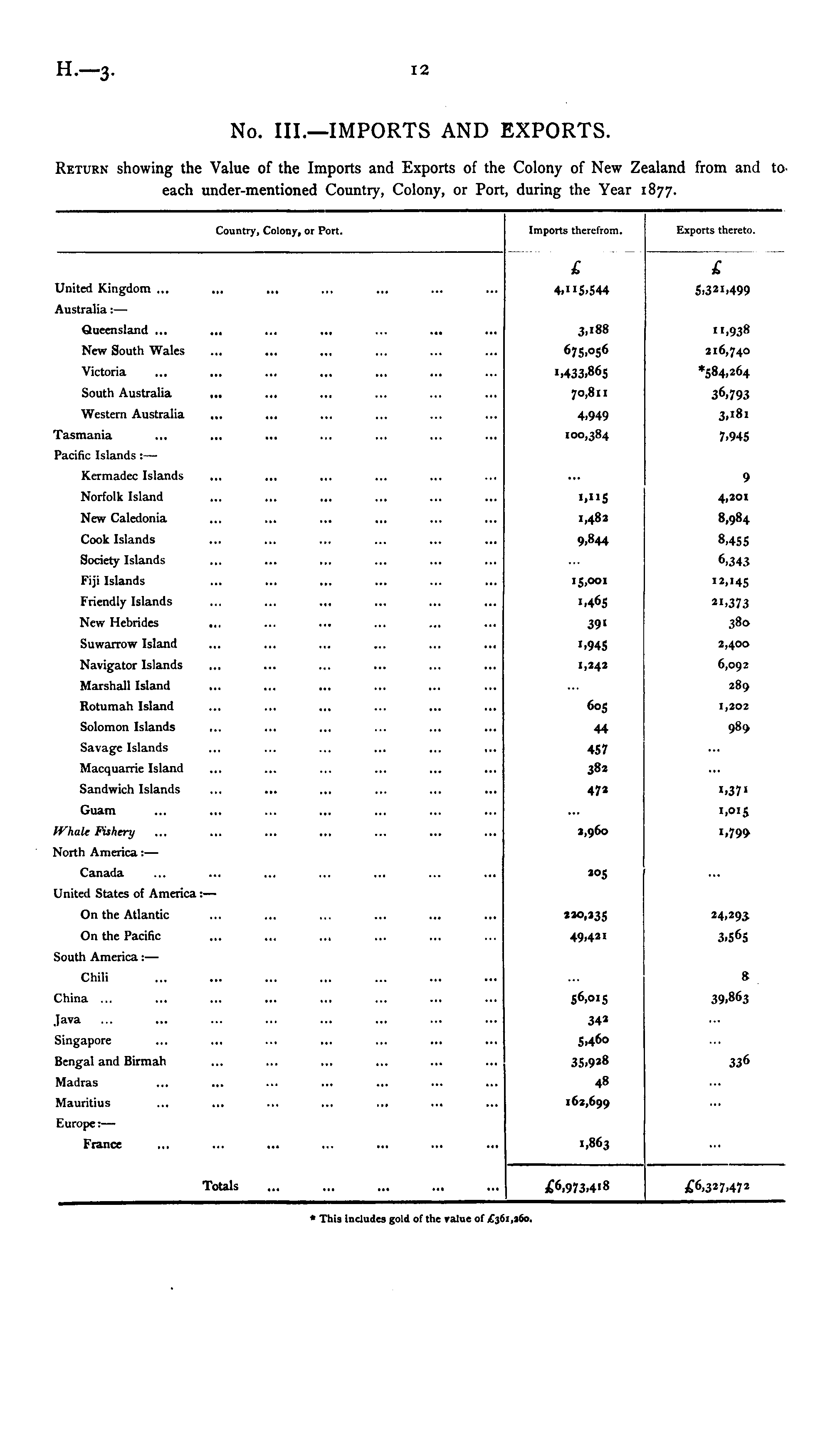 No. III.—IMPORTS AND EXPORTS. RETURN showing the Value of the Imports and Exports of the Colony of New Zealand from and to each under-mentioned Country, Colony, or Port, during the Year 1877.