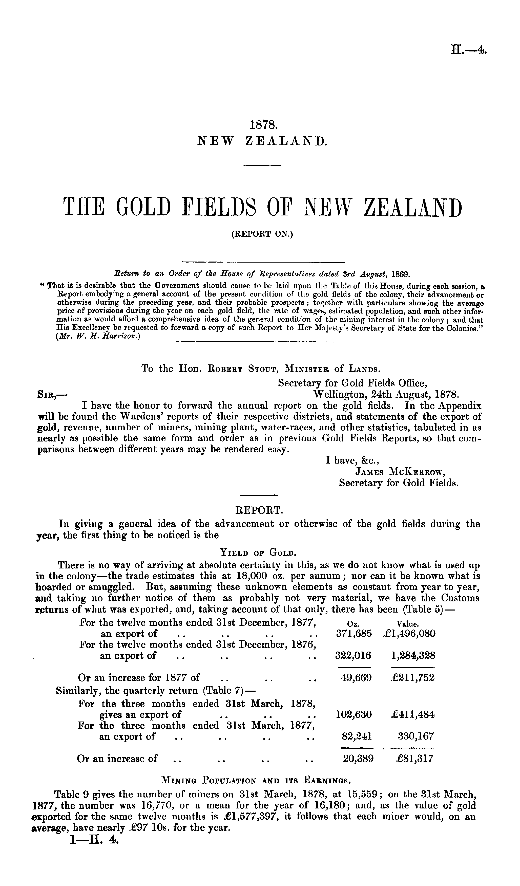 Meturn to an Order of the House of Representatives dated 3rd August, 1869. " That it is desirable that the Government should cause to be laid upon the Table of this House, during each session, a, Report embodying a general account of tbe present condition of the gold fields of the colony, their advancement or otherwise during the preceding year, and their probable prospects ; together with particulars showing the average price of provisions during the year on each gold field, the rate of wages, estimated population, and such other information as would afford a comprehensive idea of the general condition of the mining interest in the colony; and that His Excellency be requested to forward a copy of such Report to Her Majesty's Secretary of State for the Colonies." (Mr. W. H. Harrison.) To the Hon. Bobert Stout, Minister of Lands. Secretary for Gold Fields Office, Sir,— Wellington, 24th August, 1878. I have the honor to forward the annual report on the gold fields. In the Appendix will be found the Wardens' reports of their respective districts, and statements of the export of gold, revenue, number of miners, mining plant, water-races, and other statistics, tabulated in as nearly as possible the same form and order as in previous Gold Fields Eeports, so that comparisons between different years may be rendered easy. I have, &c, James McKehrow, Secretary for Gold Fields. REPOET. In giving a general idea of the advancement or otherwise of the gold fields during the year, the first thing to be noticed is the Tield of Gold. There is no way of arriving at absolute certainty in this, as we do not know what is used up in the colony—the trade estimates this at 18,000 oz. per annum; nor can it be known what is hoarded or smuggled. But, assuming these unknown elements as constant from year to year, and taking no further notice of them as probably not very material, we have the Customs returns of what was exported, and, taking account of that only, there has been (Table 5) — For the twelve months ended 31st December, 1877, Oz. Value, an export of .. .. .. .. 371,685 £1,496,080 For the twelve months ended 31st December, 1876, an export of .. .. .. 322,016 1,284,328 Or an increase for 1877 of .. .. .. 49,669 £211,752 Similarly, the quarterly return (Table 7) — For the three months ended 31st March, 1878, gives an export of .. .. .. 102,630 £411,484 For the three months ended 31st March, 1877, an export of .. .. .. 82,241 330,167 Or an increase of .. .. .. .. 20,389 £81,317 Mining Population and its Earnings. Table 9 gives the number of miners on 31st March, 1878, at 15,559; on the 31st March, 1877, the number was 16,770, or a mean for the year of 16,180; and, as the value of gold exported for the same twelve months is £1,577,397, it follows that each miner would, on an average, have nearly £97 10s. for the year. I—H. 4."