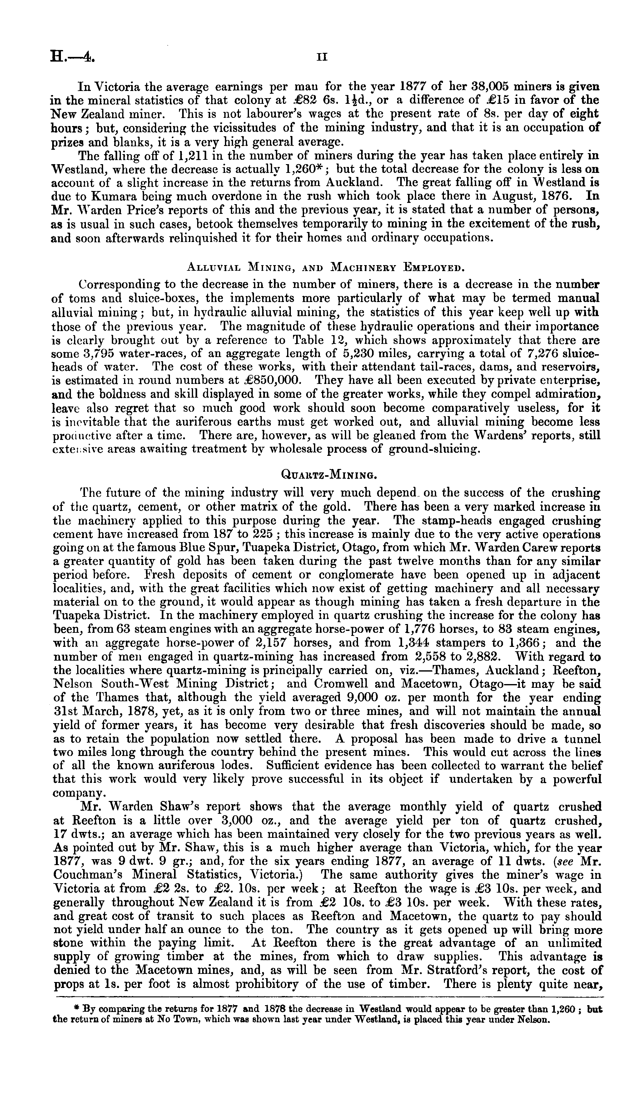 In A'ictoria the average earnings per man for the year 1877 of her 38,005 miners is given in the mineral statistics of that colony at £82 6s. l^d., or a difference of £15 in favor of the New Zealand miner. This is not labourer's wages at the present rate of Bs. per day of eight hours; but, considering the vicissitudes of the mining industry, and that it is an occupation of prizes and blanks, it is a very high general average. The falling off of 1,211 in the number of miners during the year has taken place entirely in Westland, where the decrease is actually 1,260*; but the total decrease for the colony is less on account of a slight increase in the returns from Auckland. The great falling off in AVestland is due to Kumara being much overdone in the rush which took place there in August, 1876. In Mr. AVarden Price's reports of this and the previous year, it is stated that a number of persons, as is usual in such cases, betook themselves temporarily to mining in the excitement of the rush, and soon afterwards relinquished it for their homes and ordinary occupations. Alluvial Mining, and Machinery Employed. Corresponding to the decrease in the number of miners, there is a decrease in the number of toms and sluice-boxes, the implements more particularly of what may be termed manual alluvial mining; but, in hydraulic alluvial mining, the statistics of this year keep well up with those of the previous year. The magnitude of these hydraulic operations and their importance is clearly brought out by a reference to Table 12, which shows approximately that there are some 3,795 water-races, of an aggregate length of 5,230 miles, carrying a total of 7,276 sluiceheads of water. The cost of these works, with their attendant tail-races, dams, and reservoirs, is estimated in round numbers at £850,000. They have all been executed by private enterprise, and the boldness and skill displayed in some of the greater works, while they compel admiration, leave also regret that so much good work should soon become comparatively useless, for it is inevitable that the auriferous earths must get worked out, and alluvial mining become less productive after a time. There are, however, as will be gleaned from the A\ rardens' reports, still extei:sive areas awaiting treatment by wholesale process of ground-sluicing. Quartz-Mining. The future of the mining industry will very much depend on the success of the crushing of the quartz, cement, or other matrix of the gold. There has been a very marked increase iv the machinery applied to this purpose during the year. The stamp-heads engaged crushing cement have increased from 187 to 225 ; this increase is mainly due to the very active operations going on at the famous Blue Spur, Tuapeka District, Otago, from which Mr. AVarden Carew reports a greater quantity of gold has been taken during the past twelve months than for any similar period before. Fresh deposits of cement or conglomerate have been opened up in adjacent localities, and, with the great facilities which now exist of getting machinery and all necessary material on to the ground, it would appear as though mining has taken a fresh departure in the Tuapeka District. In the machinery employed in quartz crushing the increase for the colony has been, from 63 steam engines with an aggregate horse-power of 1,776 horses, to 83 steam engines, with an aggregate horse-power of 2,157 horses, and from 1,344 stampers to 1,366; and the number of men engaged in quartz-mining has increased from 2,558 to 2,882. With regard to the localities where quartz-mining is principally carried on, viz.—Thames, Auckland; Reefton, Nelson South-AVest Mining District; and Cromwell and Macetown, Otago—it may be said of the Thames that, although the yield averaged 9,000 oz. per month for the year ending 31st March, 1878, yet, as it is only from two or three mines, and will not maintain the annual yield of former years, it has become very desirable that fresh discoveries should be made, so as to retain the population now settled there. A proposal has been made to drive a tunnel two miles long through the country behind the present mines. This would cut across the lines of all the known auriferous lodes. Sufficient evidence has been collected to warrant the belief that this work would very likely prove successful in its object if undertaken by a powerful company. Mr. AVarden Shaw's report shows that the average monthly yield of quartz crushed at Reefton is a little over 3,000 oz., and the average yield per ton of quartz crushed, 17 dwts.; an average which has been maintained very closely for the two previous years as well. As pointed out by Mr. Shaw, this is a much higher average than Victoria, which, for the year 1877, was 9 dwt. 9 gr.; and, for the six years ending 1877, an average of 11 dwts. (see Mr. Couchman's Mineral Statistics, A^ictoria.) The same authority gives the miner's wage in Victoria at from £2 2s. to £2. 10s. per week; at Reefton the wage is £3 10s. per week, and generally throughout New Zealand it is from £2 10s. to £3 10s. per week. With these rates, and great cost of transit to such places as Reefton and Macetown, the quartz to pay should not yield under half an ounce to the ton. The country as it gets opened up will bring more stone within the paying limit. At Reefton there is the great advantage of an unlimited supply of growing timber at the mines, from which to draw supplies. This advantage is denied to the Macetown mines, and, as will be seen from Mr. Stratford's report, the cost of props at Is. per foot is almost prohibitory of the use of timber. There is plenty quite near, * By comparing the returns for 1877 and 1878 the decrease in Westland would appear to be greater than 1,260 ; but the return of miners at No Town, which was shown last year under Westland, is placed this year under Nelson.