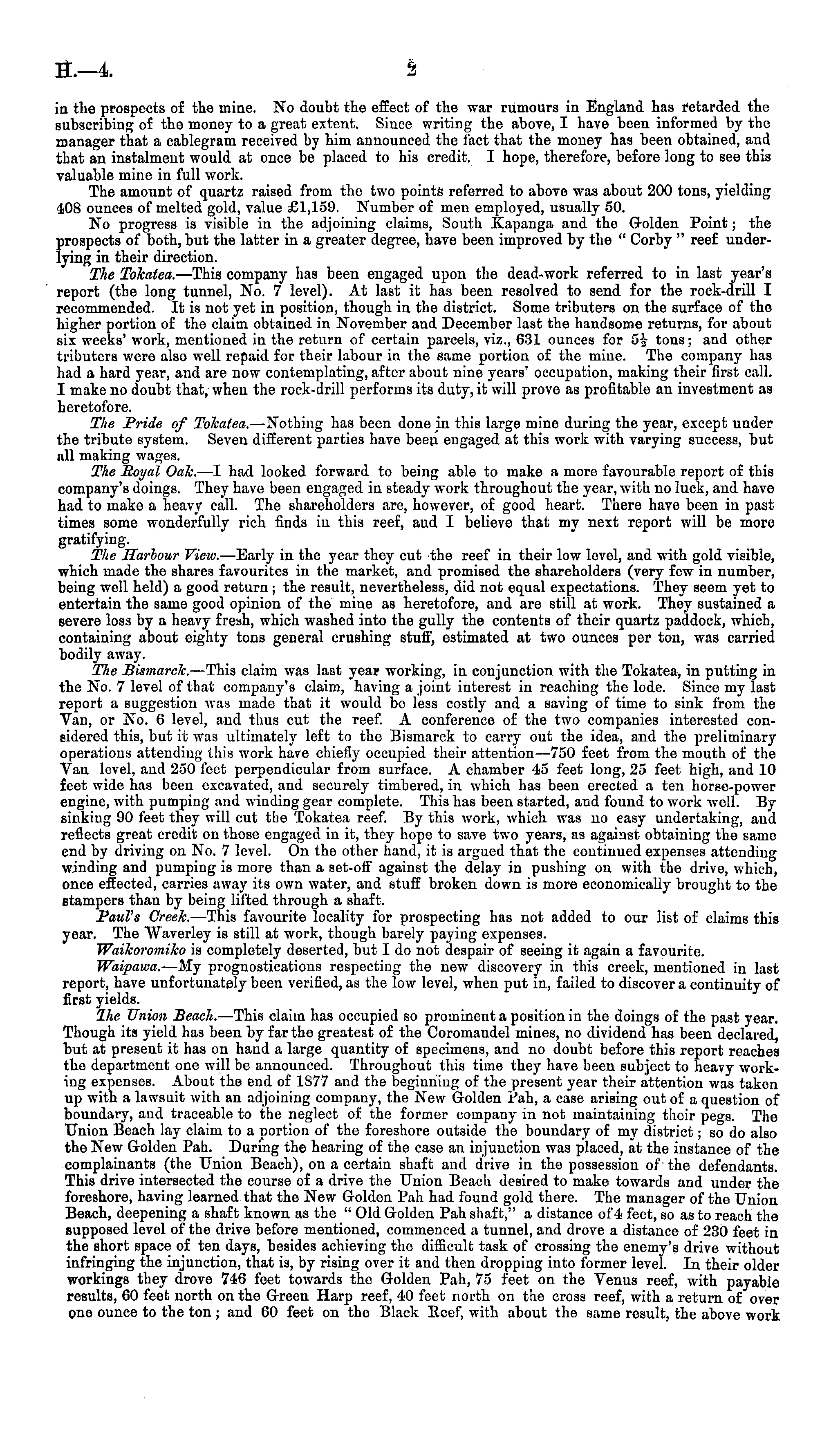 in the prospects of the mine. No doubt the effect of the war rumours in England has retarded the subscribing of the money to a great extent. Since writing the above, I have been informed by the manager that a cablegram received by him announced the fact that the money has been obtained, and that an instalment would at once be placed to his credit. I hope, therefore, before long to see this valuable mine in full work. The amount of quartz raised from the two points referred to above was about 200 tons, yielding 40S ounces of melted gold, value £1,159. Number of men employed, usually 50. No progress is visible in the adjoining claims, South Kapanga and the Golden Point; the prospects of both, but the latter in a greater degree, have been improved by the " Corby " reef underlying in their direction. The Tokatea. —This company has been engaged upon the dead-work referred to in last year's report (the long tunnel, No. 7 level). At last it has been resolved to send for the rock-drill I recommended. It is not yet in position, though in the district. Some tributers on the surface of the higher portion of the claim obtained in November and December last the handsome returns, for about six weeks' work, mentioned in the return of certain parcels, viz., G3l ounces for 5i- tons; and other tributers were also well repaid for their labour in the same portion of the mine. The company has had a hard year, and are now contemplating, after about nine years' occupation, making their first call. I make no doubt that, when the rock-drill performs its duty, it will prove as profitable an investment as heretofore. The Pride of Tokatea. —-Nothing has been done in this large mine during the year, except under the tribute system. Seven different parties have been engaged at this work with varying success, but all making wages. The Royal Oak. —I had looked forward to being able to make a more favourable report of this company's doings. They have been engaged in steady work throughout the year, with no luck, and have had to make a heavy call. The shareholders are, however, of good heart. There have been in past times some wonderfully rich finds in this reef, and I believe that my next report will be more gratifying. The Harbour View. —Early in the year they cut the reef in their low level, and with gold visible, which made the shares favourites iv the market, and promised the shareholders (very few in number, being well held) a good return ; the result, nevertheless, did not equal expectations. They seem yet to entertain the same good opinion of the mine as heretofore, and are still at work. They sustained a severe loss by a heavy fresh, which washed into the gully the contents of their quartz paddock, which, containing about eighty tons general crushing stuff, estimated at two ounces per ton, was carried bodily away. The Bismarck. —This claim was last year working, in conjunction with the Tokatea, in putting in the No. 7 level of that company's claim, having a joint interest in reaching the lode. Since my last report a suggestion was made that it would be less costly and a saving of time to sink from the A 7an, or No. 6 level, and thus cut the reef. A conference of the two companies interested considered this, but it was ultimately left to the Bismarck to carry out the idea, and the preliminary operations attending this work have chiefly occupied their attention —750 feet from the mouth of the Van level, and 250 feet perpendicular from surface. A chamber 45 feet long, 25 feet high, and 10 feet wide has been excavated, and securely timbered, in which has been erected a ten horse-power engine, with pumping and winding gear complete. This has been started, and found to work well. By sinking 90 feet they will cut the Tokatea reef. By this work, which was no easy undertaking, aud reflects great credit on those engaged in it, they hope to save two years, as against obtaining the same end by driving on No. 7 level. On the other hand, it is argued that the continued expenses attending winding and pumping is more than a set-oft* against the delay in pushing on with the drive, which, once effected, carries away its own water, and stuff broken down is more economically brought to the stampers than by being lifted through a shaft. Paul's Creek. —This favourite locality for prospecting has not added to our list of claims this year. The AVaverley is still at work, though barely paying expenses. Waikoromiko is completely deserted, but I do not despair of seeing it again a favourite. Waipawa. —My prognostications respecting the new discovery in this creek, mentioned in last report, have unfortunately been verified, as the low level, when put in, failed to discover a continuity of first yields. Ihe Union Beach. —This claim has occupied so prominent a position iv the doings of the past year. Though its yield has been by far the greatest of the Coromandel mines, no dividend has been declared, but at present it has on hand a large quantity of specimens, and no doubt before this report reaches the department one will be announced. Throughout this time they have been subject to heavy working expenses. About the end of 1577 and the beginning of the present year their attention was taken up with a lawsuit with an adjoining company, the New Golden Pah, a case arising out of a question of boundary, and traceable to the neglect of the former company in not maintaining their pegs. The Union Beach lay claim to a portion of the foreshore outside tho boundary of my district; so do also the New Golden Pah. During the hearing of the case an injunction was placed, at the instance of the complainants (the Union Beach), on a certain shaft and drive in the possession of the defendants. This drive intersected the course of a drive the Union Beach desired to make towards and under the foreshore, having learned that the New Golden Pah had found gold there. The manager of the Union Beach, deepening a shaft known as the " Old Golden Pah 