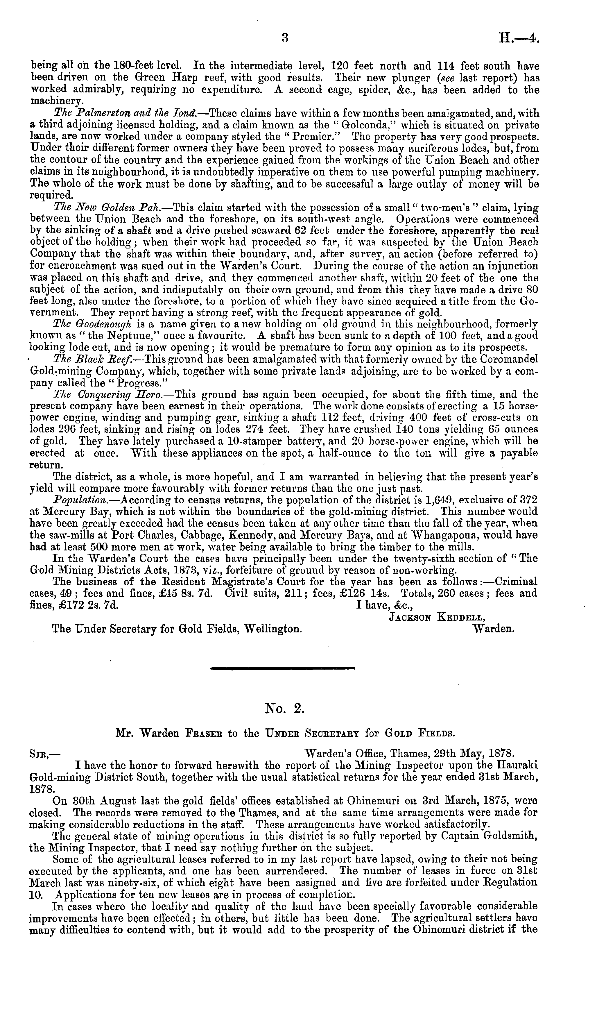 No. 2. Mr. Warden Fraser to the Under Secretary for Gold Fields. Sir,— AVarden's Office, Thames, 29th May, 1878. I have the honor to forward herewith the report of the Mining Inspector upon the Hauraki Gold-mining District South, together with the usual statistical returns for the year ended 31st March, 1878. On 30th August last the gold fields' offices established at Ohinemuri on 3rd March, 1875, were closed. The records were removed to the Thames, and at the same time arrangements were made for making considerable reductions ill the staff. These arrangements have worked satisfactorily. The general state of mining operations in this district is so fully reported by Captain Goldsmith, the Mining Inspector, that I need say nothing further on the subject. Some of the agricultural leases referred to in my last report have lapsed, owing to their not being executed by the applicants, and one has been surrendered. The number of leases in force on 31st March last was ninety-six, of wdiich eight have been assigned and five are forfeited under Regulation 10. Applications for ten new leases are in process of completion. In cases where the locality and quality of the land have been specially favourable considerable improvements have been effected; in others, but little has been done. The agricultural settlers have many difficulties to contend with, but it would add to the prosperity of the Ohinemuri district if the