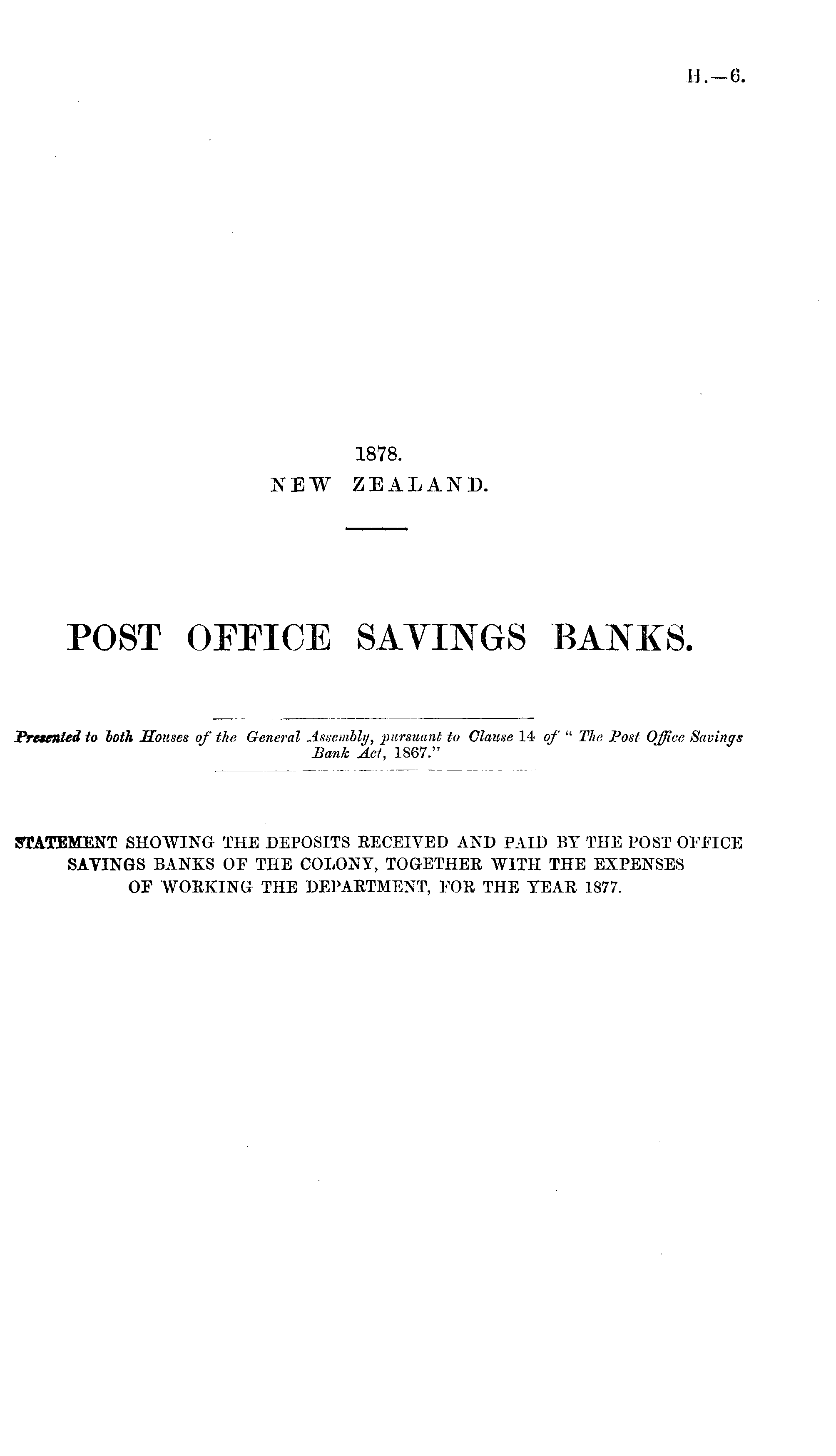 STATEMENT SHOWING THE DEPOSITS EECEIVED AND PAID BY THE POST OFFICE SAVINGS BANKS OF THE COLONY, TOGETHER WITH THE EXPENSES OF WORKING THE DEPARTMENT, FOR THE YEAR 1877.