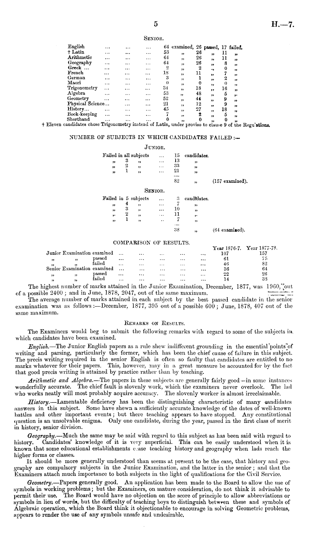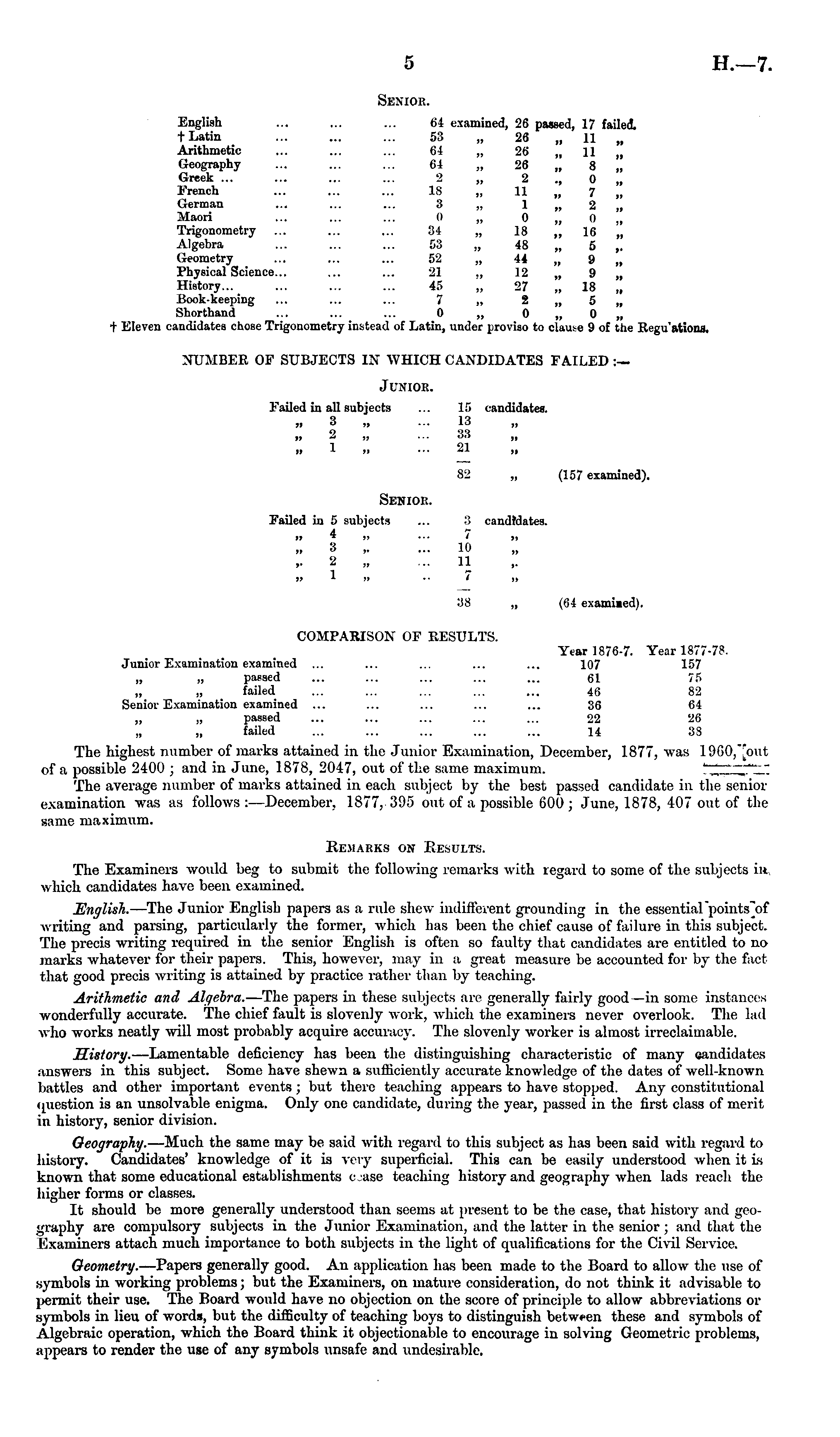 Senior. English ... ... ... 64 examined, 26 passed, 17 failed. t Latin ... ... ... 53 „ 26 „ 11 „ Arithmetic ... ... ... 64 „ 26 „ 11 „ Geography ... ... ... 64 „ 26 „ 8 „ Greek 2 „ 2 ~ 0 „ French ... ... ... IS „ 11 „ 7 „ German ... ... ... 3 „ 1 „ 2 „ Maori ... ... ... (I „ 0 „ 0 „ Trigonometry ... ... ... 34 „ 18 „ 16 „ Algebra 53 „ 48 „ 5 ~ Geometry ... ... ... 52 „ 44 „ 9 „ Physical Science... ... ... 21 ~ 12 „ 9 „ History... ... 45 „ 27 „ 18 „ Book-keeping ... ... ... 7 „ 2 „ 5 „ Shorthand ... ... ... 0 „ 0 „ 0 „ T Eleven candidates chose Trigonometry instead of Latin, under proviso to claute 9 of the Regu'ations. NUMBER OF SUBJECTS IN WHICH CANDIDATES FAILED :— Junior. Failed in all subjects ... 15 candidates. „ 3 „ ... 13 „ 2 S3 „ 1 „ ... 21 „ 82 „ (157 examined). Senior. Failed in 5 subjects ... 3 candidates. h 4 ». ••• 7 „ 3 ~ ... 10 ~ 2 „ ... 11 38 „ (64 examined). COMPARISON OF RESULTS. Year 1876-7. Year 1877-78. Junior Examination examined ... ... ... ... ... 107 157 „ „ passed ... ... ... ... ... 61 75 „ „ failed ... ... ... .... ... 46 82 Senior Examination examined ... ... ... ... ... 36 64 „ „ passed ... ... ... ... ... 22 26 „ „ failed ... ... ... ... ... 14 33 The highest number of marks attained in the Junior Examination, December, 1877, was 1960,"0ut of a possible 2400 ; and in June, 1878, 2047, out of the same maximum. "*/ " The average number of marks attained in each subject by the best passed candidate in the senior examination was as follows :—December, 1877, 395 out of a possible 600 ; June, 1878, 407 out of the same maximum. Eemarks on Besults. The Examiners would beg to submit the following remarks with regard to some of the subjects in. which candidates have been examined. English. —The Junior English papers as a rule shew indifferent grounding in the essentiarpoints~of writing and parsing, particularly the former, which has been the chief cause of failure in this subject. The precis writing required in the senior English is often so faulty that candidates are entitled to no marks whatever for their papers. This, however, may in a great measure be accounted for by the fact that good precis writing is attained by practice rather than by teaching. Arithmetic and Algebra. —The papers in these subjects are generally fairly good —in some instances wonderfully accurate. The chief fault is slovenly work, which the examiners never overlook. The lad who works neatly will most probably acquire accuracy. The slovenly worker is almost irreclaimable. History. —Lamentable deficiency has been the distinguishing characteristic of many candidates answers in this subject. Some have shewn a sufficiently accurate knowledge of the dates of well-known battles and other important events ; but there teaching appears to have stopped. Any constitutional question is an unsolvable enigma. Only one candidate, during the year, passed in the first class of merit in history, senior division. Oeography. —Much the same may be said with regard to this subject as has been said with regard to history. Candidates' knowledge of it is very superficial. This can be easily understood when it is known that some educational establishments case teaching history and geography when lads reach the higher forms or classes. It should be more generally understood than seems at present to be the case, that history and geography are compulsory subjects in the Junior Examination, and the latter in the senior ; and that the Examiners attach much importance to both subjects in the light of qualifications for the Civil Service. Geometry. —Papers generally good. An application has been made to the Board to allow the use of symbols in working problems; but the Examiners, on mature consideration, do not think it advisable to permit their use. The Board would have no objection on the score of principle to allow abbreviations or symbols in lieu of words, but the difficulty of teaching boys to distinguish between these and symbols of Algebraic operation, which the Board think it objectionable to encourage in solving Geometric problems, appears to render the use of any symbols unsafe and undesirable.