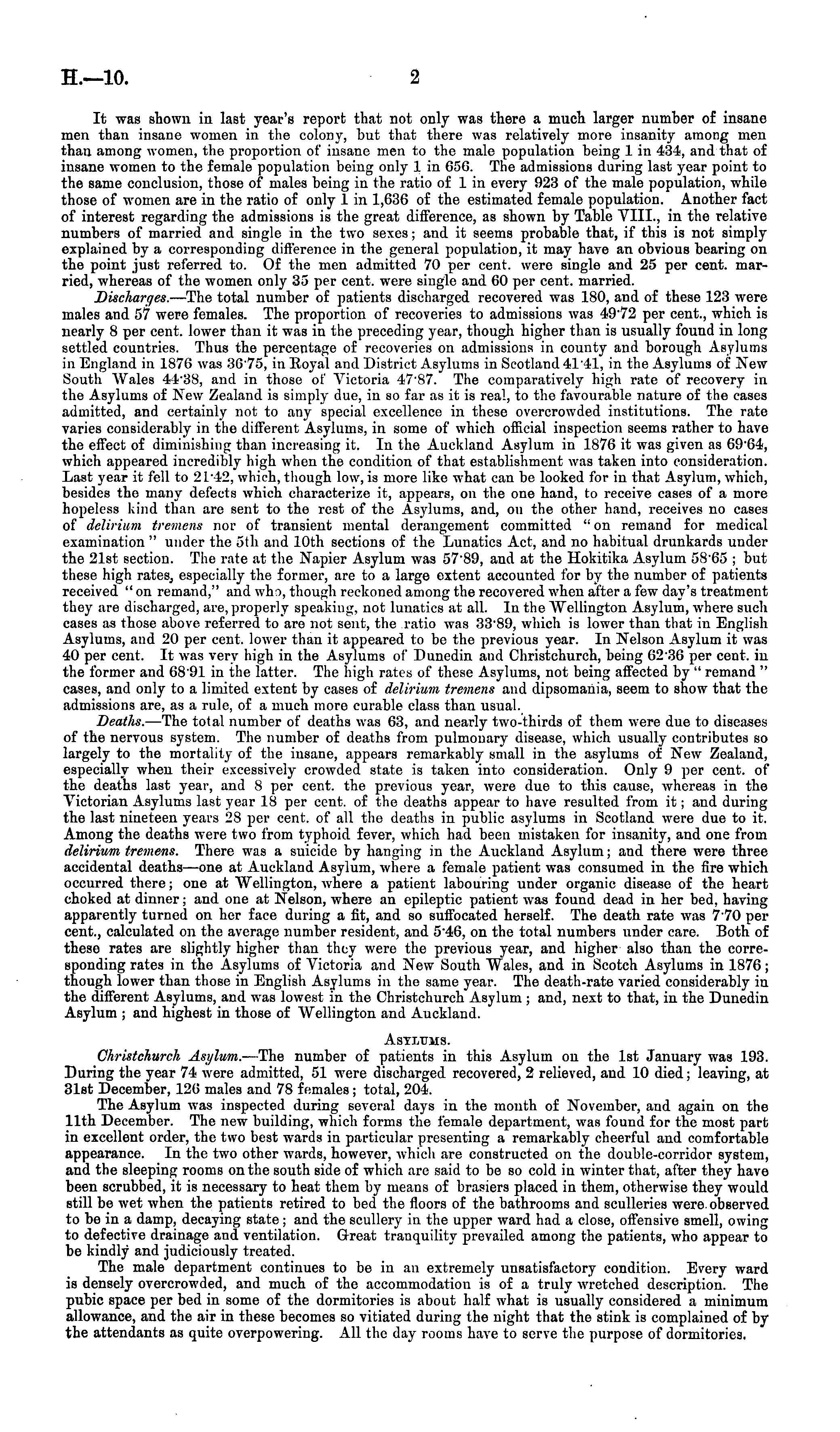 It was shown in last year's* report that not only was there a much larger number of insane men than insane women in the colony, but that there was relatively more insanity among men than among women, the proportion of insane men to the male population being 1 in 434, and that of insane women to the female population being only lin 65G. The admissions during last year point to the same conclusion, those of males being in the ratio of 1 in every 923 of the male population, while those of women are in the ratio of only lin 1,G36 of the estimated female population. Another fact of interest regarding the admissions is the great difference, as shown by Table VIII., in the relative numbers of married and single in the two sexes; and it seems probable that, if this is not simply explained by a corresponding difference in the general population, it may have an obvious bearing on the point just referred to. Of the men admitted 70 per cent, were single and 25 per cent, married, whereas of the women only 35 per cent, were single and CO per cent, married. Discharges.- —The total number of patients discharged recovered was 180, and of these 123 were males and 57 were females. The proportion of recoveries to admissions was 4972 per cent., which is nearly 8 per cent, lower than it was in the preceding year, though higher than is usually found in long settled countries. Thus the percentage of recoveries on admissions in county and borough Asylums in England in 1876 was 3675, in Royal and District Asylums in Scotland 4141, in the Asylums of New South Wales 4438, and in those of Victoria 4787. The comparatively high rate of recovery in the Asylums of New Zealand is simply due, in so far as it is real, to the favourable nature of the eases admitted, and certainly not to any special excellence in these overcrowded institutions. The rate varies considerably in the different Asylums, in some of which official inspection seems rather to have the effect of diminishing than increasing it. In the Auckland Asylum in 1876 it was given as 6i)"G4, whicli appeared incredibly high when the condition of that establishment was taken into consideration. Last year it fell to 21*42, which, though low, is more like what can be looked for in that Asylum, which, besides the many defects which characterize it, appears, on the one hand, to receive cases of a more hopeless kind than are sent to the rest of the Asylums, and, on the other hand, receives no cases of delirium tremens nor of transient mental derangement committed l: on remand for medical examination " under the slh and 10th sections of the Lunatics Act, and no habitual drunkards under the 21st section. The rate at the Napier Asylum was 5789, and at the Hokitika Asylum 5865 ; but these high rates, especially the former, are to a large extent accounted for by the number of patients received "on remand," and whr>, though reckoned among the recovered when alter a few day's treatment they are discharged, are, properly speaking, not lunatics at all. In the Wellington Asylum, where such cases as those above referred to are not sent, the ratio was 3389, which is lower than that in English Asylums, and 20 per cent, lower than it appeared to be the previous year. In Nelson Asylum it was 40 per cent. It was very high in the Asylums of Dunedin and Christchurch, being 62 36 per cent, in the former and 6591 in the latter. The high rates of these Asylums, not being affected by " remand " cases, and only to a limited extent by cases of delirium tremens and dipsomania, seem to show that the admissions are, as a rule, of a much more curable class than usual. Deaths. —The total number of deaths was 63, and nearly two-thirds of them were due to diseases of the nervous system. The number of deaths from pulmonary disease, which usually contributes so largely to the mortality of the insane, appears remarkably small in the asylums of New Zealand, especially when their excessively crowded state is taken into consideration. Only 9 per cent, of the deaths last year, and 8 per cent, the previous year, were due to this cause, whereas in the Victorian Asylums last year 18 per cent, of the deaths appear to have resulted from it; and during the last nineteen years 28 per cent, of all the deaths in public asylums in Scotland were due to it. Among the deaths were two from typhoid fever, which had been mistaken for insanity, and one from delirium tremens. There was a suicide by hanging in the Auckland Asylum; and there were three accidental deaths —one at Auckland Asylum, where a female patient was consumed in the fire which occurred there; one at "Wellington, where a patient labouring under organic disease of the heart choked at dinner; and one at Nelson, where an epileptic patient was found dead in her bed, having apparently turned on her face during a fit, and so suffocated herself. The death rate was 770 per cent., calculated on the average number resident, and 546, on the total numbers under care. Both of theso rates are slightly higher than they were the previous year, and higher also than the corresponding rates in the Asylums of Victoria and New South "Wales, and in Scotch Asylums in 1876; though lower than those in English Asylums in the same year. The death-rate varied considerably in the different Asylums, and was lowest in the Christchurch Asylum ; and, next to that, in the Dunedin Asylum ; and highest in those of Wellington and Auckland. AsYitrus. Christchurch Asylum.—The number of patients in this Asylum on the Ist January was 193. During the year 74 were admitted, 51 were discharged recovered, 2 relieved, and 10 died; leaving, at 31et December, 126 males and 78 females; total, 204. The Asylum was inspected during several days in the month of November, and again on the 11th December. The new building, which forms the female department, was found for the most part in excellent order, the two best wards in particular presenting a remarkably cheerful and comfortable appearance. In the