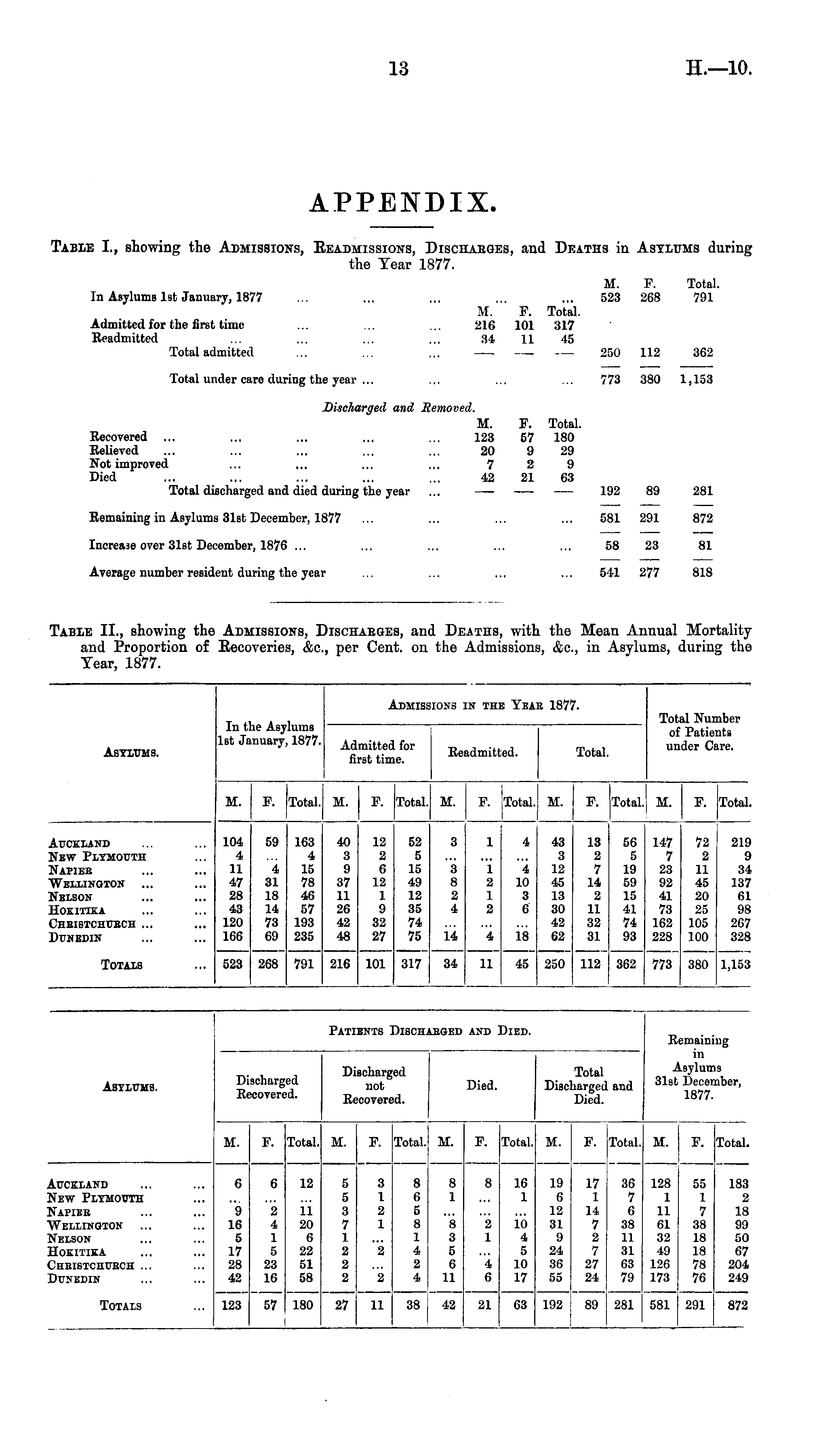 Table I., showing the Admissions, Eeadmissions, Disciiabges, and Deaths in Asylums during the Tear 1877. M. P. Total. In Asylums 1st January, 1877 ... ... ... ... ... 523 268 791 M. F. Total. Admitted for the first time ... ... ... 216 101 317 Readmitted ... ... ... ... 34 11 45 Total admitted ... ... ... 250 112 362 Total under care during the year ... ... ... ... 773 380 1,153 Discharged and Removed. M. F. Total. Recovered ... ... ... ... ... 123 57 180 Relieved ... ... ... ... ... 20 9 29 Not improved ... ... ... ... 7 2 9 Died ... ... ... ... ... 42 21 63 Total discharged and died during the year ... — 192 89 281 Remaining in Asylums 31st December, 1877 ... ... ... ... 581 291 872 Increase over 31st December, 1876 ... ... ... ... ... 58 23 81 Average number resident during the year ... ... ... ... 541 277 818