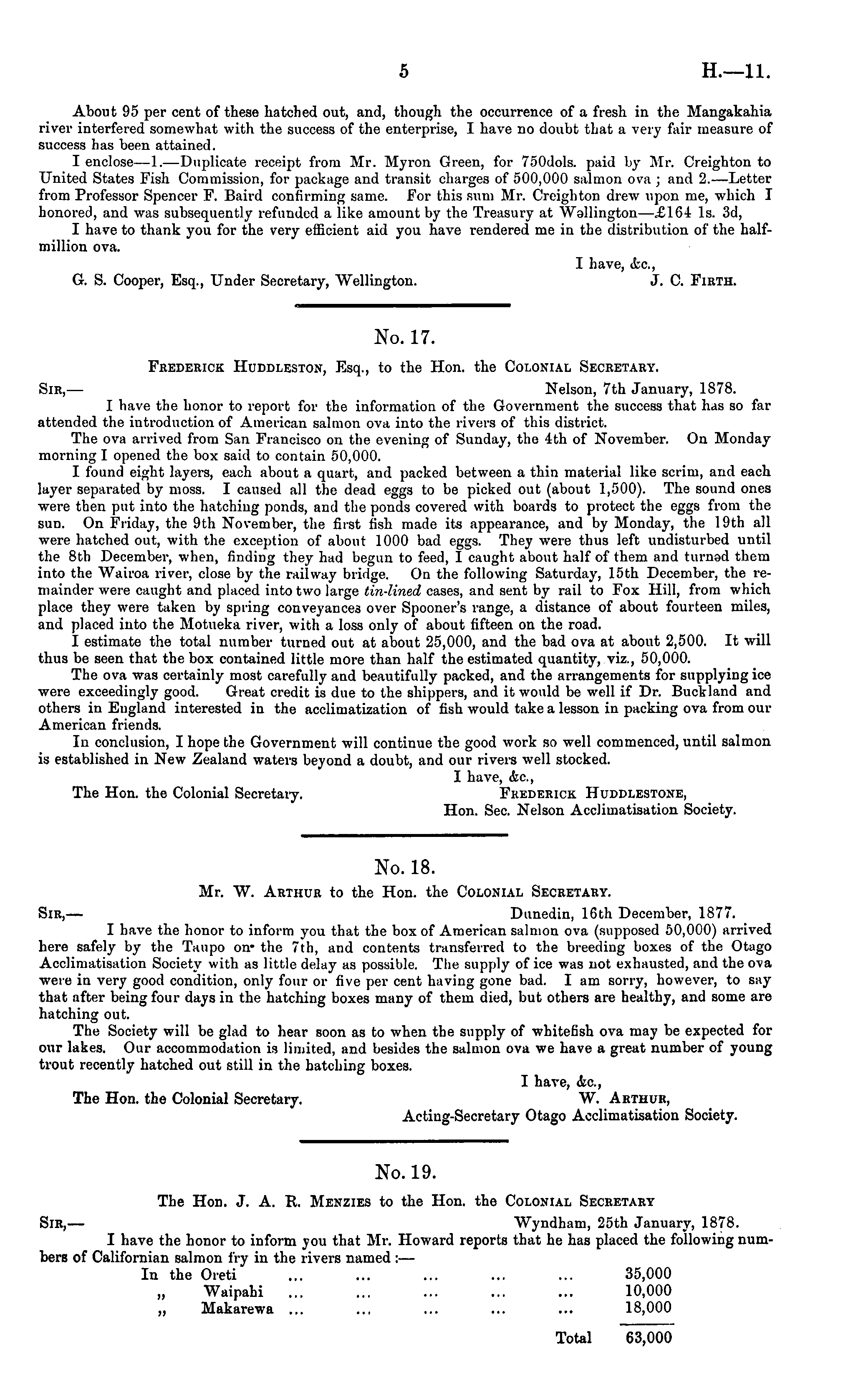No. 19. The Hon. J. A. R. Menzies to the Hon. the Colonial Secretary Sir, — Wyndham, 25th January, 1878. I have the honor to inform you that Mr. Howard reports that he has placed the following numbers of Californian salmon fry in the rivers named : — In the Oreti ... ... ... ... ... 35,000 Waipahi ... ... ... ... ... 10,000 Makarewa ... ... ... ... ... 18,000 Total 63,000