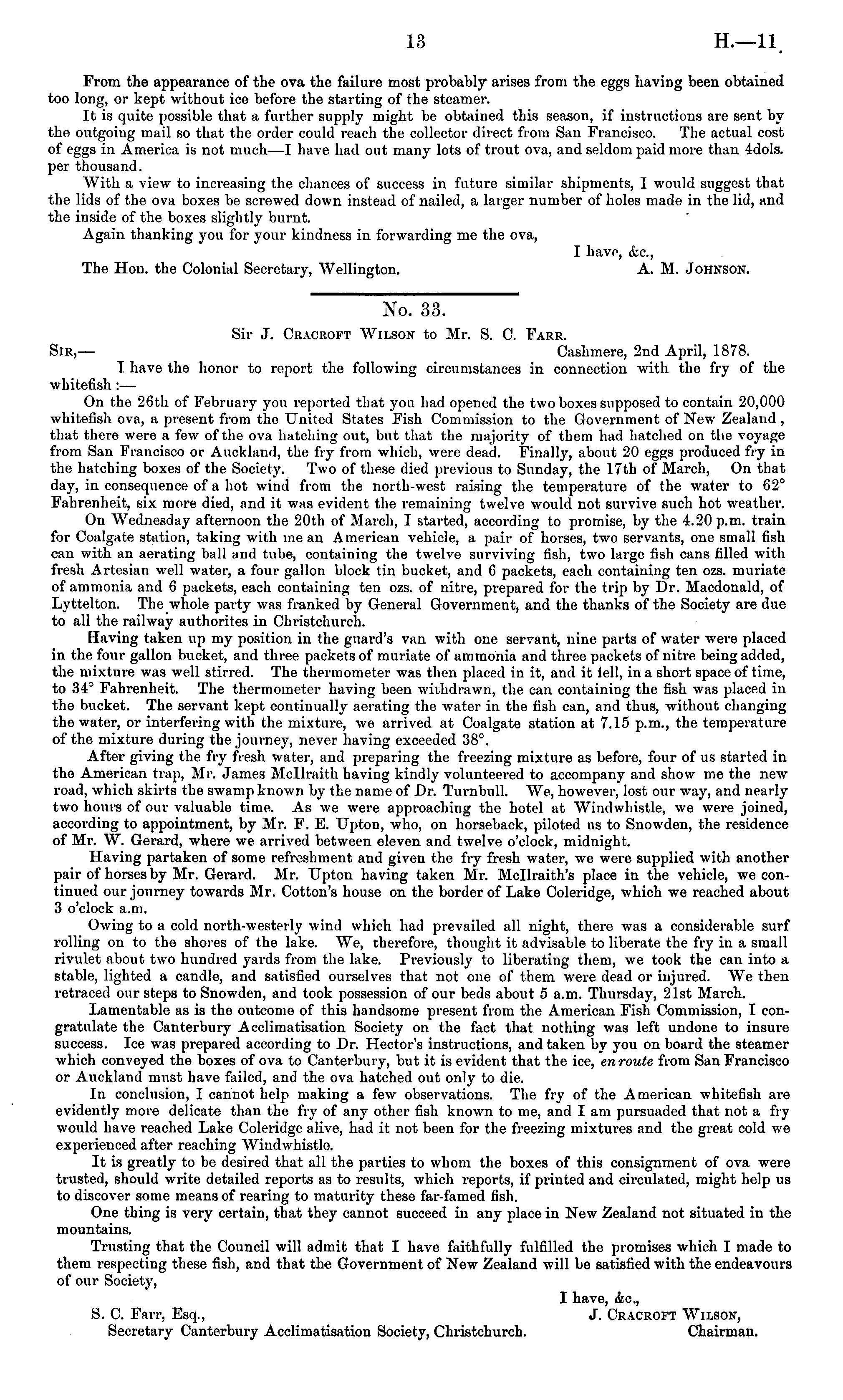 No. 33. Sir J. Cracroft Wilson to Mr. S. C. Farr. Sir,— Cashmere, 2nd April, 1878. I have the honor to report the following circumstances in connection with the fry of the whitefish :— On the 26th of February you reported that you had opened the two boxes supposed to contain 20,000 whitefish ova, a present from the United States Fish Commission to the Government of New Zealand , that there were a few of the ova hatching out, but that the majority of them had hatched on the voyage from San Francisco or Auckland, the fry from which, were dead. Finally, about 20 eggs produced fry in the hatching boxes of the Society. Two of these died previous to Sunday, the 17th of March, On that day, in consequence of a hot wind from the north-west raising the temperature of the water to 62° Fahrenheit, six more died, and it was evident the remaining twelve would not survive such hot weather. On Wednesday afternoon the 20th of March, I started, according to promise, by the 4.20 p.m. train for Coalgate statiorr, taking with mean American vehicle, a pair of horses, two servants, one small fish can with an aerating ball and tube, containing the twelve surviving fish, two large fish cans filled with fresh Artesian well water, a four gallon block tin bucket, and 6 packets, each containing ten ozs. muriate of ammonia and 6 packets, each containing ten ozs. of nitre, prepared for the trip by Dr. Macdonald, of Lyttelton. The whole party was franked by General Government, and the thanks of the Society are due to all the railway autlrorites in Christchurch. Having taken up my position in the guard's van with one servant, nine parts of water were placed in the four gallon bucket, and three packets of muriate of ammonia and three packets of nitre being added, the mixture was well stirred. The thermometer was then placed in it, and it lell, in a short space of time, to 34° Fahrenheit. The thermometer having been withdrawn, the can containing the fish was placed in the bucket. The servant kept continually aerating the water in the fish can, and thus, without changing the water, or interfering with the mixture, we arrived at Coalgate station at 7.15 p.m., the temperature of the mixture during the journey, never having exceeded 38°. After giving the fry fresh water, and preparing the freezing mixture as before, four of us started in the American trap, Mr. James Mcllraith having kindly volunteered to accompany and show me the new road, which skirts the swamp known by the name of Dr. Turnbull. We, however, lost our way, and nearly two hours of our valuable time. As we were approaching the hotel at Windwhistle, we were joined, according to appointment, by Mr. F. E. Upton, who, on horseback, piloted us to Snowden, the residence of Mr. W. Gerard, where we arrived between eleven and twelve o'clock, midnight. Having partaken of some refreshment and given the fry fresh water, we were supplied with another pair of horses by Mr. Gerard. Mr. Upton having taken Mr. Mcllraith's place in the vehicle, we continued our journey towards Mr. Cotton's house on the border of Lake Coleridge, which we reached about 3 o'clock a.m. Owing to a cold north-westerly wind which had prevailed all night, there was a considerable surf rolling on to the shores of the lake. We, therefore, thought it advisable to liberate the fry in a small rivulet about two hundred yards from the lake. Previously to liberating them, we took the can into a stable, lighted a candle, and satisfied ourselves that not one of them were dead or injured. We then retraced our steps to Snowden, and took possession of our beds about 5 a.m. Thursday, 21st March. Lamentable as is the outcome of this handsome present from the American Fish Commission, I congratulate the Canterbury Acclimatisation Society on the fact that nothing was left undone to insure success. Ice was prepared according to Dr. Hector's instructions, and taken by you on board the steamer which conveyed the boxes of ova to Canterbury, but it is evident that the ice, en route from San Francisco or Auckland must have failed, and the ova hatched out only to die. In conclusion, I cannot help making a few observations. The fry of the American whitefish are evidently more delicate than the fry of any other fish known to me, and I am pursuaded that not a fry would have reached Lake Coleridge alive, had it not been for the freezing mixtures and the great cold we experienced after reaching Windwhistle. It is greatly to be desired that all the parties to whom the boxes of this consignment of ova were trusted, should write detailed reports as to results, which reports, if printed and circulated, might help us to discover some means of rearing to maturity these far-famed fish. One thing is very certain, that they cannot succeed in any place in New Zealand not situated in the mountains. Trusting that the Council will admit that I have faithfully fulfilled the promises which I made to them respecting these fish, and that the Government of New Zealand will be satisfied with the endeavours of our Society, I have, &c, S. C. Farr, Esq., J. Cracroft Wilson, Secretary Canterbury Acclimatisation Society, Christchurch. Chairman.