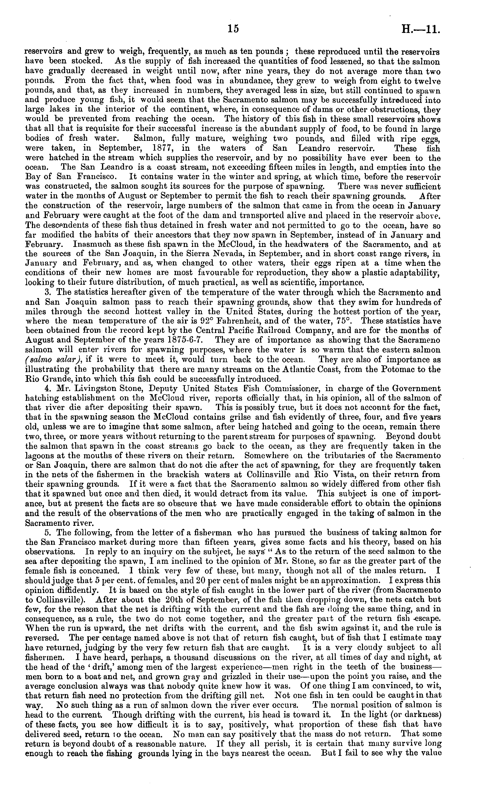 reservoirs and grew to weigh, frequently, as much as ten pounds ; these reproduced until the reservoirs have been stocked. As the supply of fish increased the quantities of food lessened, so that the salmon have gradually decreased in weight until now, after nine years, they do not average more than two pounds. From the fact that, when food was in abundance, they grew to weigh from eight to twelve pounds, and that, as they increased in numbers, they averaged less in size, but still continued to spawn and produce young fish, it would seem that the Sacramento salmon may be successfully introduced into large lakes in the interior of the continent, where, in consequence of dams or other obstructions, they would be prevented from reaching the ocean. The history of this fish in these small reservoirs shows that all that is requisite for their successful increase is the abundant supply of food, to be found in large bodies of fresh water. Salmon, fully mature, weighing two pounds, and filled with ripe eggs, were taken, in September-, 1877, in the waters of San Leandro reservoir. These fish were hatched in the stream which supplies the reservoir, and by no possibility have ever been to the ocean. The San Leandro is a coast stream, not exceeding fifteen miles in length, and empties into the Bay of San Francisco. It contains water in the winter and spring, at which time, before the reservoirwas constructed, the salmon sought its sources for the purpose of spawning. There was never sufficient water in the months of August or September to permit the fish to reach their spawning grounds. After the construction of the reservoir, large numbers of the salmon that came in from the ocean in January and February were caught at the foot of the dam and transported alive and placed in the reservoir above. The descendents of these fish thus detained in fresh water and not permitted to go to the ocean, have so far modified the habits of their ancestors that they now spawn in September, instead of in January and February. Inasmuch as these fish spawn in the McCloud, in the headwaters of the Sacramento, and at the sources of the San Joaquin, in the Sierra Nevada, in September, and in short coast range rivers, in January and February, and as, when changed to other waters, their eggs ripen at a time when the conditions of their new homes are most favourable for reproduction, they show a plastic adaptability, looking to their future distribution, of much practical, as well as scientific, importance. 3. The statistics hereafter given of the temperature of the water through which the Sacramento and and San Joaquin salmon pass to reach their spawning grounds, show that they swim for hundreds of miles through the second hottest valley in the United States, during the hottest portion of the year, where the mean temperature of the air is 92° Fahrenheit, and of the water, 75°. These statistics have been obtained from the record kept by the Central Pacific Railroad Company, and are for the months of August and September of the years 1875-6-7. They are of importance as showing that the Sacrameno salmon will enter livers for spawning purposes, where the water is so warm that the eastern salmon (salmo salar), if it were to meet it, would turn back to the ocean. They are also of importance as illustrating the probability that there are many streams on the Atlantic Coast, from the Potomac to the Rio Grande, into which this fish could be successfully introduced. 4. Mr. Livingston Stone, Deputy United States Fish Commissioner, in charge of the Government hatching establishment on the McCloud river, reports officially that, in his opinion, all of the salmon of that river die after depositing their spawn. This is possibly true, but it does not account for the fact, that in the spawning season the McCloud contains grilse and fish evidently of three, four, and five years old, unless we are to imagine that some salmon, after being hatched and going to the ocean, remain there two, three, or more years without returning to the parent stream for purposes of spawning. Beyond doubt the salmon that spawn in the coast streams go back to the ocean, as they are frequently taken in the lagoons at the mouths of these rivers on their return. Somewhere on the tributaries of the Sacramento or San Joaquin, there are salmon that do not die after the act of spawning, for they are frequently taken in the nets of the fishermen in the brackish waters at ColJinsville and Rio Vista, on their return from their spawning grounds. If it were a fact that the Sacramento salmon so widely differed from other fish that it spawned but once and then died, it would detract from its value. This subject is one of importance, but at present the facts are so obscure that we have made considerable effort to obtain the opinions and the result of the observations of the men who are practically engaged in the taking of salmon in the Sacramento river. 5. The following, from the letter of a fisherman who has pursued the business of taking salmon for the San Francisco market during more than fifteen years, gives some facts and his theory, based on his observations. In reply to an inquiry on the subject, he says' "As to the return of the seed salmon to the sea after depositing the spawn, I am inclirred to the opinion of Mr. Stone, so far as the greater part of the female fish is concerned. 1 think very few of these, but many, though not all of the males return. I should judge that 5 per cent, of females, and 20 per cent of males might be an approximation. I express this opinion diffidently. It is based on the style offish caught in the lower part of the river (from Sacramento to Collinsville). After about the 20th of September, of the fish then dropping down, the nets catch but few, for the reason that the net is drifting with the current and the fish are doing the same thing, and ill consequence, as a rule, the two do not come together, and the greater part of the return fish -e