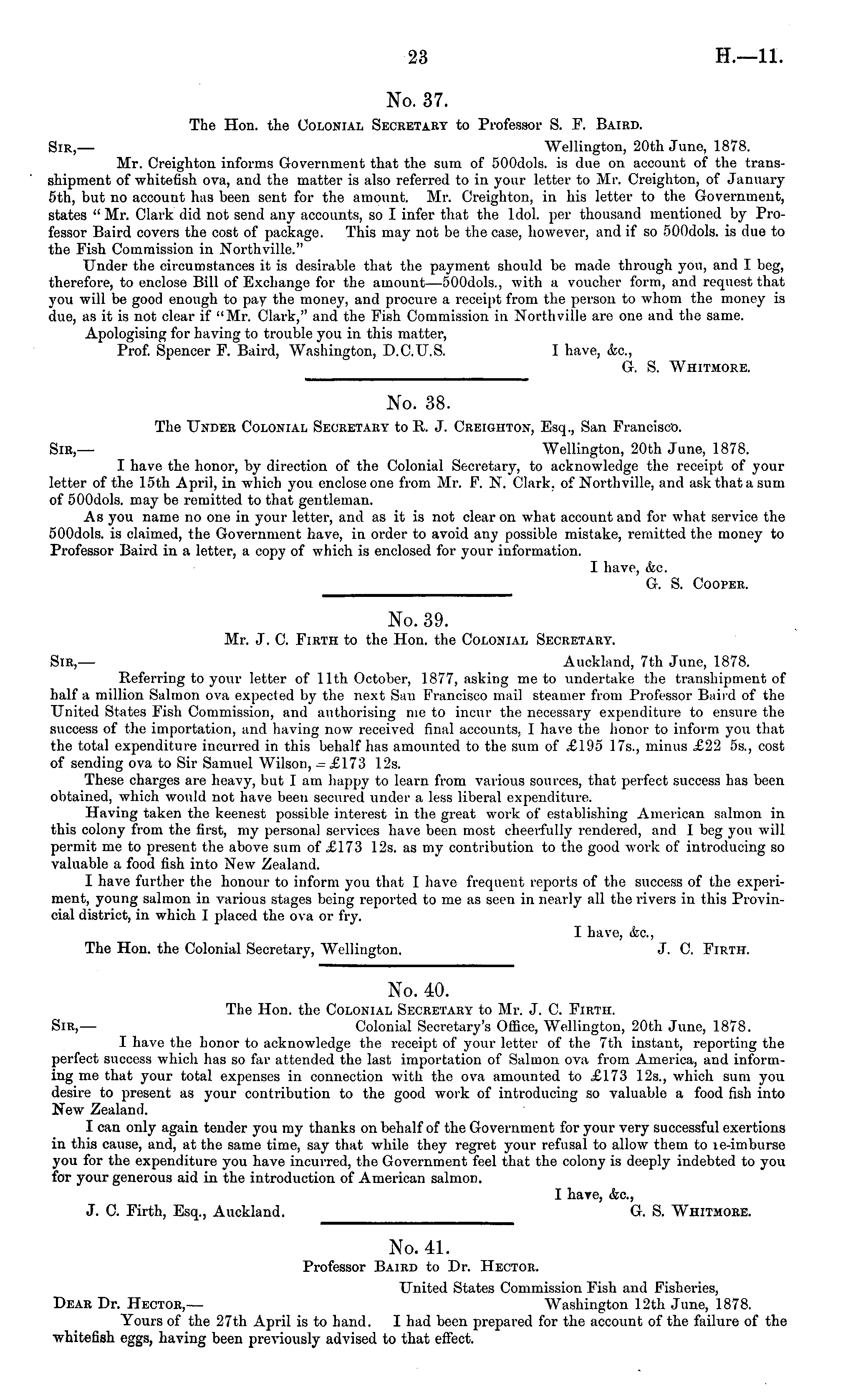 No. 37. The Hon. the Colonial Secretary to Professor S. F. Baird. Sir,— Wellington, 20th June, 1878. Mr. Creighton informs Government that the sum of 500dols. is due on account of the transshipment of whitefish ova, and the matter is also referred to in your letter to Mr. Creighton, of January sth, but no account has been sent for the amount. Mr. Creighton, in his letter to the Government, states " Mr. Clark did not send any accounts, so I infer that the Idol, per thousand mentioned by Professor Baird covers the cost of package. This may not be the case, however, and if so 500dols. is due to the Fish Commission in Northville." Under the circumstances it is desirable that the payment should be made through you, and I beg, therefore, to enclose Bill of Exchange for the amount—SOOdols., with a voucher form, and request that you will be good enough to pay the money, and procure a receipt from the person to whom the money is due, as it is not clear if "Mr. Clark," and the Fish Commission in Northville are one and the same. Apologising for having to trouble you in this matter, Prof. Spencer F. Baird, Washington, D.C.U.S. I have, &c, G. S. Whitmore.