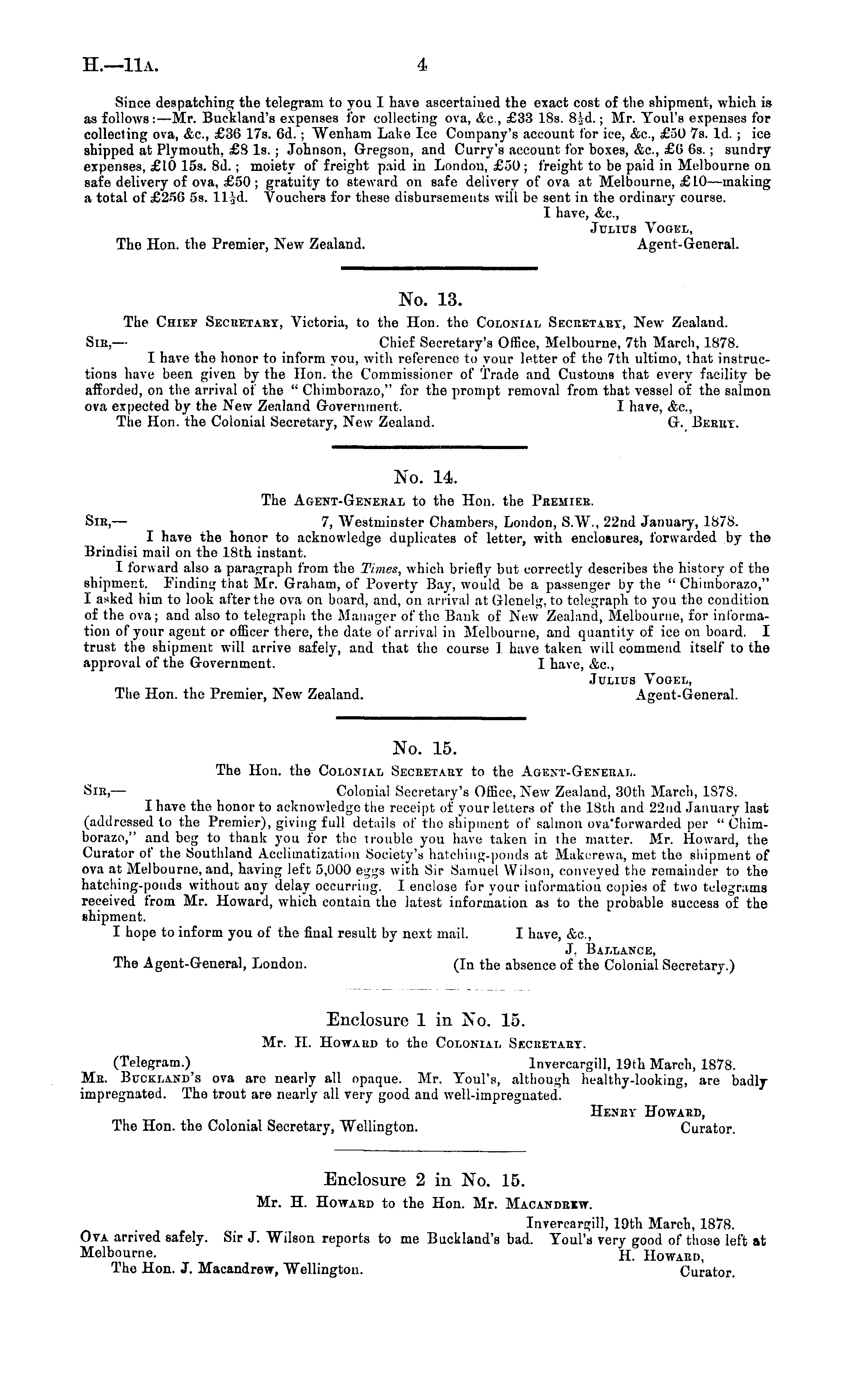 No. 15. The Hon. the Colonial Secretary to the Agent-General. Sir, — Colonial Secretary's Office, New Zealand, 30th March, 1878. I have the honor to acknowledge the receipt of your letters of the 18th and 22nd January last (addressed to the Premier), giving full details of tho shipment of salmon ova'forwarded per "Chimborazo," and beg to thank you for the trouble you have taken in the matter. Mr. Howard, the Curator of the Southland Acclimatization Society's hatching-ponds at Makerewa, met tho shipment of ova at Melbourne, and, having left 5,000 eggs with Sir Samuel Wilson, conveyed the remainder to the hatching-ponds without any delay occurring. I enclose for your information copies of two telegrams received from Mr. Howard, which contain the latest information as to the probable success of the shipment. I hope to inform you of the final result by next mail. I have, &c, J. Ballance, The Agent-General, London. (In the absence of the Colonial Secretary.)