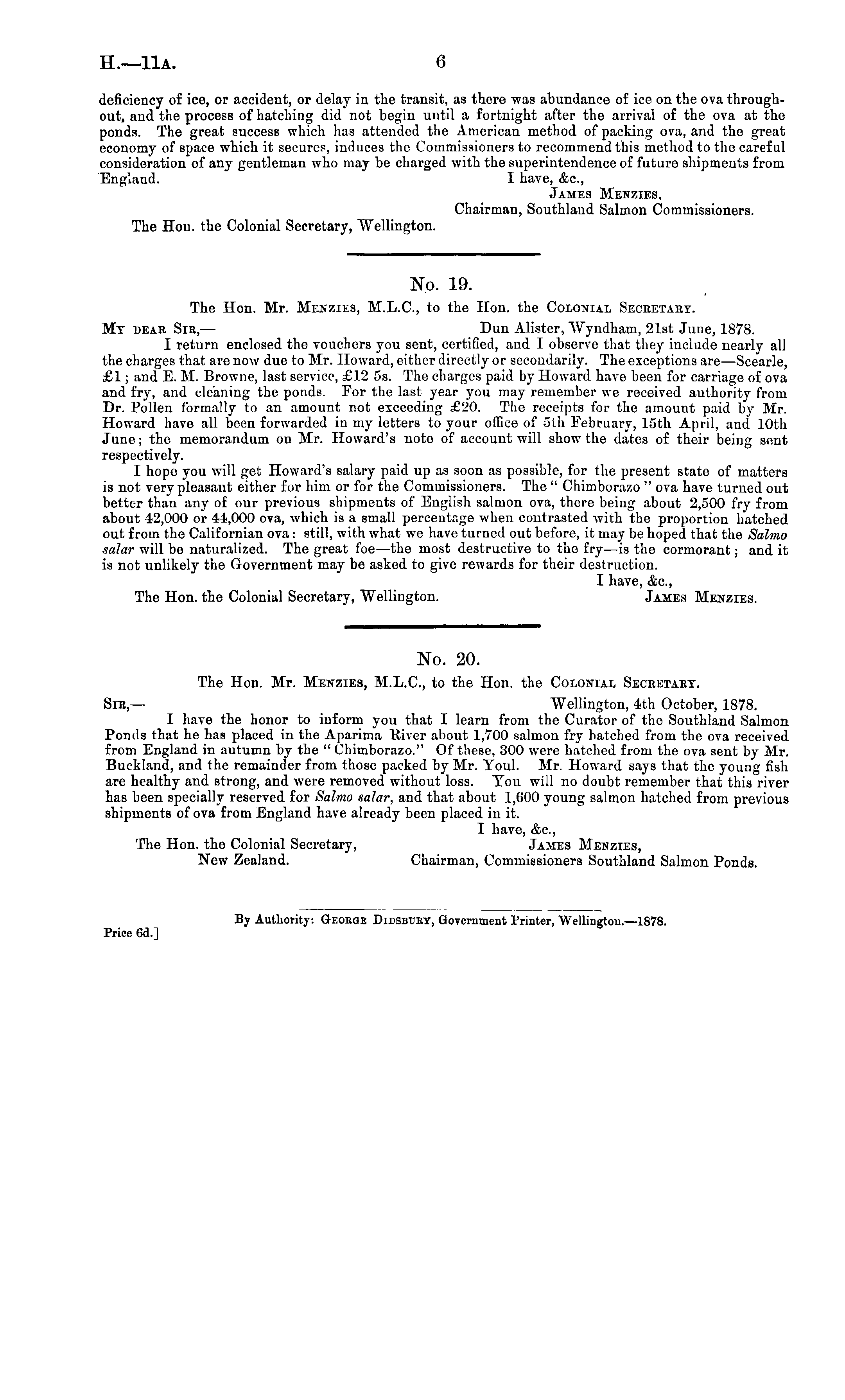 deficiency of ice, or accident, or delay in the transit, as there was abundance of ice on the ova throughout, and the process of hatching did not begin until a fortnight after the arrival of the ova at the ponds. The great success which has attended the American method of packing ova, and the great economy of space which it secures, induces the Commissioners to recommend this method to the careful consideration of any gentleman who may be charged with the superintendence of future shipments from England. I have, &c., James Menzies, Chairman, Southland Salmon Commissioners. The Hon. the Colonial Secretary, Wellington.