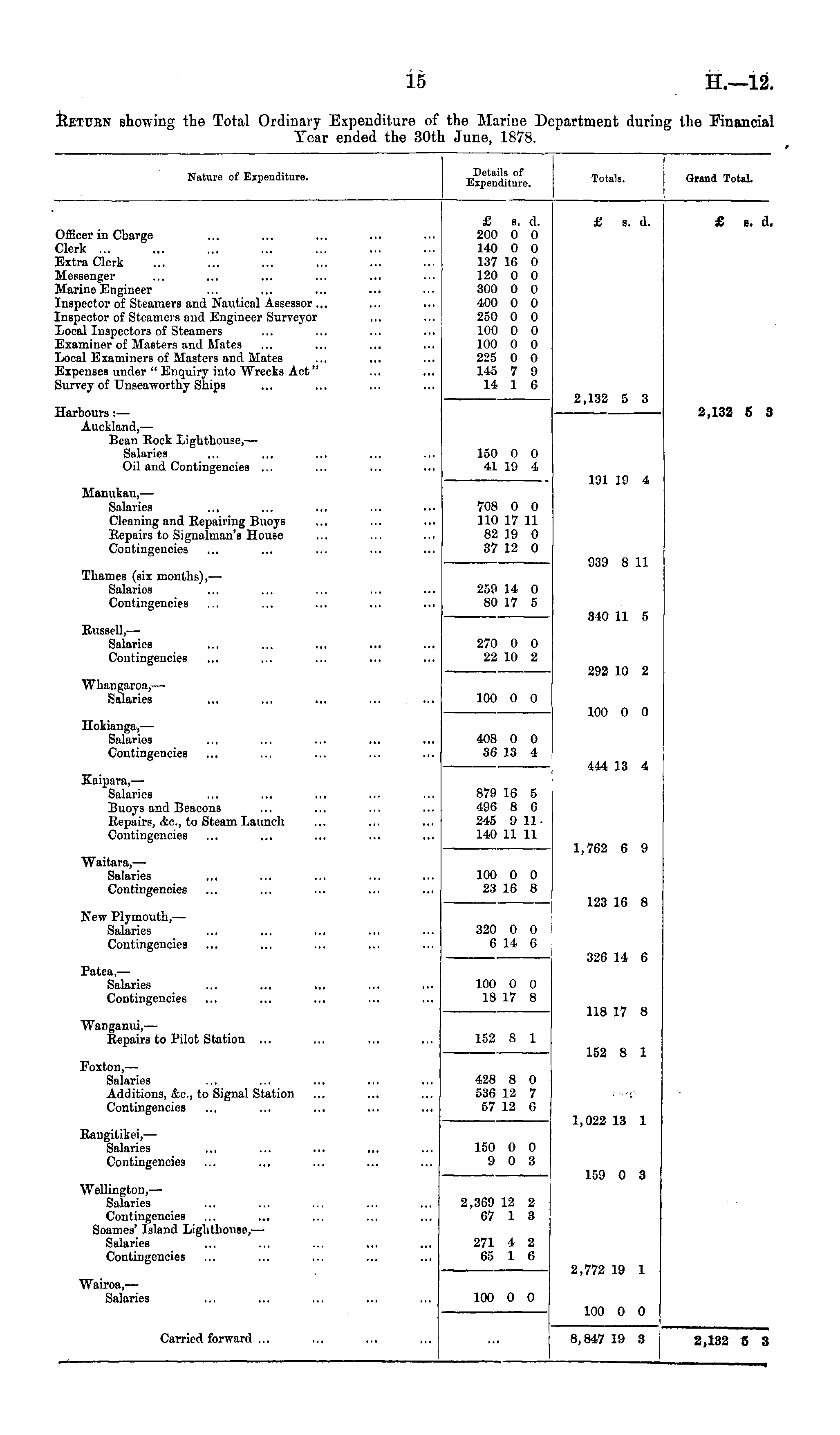 Naturo of Expenditure. Details of Expenditure. Totals. Grand Total. £ s. d. 200 0 0 140 0 0 137 16 0 120 0 0 300 0 0 400 0 0 250 0 0 100 0 0 100 0 0 225 0 0 145 7 9 14 1 6 £ s. d. £ s. d, Dfficer in Charge :ierk Extra Clerk Hessenger Marine Engineer [nspector of Steamers and Nautical Assessor ... inspector of Steamers and Engineer Surveyor Local Inspectors of Steamers Examiner of Masters and Mates Local Examiners of Masters and Mates Expenses under " Enquiry into Wrecks Act" Survey of Unseaworthy Ships 2,132 5 3 larbours : — Auckland, —■ Bean Rock Lighthouse, — Salaries Oil and Contingencies ... 2,132 5 150 0 0 41 19 4 Manukau, — Salaries Cleaning and Repairing Buoys Repairs to Signalman's House Contingencies 191 19 4 708 0 0 110 17 11 82 19 0 37 12 0 939 8 11 Thames (six months), — Salaries Contingencies 259 14 0 80 17 5 340 11 5 Russell, —■ Salaries Contingencies 270 0 0 22 10 2 292 10 2 Whangaroa,—• Salaries ,,. 100 0 0 100 0 0 Hokianga,— Salaries Contingencies 408 0 0 36 13 4 444 13 4 Kaipara,— Salaries Buoys and Beacons Repairs, &c, to Steam Launch Contingencies 879 16 5 496 8 6 245 9 11. 140 11 11 1,762 6 9 Waitara, — Salaries ... Contingencies 100 0 0 23 16 8 123 16 8 New Plymouth,— Salaries Contingencies 320 0 0 6 14 G 326 14 6 Patea, — Salaries Contingencies 100 0 0 18 17 8 118 17 8 Wanganui,— Repairs to Pilot Station ... 152 8 1 152 8 1 Foxton, — Salaries Additions, &c, to Signal Station Contingencies 428 8 0 536 12 7 57 12 6 , Rangitikei, — Salaries Contingencies 1,022 13 1 150 0 0 9 0 3 159 0 3 Wellington, — Salaries Contingencies ... ... Soamcs' Island Lighthouse,— Salaries Contingencies 2,369 12 2 67 1 3 2,772 19 1 271 4 2 65 1 6 Wairoa, — Salaries 100 0 0 100 0 0 Carried forward ... 8,847 19 3 2,132 5 3