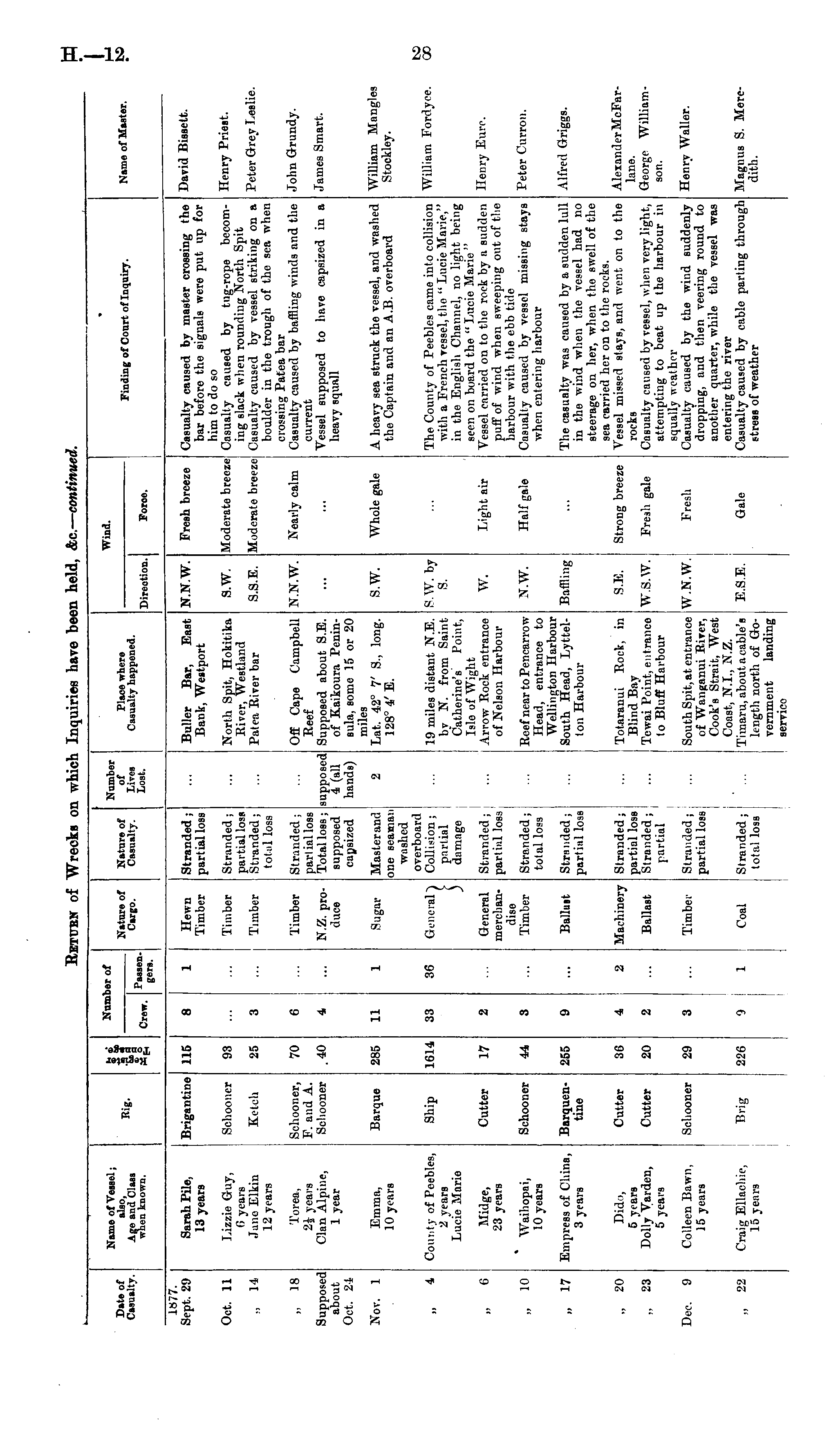 iETTJHN o: reel b on wl iicl quiries iave ieen c.— com 'muet Date of Casualty. Name of Vessel; also, Age and ClaBS when known. Rig. Number of I Nature of Cargo. Nature of Casualty. Number of Lives Lost. Place where Casualty happened. Wind. Finding of Court of Inquiry. Name of Master. c PassenCr6W- gers. Direction. Force. 1877. Sept. 29 Sarah Pile, 13 years Brigantine 115 8 Hewn Timber Stranded ; partial loss Buller Bar, East I Bank, Westport N.N.W. Fresh breeze Casualty caused by master crossing the bar before the signals were put up for him to do so Casualty caused by tug-rope becoming slack when rounding North Spit Casualty caused by vessel striking on a boulder in the trough of the sea wdien crossing Patea bar Casualty caused by baflling winds and the current Vessel supposed to have capsized in a heavy Bquall David Bissett. Oct. 11 Lizzie Guy, 6 years Jane Elkin 12 years Schooner 93 Timber Stranded ; partial loss Stranded; total loss North Spit, Hokitika River, Westland Patea River bar S.W. Moderate breeze Henry Priest. .-, 14 Ketch 25 3 Timber ... S.S.E. Moderate breezej Peter Grey Leslie. » 18 Torea, 2J years Clan Alpine, 1 year Schooner, F. and A. Schooner 70 6 Timber Stranded ; pari ial loss Total loss; supposed capsized Masterand one seaman washed overboard Collision ; partial damage Stranded ; partial loss si mppose 4 (all hands) 2 Off Cape Campbell Reef ed Supposed about S.E. of Kaikoura Penin- ) eula, some 15 or 20 miles Lat. 42° 7' S., long. 128° 4' E. 19 miles distant N.E. by N. from Saint Catherine's Point, Isle of Wight Arrow Rock entrance of Nelson Harbour N.N.W. Nearly calm John Grundy. Supposed about Oct. 24 .40 4 N.Z. produce supposed 4 (all hands) James Smart. Nov. 1 Emma, 10 years Barque 285 11 Sugar 2 S.W. Whole gale A heavy sea struck the vessel, and washed the Captain and an A.B. overboard William Mangles Stockley. 4 County of Peebles, 2 years Lucie Marie Ship 1614 33 30 General^ 3 S.W. by S. The County of Peebles came into collision with a French vessel, the " Lucie Marie," in the English Channel, no light being seen on board the " Lucie Marie " Vessel carried on to the rock by a sudden puff of wind when sweeping out of the harbour with the ebb tide Casually caused by vessel missing stays when entering harbour William Fordyee. Midge, 23 years Cutter 17 General merchandise Timber w. Light air Henry Eure. M 6 2 it 10 Waihopai, 10 years Schooner 44 3 Stranded ; total loss Stranded ; partial loss Reef near to Penearrow Head, entrance to Wellington Harbour South Head, Lyttelton Harbour N.W. Half gale Peter Cuvron. jj 17 Empress of China, 3 years Barquentine 255 9 Ballust Baflling The casualty was caused by a sudden lull in the wind when the vessel had no steerage on her, when the swell of the sea carried her on to the rocks. Vessel missed stays, and went on to the rocks Casualty caused by vessel, when very light, attempting to beat up the harbour in squally weather Casualty caused by the wind suddenly dropping, and then veering round to another quarter, while the vessel was entering the river Casualty caused by cable parting through stress of weather Alfred Griggs. Dido, 5 years Dolly Varden, 5 years Cutter Machinery Stranded ; partial loss Stranded ; partial Totaranui Rock, in i Blind Bay Tewai Point, entrance ) to Bluff Harbour S.E. Strong breeze Alexander McFarlane. George Williamson. 20 ISO I 2 23 Cutter 20 2 BallaBt W.S.W. Fresh gale >ee. 9 Colleen Bawn. 15 years Schooner 2'J 3 Timber Stranded ; partial loss Stranded ; total loss South Spit, at entrance of Wanganui Biver, Cook's Strait, West Coast, N.I., N.Z. Timaru, about a cable's length north of Government landing servico W.N.W. Fresh Henry Waller. Craig Ellachie, 15 years Brig Coal E.S.E. Gale Magnus S. Meredith. 22 226