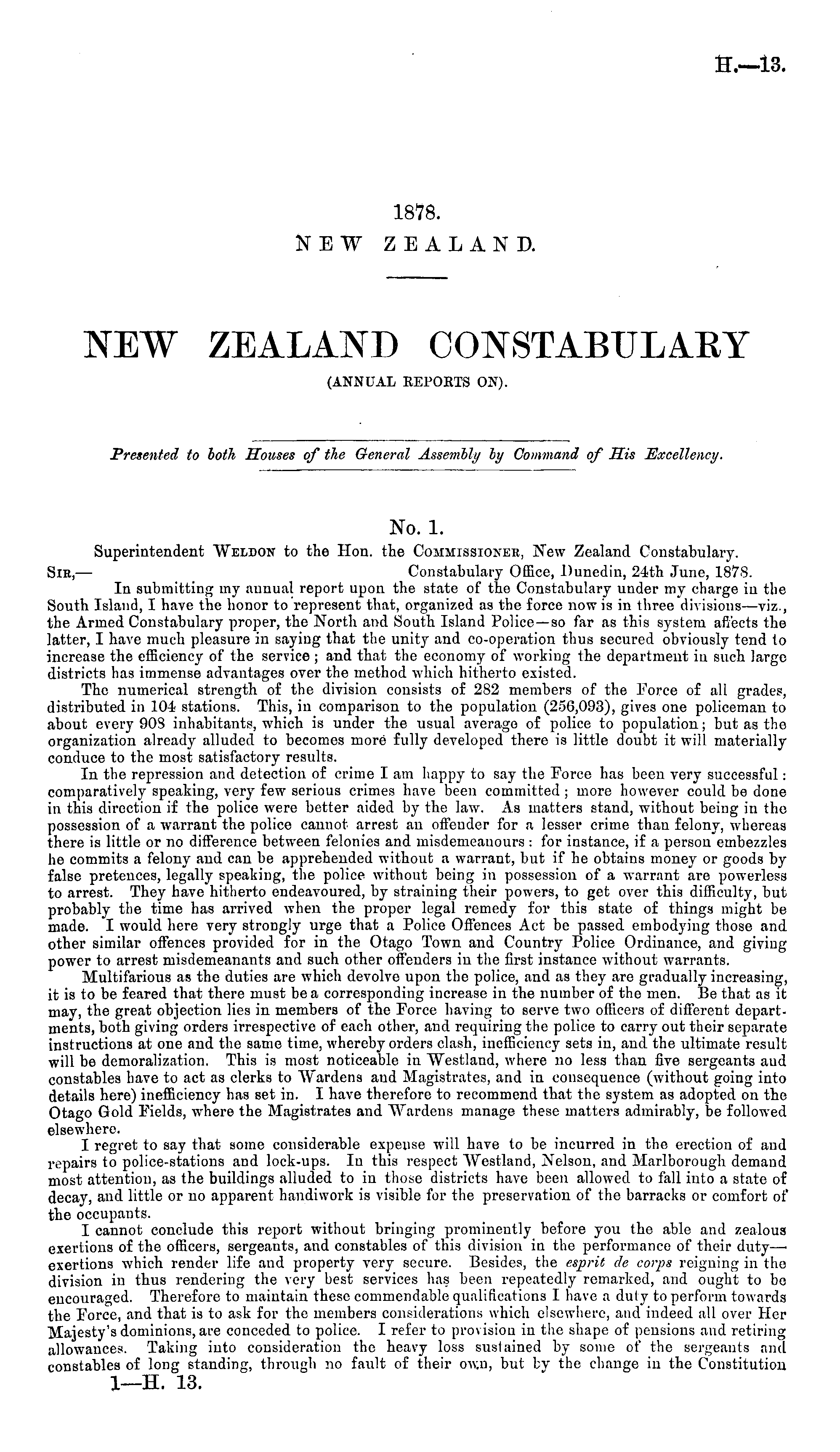 Presented to both Houses of the General Assembly by Command of His Excellency. No. 1. Superintendent Weldon to the Hon. the Commissioner, New Zealand Constabulary. Sic, — Constabulary Office, Dunedin, 24th June, 1878. In submitting my annual report upon the state of the Constabulary under my charge in the South Island, I have the honor to represent that, organized as the force now is in three divisions—viz., the Armed Constabulary proper, the North and South Island Police—so far as this system affects the latter, I have much pleasure in saying that the unity and co-operation thus secured obviously tend to increase the efficiency of the service ; and that the economy of working the department in such large districts has immense advantages over the method which hitherto existed. The numerical strength of the division consists of 282 members of the Force of all grades, distributed in 104 stations. This, in comparison to the population (250,093), gives one policeman to about every 90S inhabitants, which is under the usual average of police to population; but as the organization already alluded to becomes more fully developed there is little doubt it will materially conduce to the most satisfactory results. In the repression and detection of crime I am happy to say the Force has been very successful: comparatively speaking, very few serious crimes have been committed ; more however could be done in this direction if the police were better aided by the law. As matters stand, without being in the possession of a warrant the police cannot arrest an offender for a lesser crime than felony, whereas there is little or no difference between felonies and misdemeanours : for instance, if a person embezzles he commits a felony aud can be apprehended without a warrant, but if he obtains money or goods by false pretences, legally speaking, the police without being in possession of a warrant are powerless to arrest. They have hitherto endeavoured, by straining their powers, to get over this difficulty, but probably the time has arrived when the proper legal remedy for this state of things might be made. I would here very strongly urge that a Police Offences Act be passed embodying those and other similar offences provided for in the Otago Town and Country Police Ordinance, and giving power to arrest misdemeanants and such other offenders in the first instance without warrants. Multifarious as the duties are which devolve upon the police, and as they are gradually increasing, it is to be feared that there must be a corresponding increase in the number of the men. Be that as it may, the great objection lies in members of the Force having to serve two officers of different departments, both giving orders irrespective of each other, and requiring the police to carry out their separate instructions at one and the same time, whereby orders clash, inefficiency sets in, and the ultimate result will be demoralization. This is most noticeable in "Westland, where no less than five sergeants aud constables have to act as clerks to Wardens aud Magistrates, and iv consequeuce (without going into details here) inefficiency has set in. I have therefore to recommend that the system as adopted on the Otago Gold Fields, where the Magistrates and Wardens manage these matters admirably, be followed elsewhere. I regret to say that some considerable expense will have to be incurred in the erection of and repairs to police-stations and lock-ups. Iv this respect "Westland, Nelson, and Marlborough demand most attention, as the buildings alluded to in those districts have been allowed to fall into a state of decay, and little or no apparent handiwork is visible for the preservation of the barracks or comfort of the occupants. I cannot conclude this report without bringing prominently before you the able and zealous exertions of the officers, sergeants, and constables of this division in the performance of their duty— exertions which render life and property very secure. Besides, the esprit de corps reigning in the division iv thus rendering the very best services has been repeatedly remarked, and ought to bo encouraged. Therefore to maintain these commendable qualifications I have a duty to perform towards the Force, and that is to ask for the members considerations which elsewhere, and indeed all over Her Majesty's dominions, are conceded to police. I refer to provision in tho shape of pensions and retiring allowances. Taking into consideration the heavy loss sustained by some of the sergeants and constables of long standing, through no fault of their ow.u, but by the change in the Constitution I—H. 13.