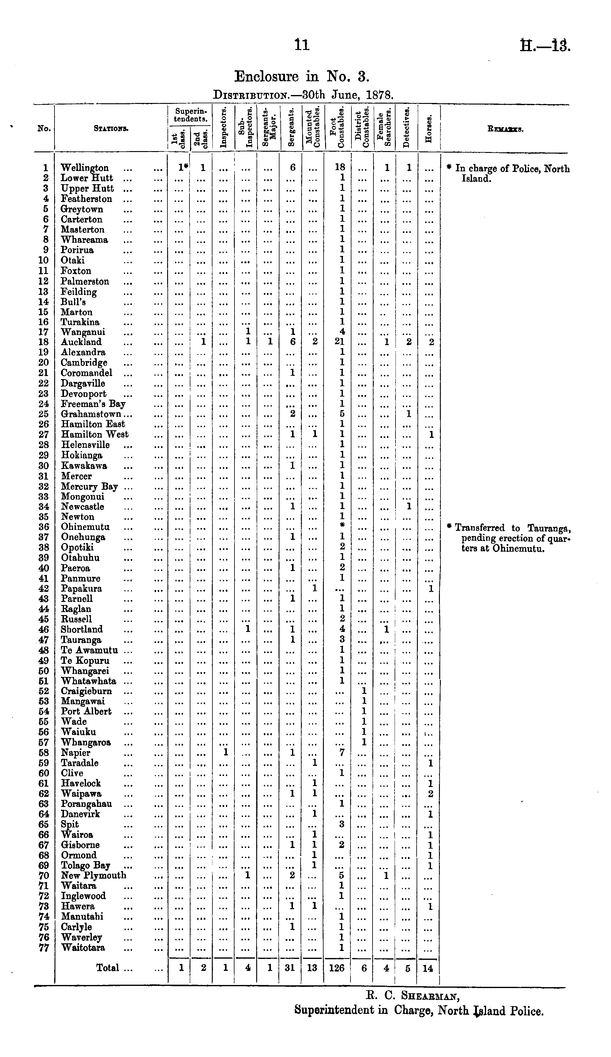 No. Stations. ; Superin- ! tendents. E c g a C M q fti^ CD 2 o o Q CO o > I ft I ■r. 5 w Remakes. 1 2 3 4 5 G 7 8 9 10 11 12 13 14 15 lfi 17 IS 19 20 21 22 23 21 25 20 27 28 29 30 31 32 33 34 35 30 37 ■IS 30 40 11 12 43 M 15 40 47 4S 49 50 51 52 53 54 55 50 57 58 59 60 61 02 63 64 65 00 67 68 69 70 71 72 73 74 75 76 77 Wellington Lower Hutt ... Upper Hutt ... Featherston Grey town Carterton Masterton Whareama Porirua Otaki Foxton Palmerston Feilding Bull's Marton Turakina Wanganui Auckland Alexandra Cambridge Coromandel Dargaville Devon port Freeman's Bay Grahamstown... Hamilton East Hamilton West Helensville Hokianga Kawakawa Mercer Mercury Bay ... Mongonui Newcastle Newton Ohinemutu Onehunga Opotiki Otahuhu Paeroa Panmure Papaknra Parnell Raglan Russell Shortland Tauranga Te Awamutu ... Te Kopuru Whangarei Whatawhata ... Craigieburn Mangawai Port Albert ... Wade Waiuku Whangaroa Napier Taradale Clive Havelock Waipawa Porangahau Danevirk Spit Wairoa Gisborne Orniond Tolago Bay New Plymouth Waitara Inglewood Hawera Manutahi Carlyle Waverley Waitotara 1* ... 1 ... I 1 i ! *" i 1 i 6 "i 6 i "2 i "i "i i "i 2 i 18 1 1 1 1 1 1 1 1 1 1 1 1 1 1 1 4 21 1 1 1 1 1 1 5 1 1 1 1 1 1 1 1 1 1 * 1 2 1 2 1 1 i 1 I ••■ 2 i i 2 i * In charge of Police, North Island. * Transferred to Tauranga, pending erection of quarters at Ohinemutu. i i 1 1 2 4 3 1 1 1 1 "i i i 1 .„ i ... 1 1 1 1 1 1 1 "i 1 "7 i 1 ... . l "• i i i 1 ... j ... i I ... i - i 2 1 i 1 1 ... 3 1 i 1 1 1 1 2 ... 1 1 ... 1 1 1 1 i 2 5 1 1 i i "i 1 1 1 1 1 "i Total ... 1 2 1 4 1 31 13 126 6 4 5 14