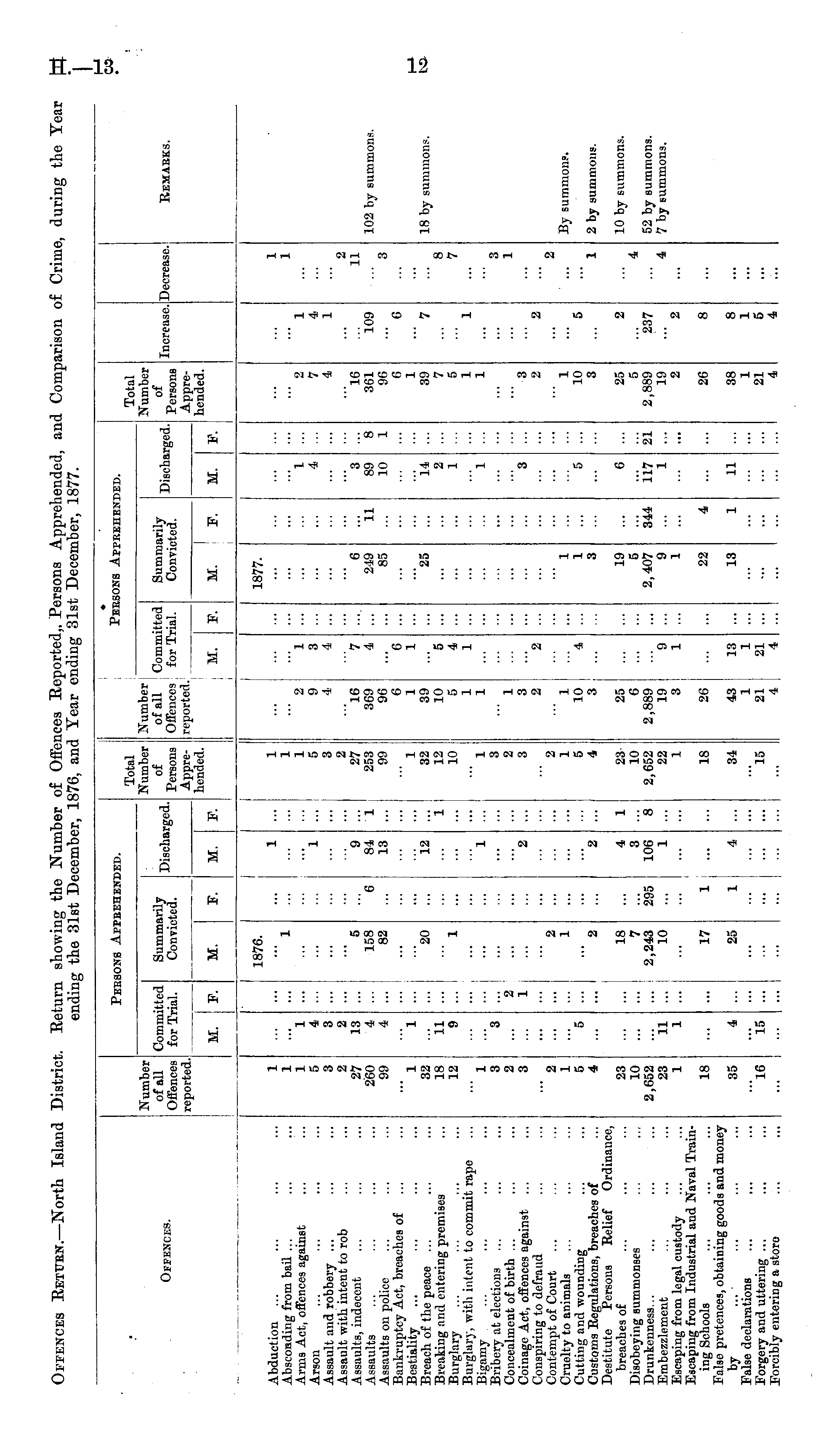 ♦ Persons Apprehended. Persons Appbeuended. A JSiU Number of all Offences reported. Total Number of Number of all Committed Offences for Trial, reported. M. F. Total Number of Offences. Committed for Trial. Summarily Convicted. Discharged. Summarily Convicted. Discharged. Increase. Decrease.' Remarks . Persons ApprePersons Apprehended. I hended. M. F. M. F. M. F. M. P. M. F. 1870. 1877. Abduction Absconding from bail ... Arms Act, offences against Arson Assault and robbery ... Assault with intent to rob Assaults, indecent Assaults Assaults on police Bankruptcy Act, breaches of Bestiality Breach of tho peace ... Breaking and entering premises Burglary Burglary, with intent to commit rape Bigamy Bribery at elections Concealment of birth ... Coinage Act, offences against Conspiring to defraud Contempt of Court Cruelty to animals Cutting and wounding Customs Regulations, breaches of Destitute Persons Relief Ordinance, breaches of Disobeying summonses Drunkenness... Embezzlement Escaping from legal custody Escaping from Industrial and Naval Training Schools False pretences, obtaining goods and money by ... False declarations Forgery and uttering ... Eorcibly entering a storo 1 1 1 5 3 2 27 260 99 1 32 18 12 1 3 2 3 1 4 3 2 13 4 4 1 11 9 3 "a 1 1 5 158 82 "20 1 "6 1 "l 9 84 13 12 1 "2 i i 1 1 1 5 3 2 27 253 99 1 32 12 10 1 3 2 3 2 9 4 16 309 96 6 1 39 10 5 1 1 1 3 2 1 3 4 "7 4 "e 1 5 4 1 2 6 249 85 "25 "il 1 4 3 89 10 14 2 1 1 3 8 1 2 7 4 16 361 96 0 1 39 7 5 1 1 3 2 1 4 1 109 0 7 1 1 1 2 11 3 8 7 1 102 by summons. 18 by summons. By summons. 2 2 1 5 4 2 1 2 1 5 4 2 "5 "2 1 10 3 "4 1 1 3 "5 1 10 3 5 2 by summons. 2 1 23 10 2,652 23 1 18 7 2,243 10 4 3 106 1 1 23 10 2,652 22 1 25 2,889 19 3 19 2,407 9 1 6 25 5 2,889 19 2 2 10 by summons. 295 "8 344 117 1 21 237 4 52 by summons. 7 by summons. 11 1 9 1 2 4 18 17 1 18 26 22 4 26 8 35 4 25 1 4 34 43 1 21 4 13 1 21 4 13 1 11 38 1 21 4 8 1 5 4 "l6 "is "l5