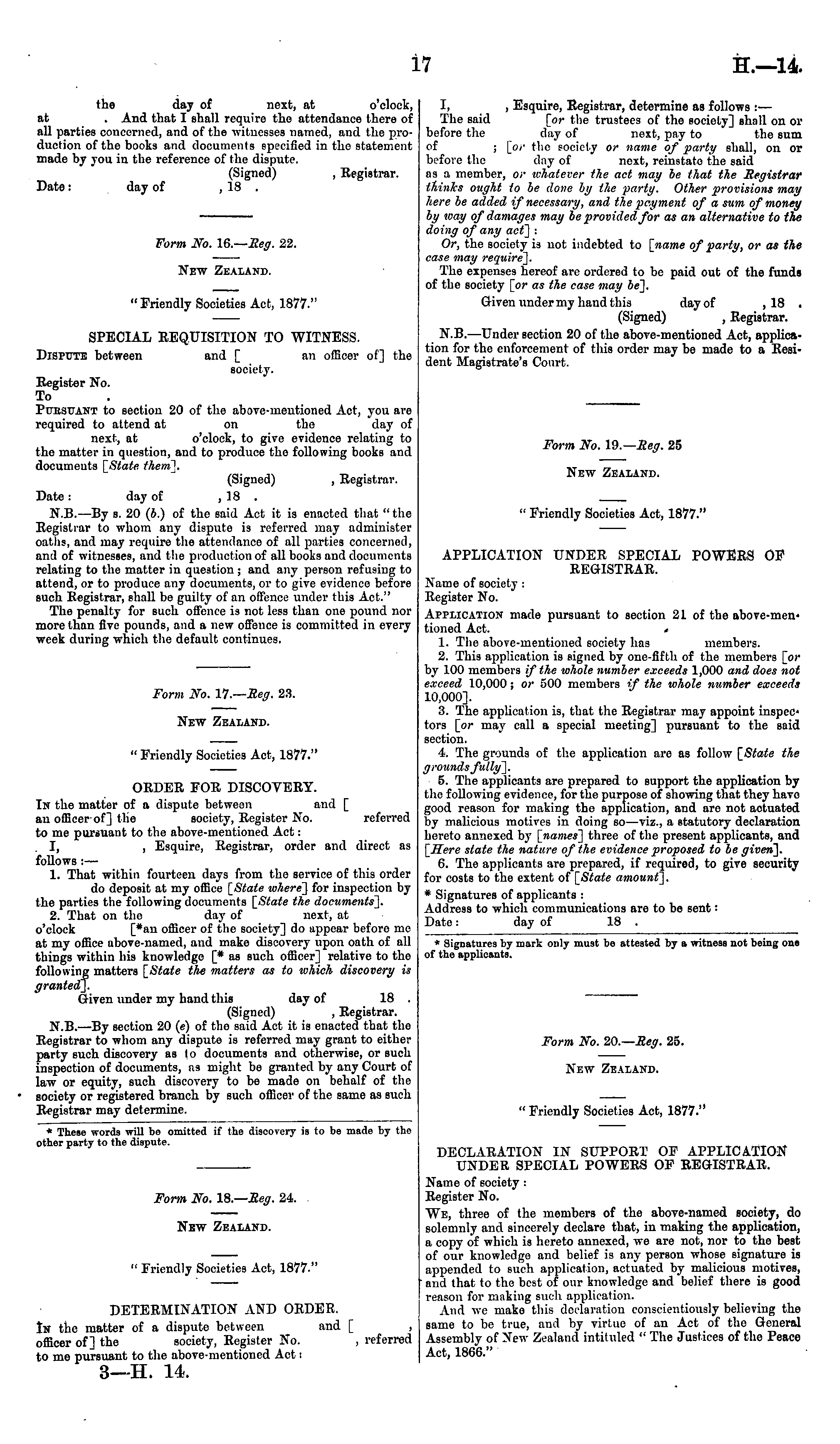the day of next, at o'clock, I, , Esquire, Registrar, determine a 9 follows : — at . And that I shall require the attendance there of The said [or the trustees of the society] shall on or nil parties concerned, and of the witnesses named, and the pro- before the day of next, pay to the sum duction of the books and documents specified in the statement of ; [or the society or name of party shall, on or made by you in the reference of the dispute. before the clay of next, reinstato the said (Signed) , Registrar. Os a member, or whatever the act may be that the Registrar Date: day of ,18 . thinks ought to be done by the party. Other provisions may here be added if necessary, and the payment of a sum of money by way of damages may be provided for as an alternative to the doing of any act] : Form No. 16. — Reg. 22. Or, the society is not indebted to [name of party, or as the - ■ case may require}. New Zealand. The expenses hereof are ordered to be paid out of the funds of the society [or as the case may be], " Friendly Societies Act, 1877." Given under my hand this day of ,18 . (Signed) , Eegistrar. SPECIAL REQUISITION TO WITNESS N.B.—Under section 20 of the above-mentioned Act, applicaDispute between and [ an officer of] the &iqs-___VoS_! °f tMS ""^ *"* * ""^ *° * society. ° Register No. To . Puesttant to section 20 of the above-mentioned Act, you are required to attend at on the day of next, at o'clock, to give evidence relating to F• /V 1Q 7? 21? the matter in question, and to produce the following books and ' * •*" documents [State them}. _■„„. rj„' , „ (Signed) , Registrar. New Z_land. Date: day of , 18 . N.B.—By b. 20 (b.) of the said Act it is enacted that " the " Friendly Societies Act, 1877." Registrar to whom any dispute is referred may administer oaths, and may require the attendance of all parties concerned, and of witnesses, and the production of all books and documents APPLICATION UNDER SPECIAL POWERS OF relating to the matter in question ; and any person refusing to REGISTRAR. attend, or to produce any documents, or to give evidence before Name of society : such Registrar, shall be guilty of an offence under this Act." Register No. The penalty for such offence is not less than one pound nor Application made pursuant to section 21 of the above-men-more than five pounds, and a new offence is committed in every tioned Act. week during which the default continues. _. The above-mentioned society has members. 2. This application is signed by one-fifth of the members [or by 100 members if the whole number exceeds 1,000 and does not exceed 10,000; or 500 members if the whole number exceeds Form No. 17.-- Reg. 23. 10,000]. 3. The application is, that the Registrar may appoint inspecNew Zealand. * org Yor may call a special meeting] pursuant to the said section. "Friendly Societies Act, 1877." 4- The grounds of the application are as follow [State the grounds fully], ORDER FOR DISCOVERY. ,\ 5 V T. " ?PP lica"t3 «™ Prepared to support the application by . . tfio following evidence, for the purpose oi showing that they have In the matter of a dispute between and L good reason for making the application, and are not actuated an officer-of] the society, Register No. referred by _ ia li.i ou _ motives in doing so—viz., a statutory declaration to me pursuant to the above-mentioned Act: hereto annexed by [names] three of the present applicants, and •I. , Esquire, Registrar, order and direct as v_Sere state the nature of the evidence proposed to be given]. follows : 6. The applicants are prepared, if required, to give security 1. That within fourteen days from tho service of this order for Co3ts to tne exte nt of [State amount], do deposit at my office [State where] for inspection by m -. , r_ t . the parties the following documents [State the documents]. ~P i- i • .- 4 v. i. „ mi _. _i j <. tj. Address to which communications are to be sent: 2. That on the day of next, at ]_) te • day of 18 o'clock [*au officer of the society] do appear before me ' _. '_ . at my office above-named, and make discovery upon oath of all * Signatures by mark only must be attested by a witness not being one things within his knowledge [* as such officer] relative to the of the applicants, following matters [State the matters as to which discovery is granted]. Given under my hand this day of 18 . (Signed) , Registrar. N.B. —By section 20 (c) of the said Act it is enacted that the Registrar to whom any dispute is referred may grant to either Form No. 20.— Reg. 25. party such discovery as to documents and otherwise, or such inspection of documents, us might be granted by any Court of New Zealand. law or equity, such discovery to be made on behalf of the society or registered branch by such officer of the same as such Registrar may determine. « Friendly Societies Act, 1877." * These words will be omitted if the discovery is to be made by the other party to the dispute. * DECLARATION IN SUPPORT OF APPLICATION UNDER SPECIAL POWERS OF REGISTRAR. Name of society : Form No. 18.—Reg. 24. Register No. We, three of the members of the above-named society, do New Zealand. solemnly and sincerely declare that, in making the application, a copy of which is hereto annexed, we are not, nor to the best of our knowledge and belief is any person whose signature is " Friendly Societies Act, 1877." appended to such application, actuated by malicious motives, ' and that to the best of our knowledge and belief there is good reason for making such application. DETERMINATION AND ORDER. And we make this declaration conscientiously believing tho In the matter of a dispute between and [ , same to be true, and by virtue of an Act of the General officer of] the society, Register No. , referred Assembly of New Zealand intituled " The Justices of the Peace to me pursuant to the above-mentioned Act: Act, 1866. 3—II. 14.