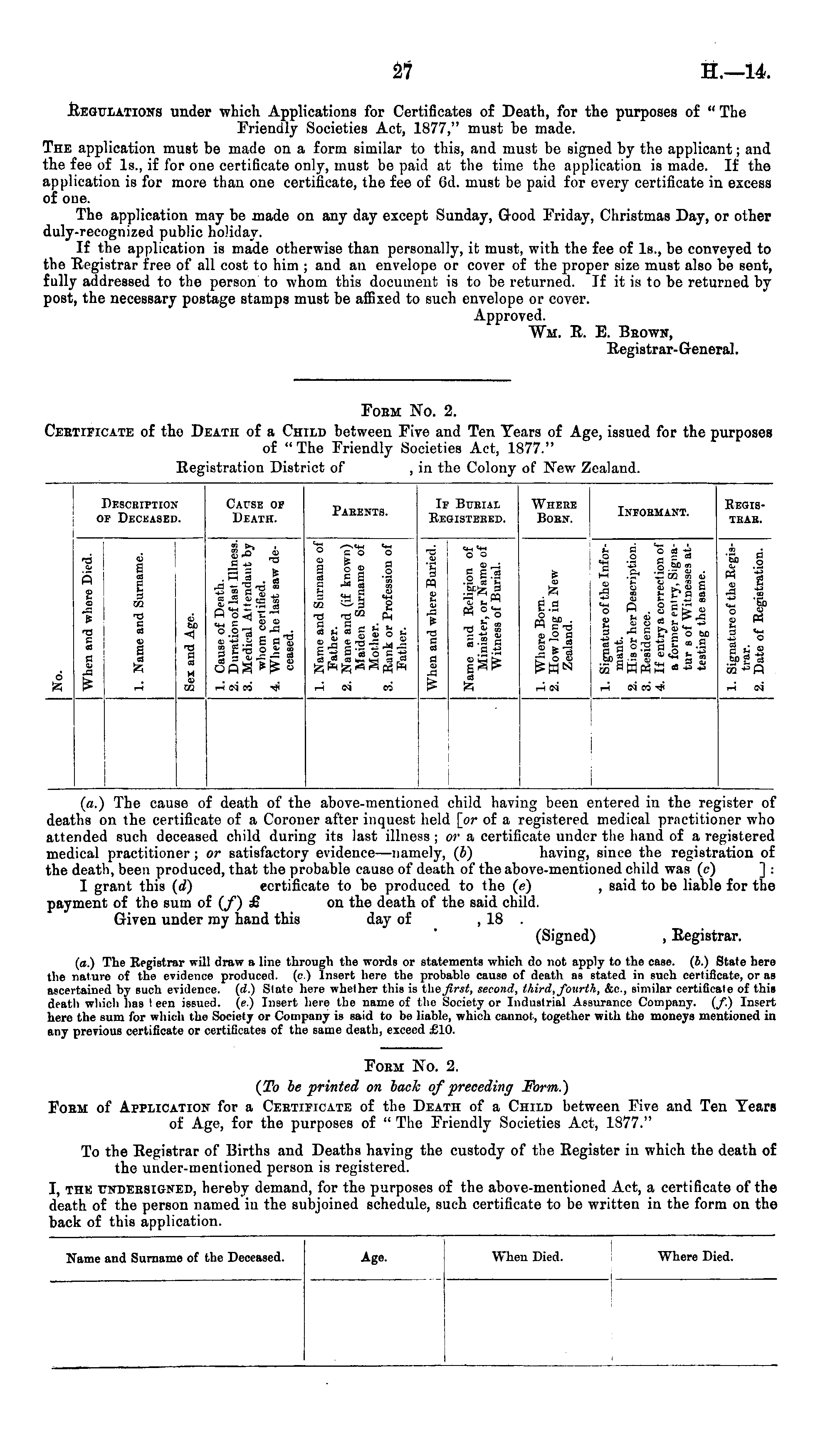 Eeguxations under which Applications for Certificates of Death, for the purposes of " The Friendly Societies Act, 1877," must be made. The application must be made on a form similar to this, and must be signed by the applicant; and tho fee of Is., if for one certificate only, must be paid at the time the application is made. If the application is for more than one certificate, the fee of Gd. must be paid for every certificate in excess of one. The application may be made on any day except Sunday, Good Friday, Christmas Day, or other duly-recognized public holiday. If the application is made otherwise than personally, it must, with the fee of Is., be conveyed to the Eegistrar free of all cost to him ; and an envelope or cover of the proper size must also be sent, fully addressed to the person to whom this document is to be returned. If it is to be returned by post, the necessary postage stamps must be affixed to such envelope or cover. Approved. "Wm. E, E. Brown, Eegistrar- General.
